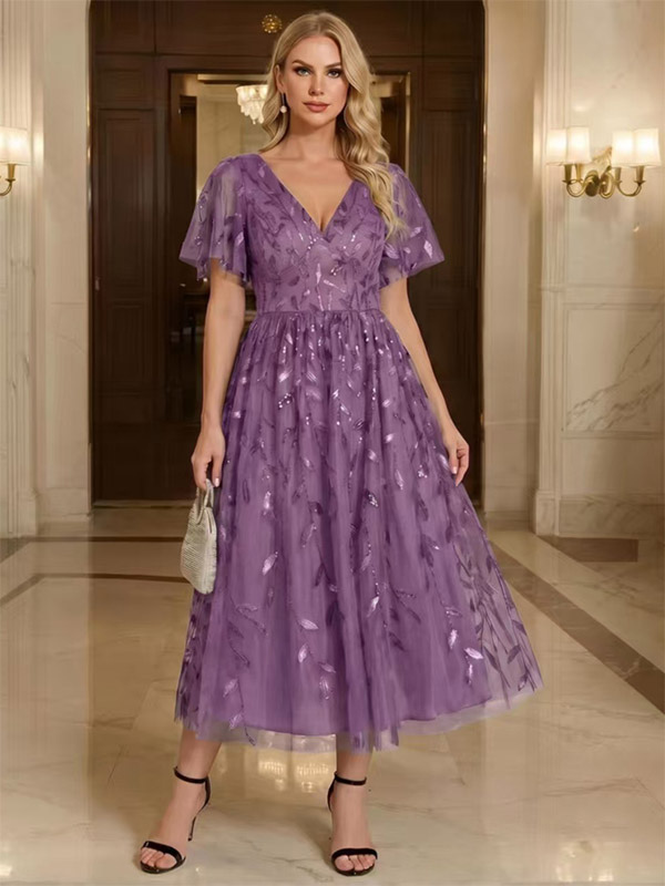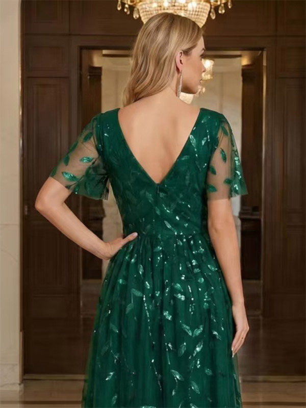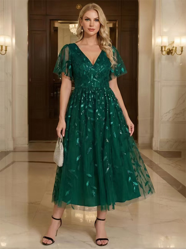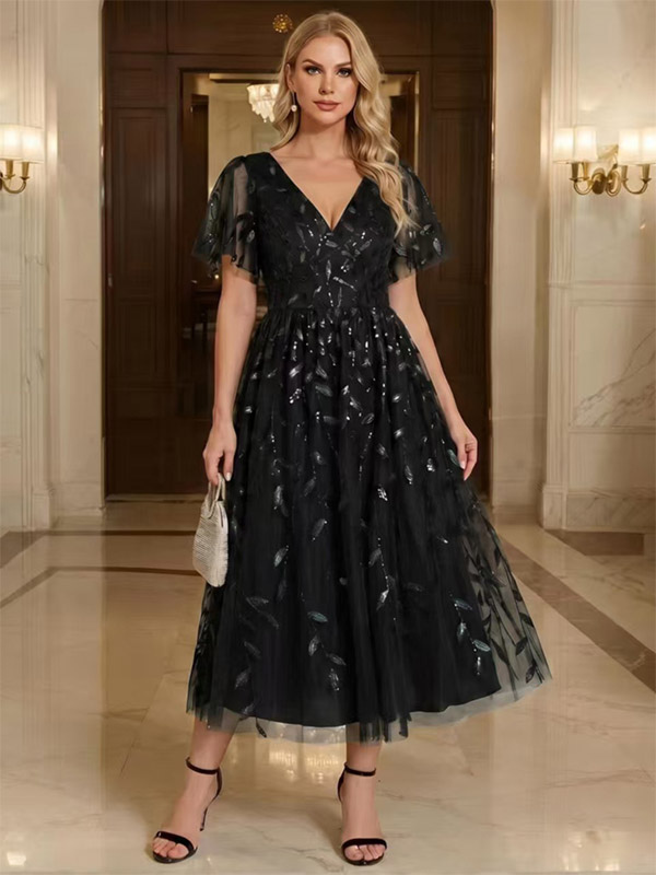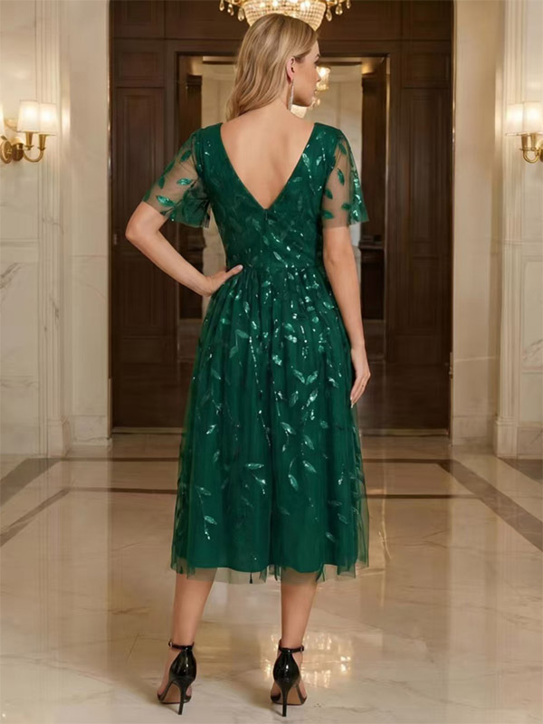 イブニングドレス、ショート丈、Vネック、ティーレングス、半袖、ジッパー、スパンコール、スパンコール装飾、社交界向けページェントドレス