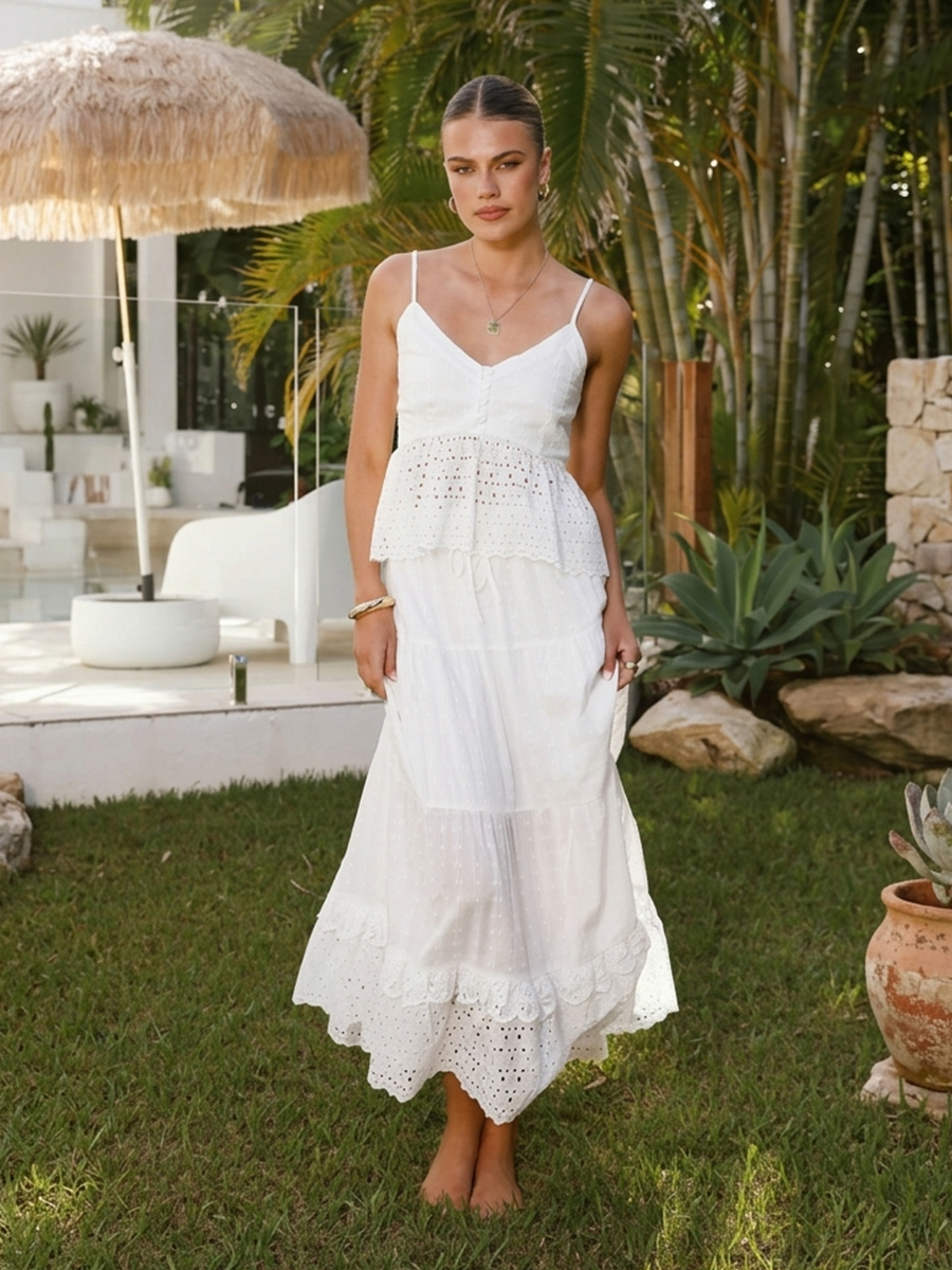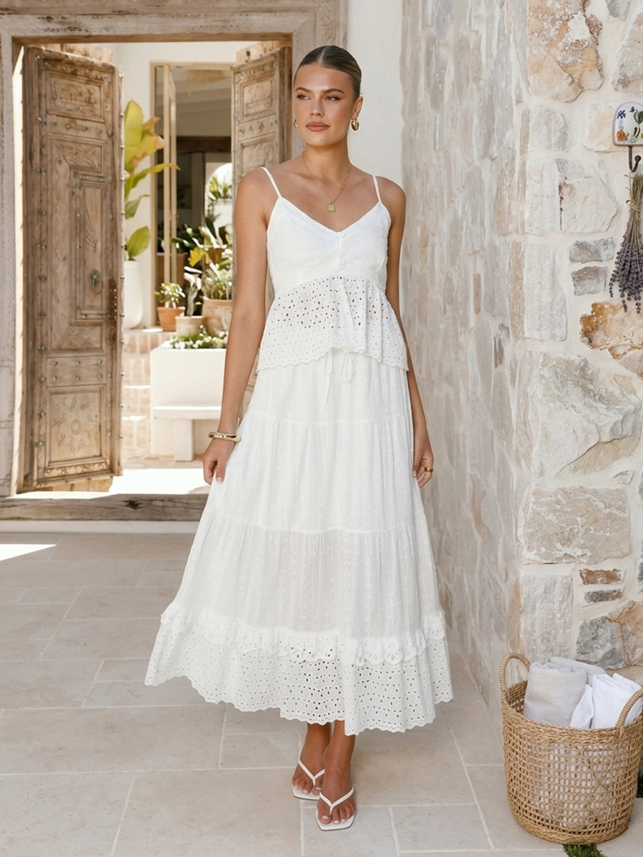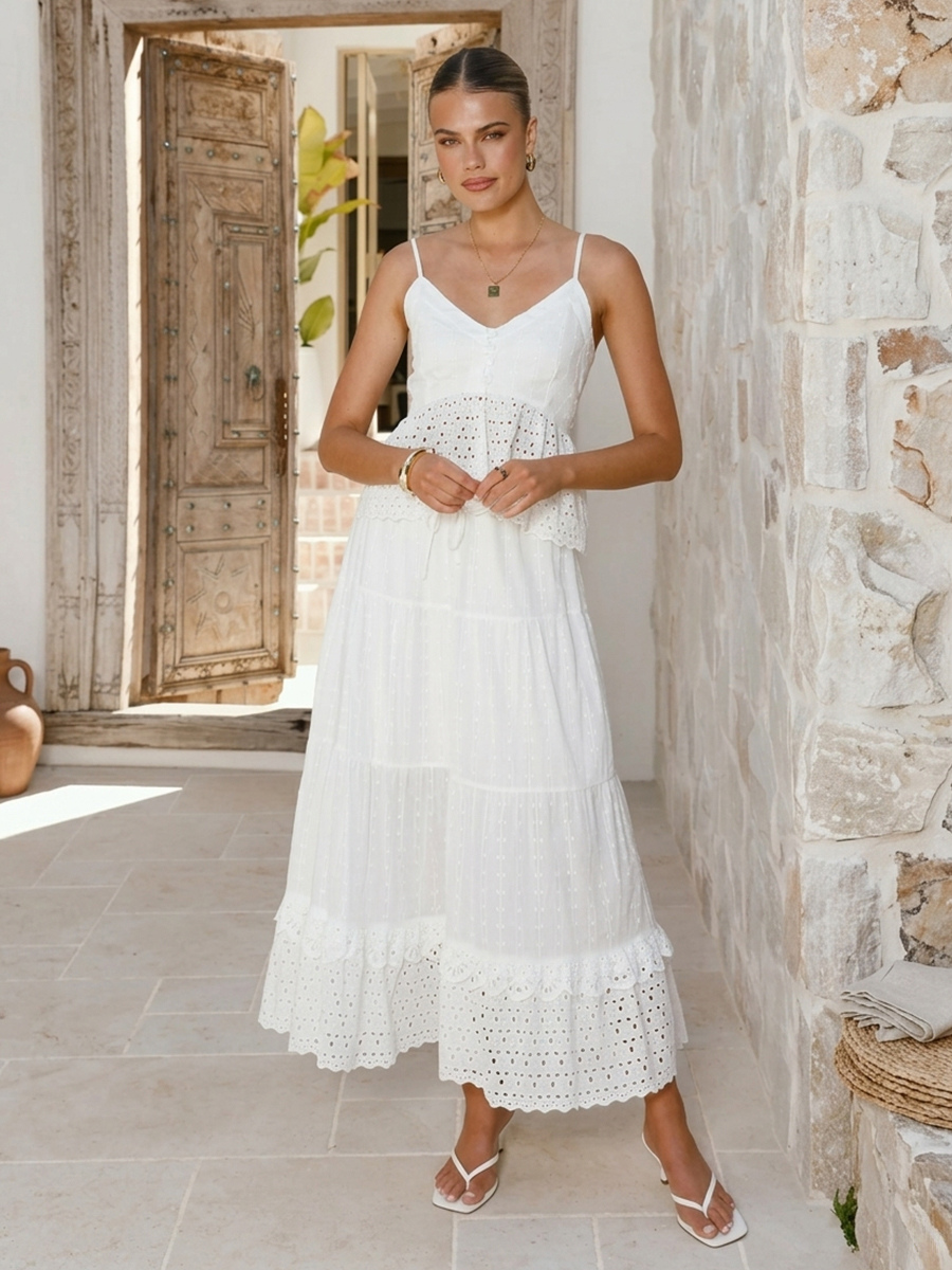 アイレットコットンツーピースセット(レディース) - ホワイトボヘミアンキャミソールとティアードマキシスカート - サマービーチパーティー2026