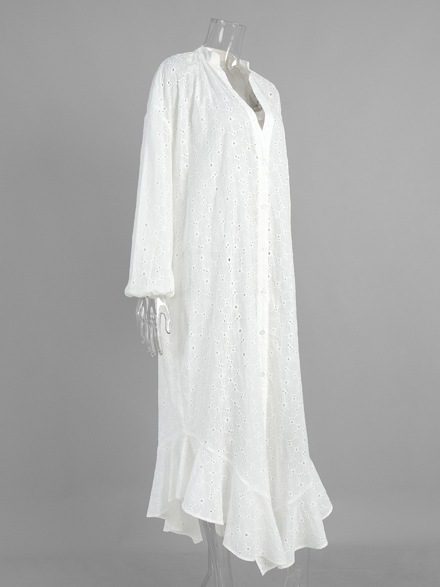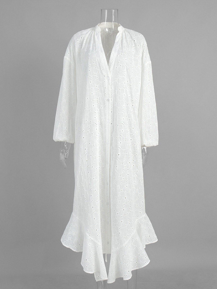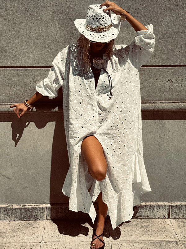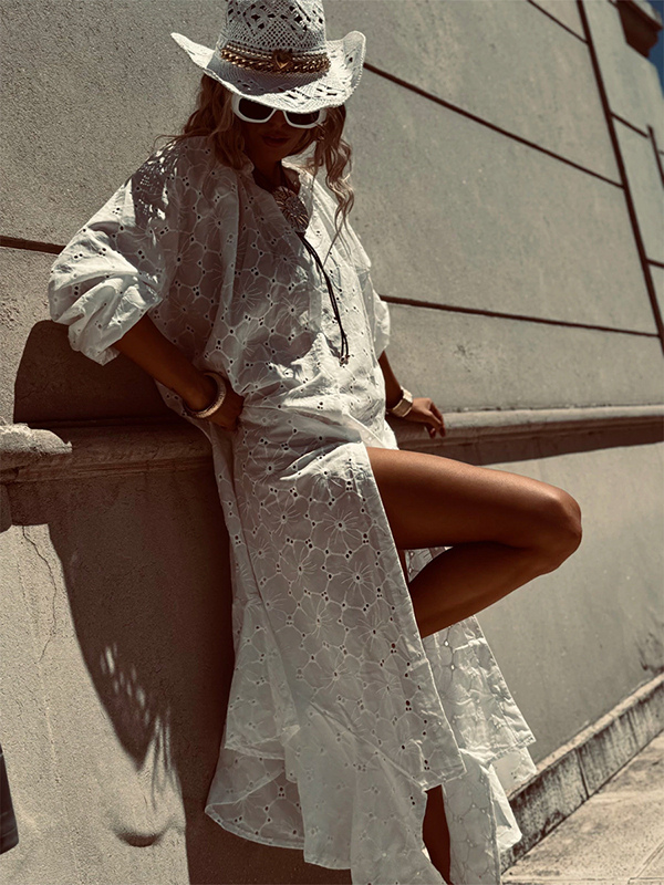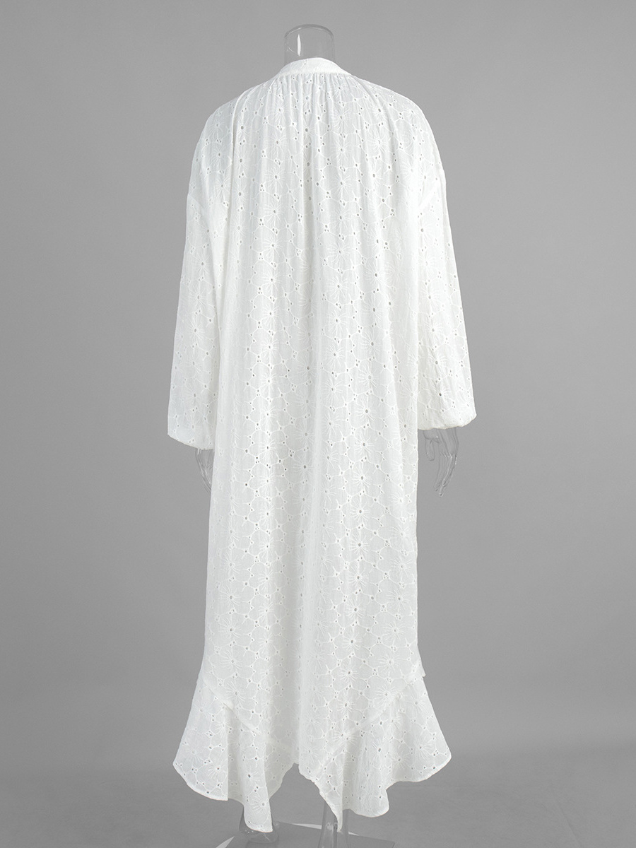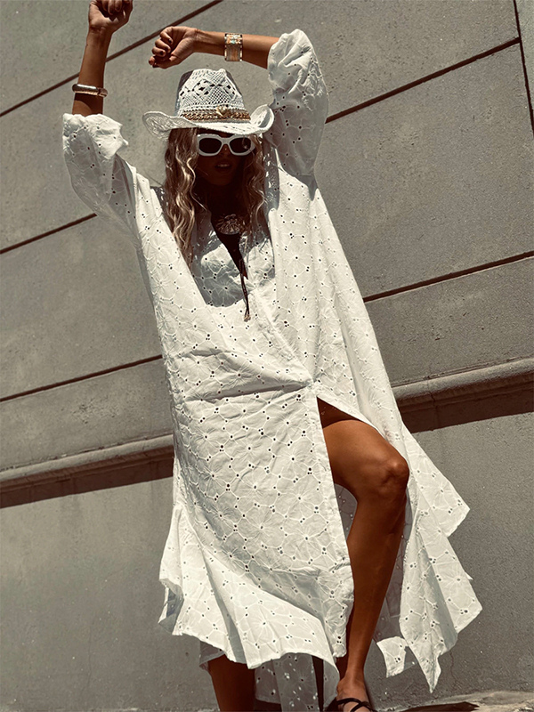 アイレット刺繍マキシドレス(レディース) - ホワイト ボヘミアン Vネック オーバーサイズ フリル裾 カフタン - 2026年夏ビーチバケーション
