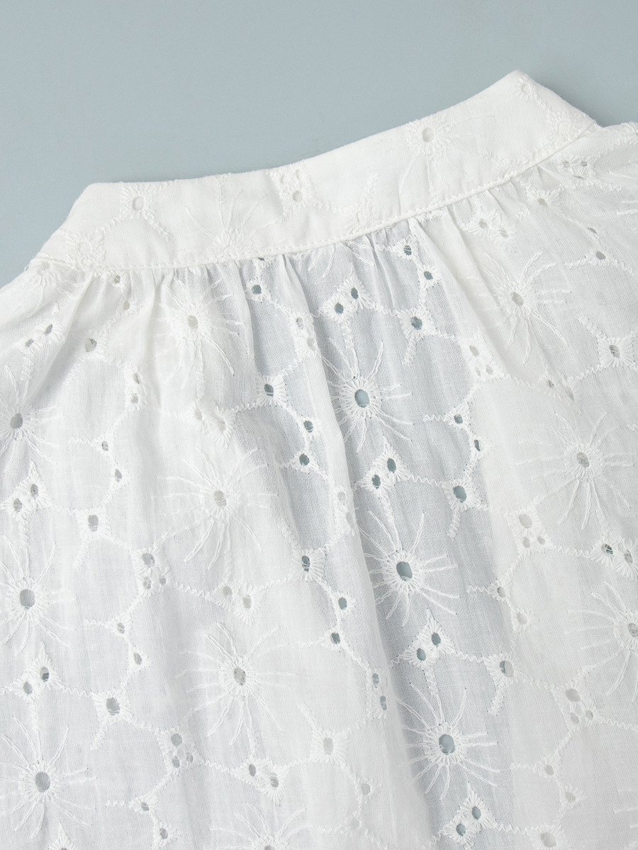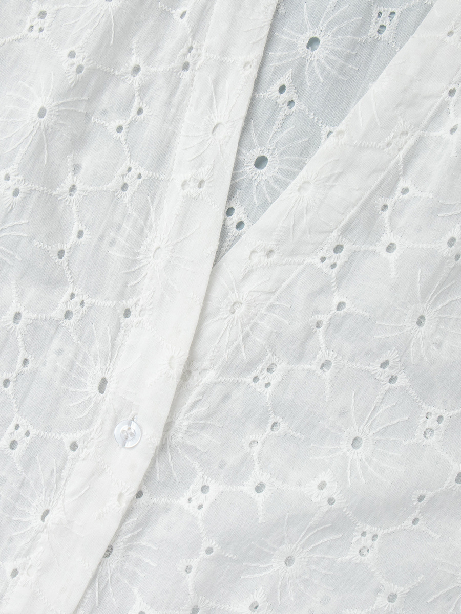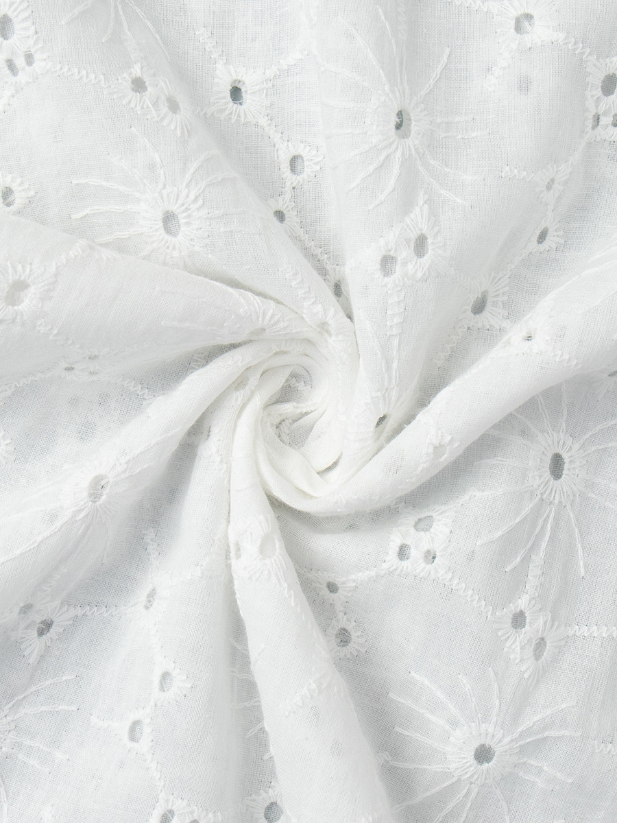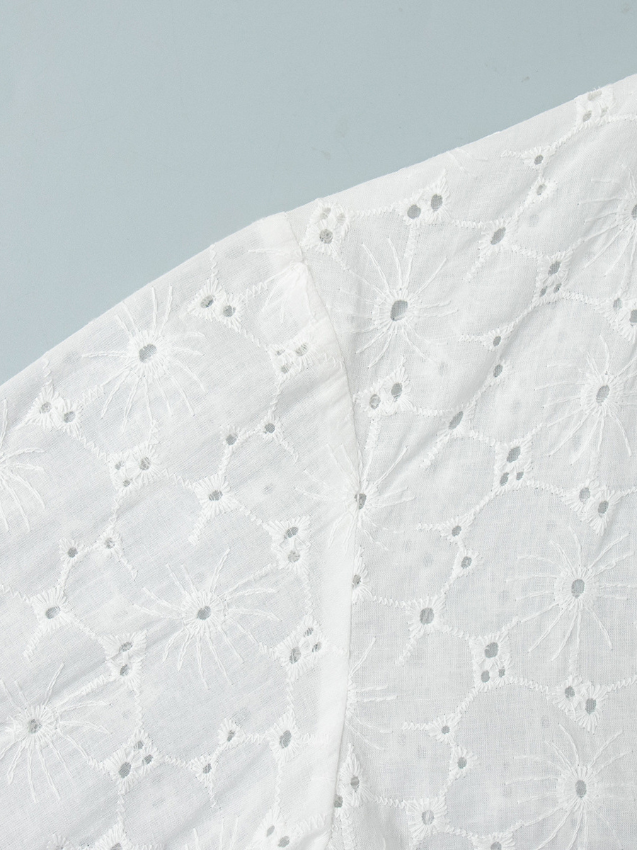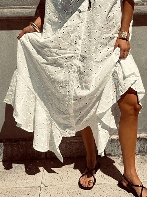 アイレット刺繍マキシドレス(レディース) - ホワイト ボヘミアン Vネック オーバーサイズ フリル裾 カフタン - 2026年夏ビーチバケーション