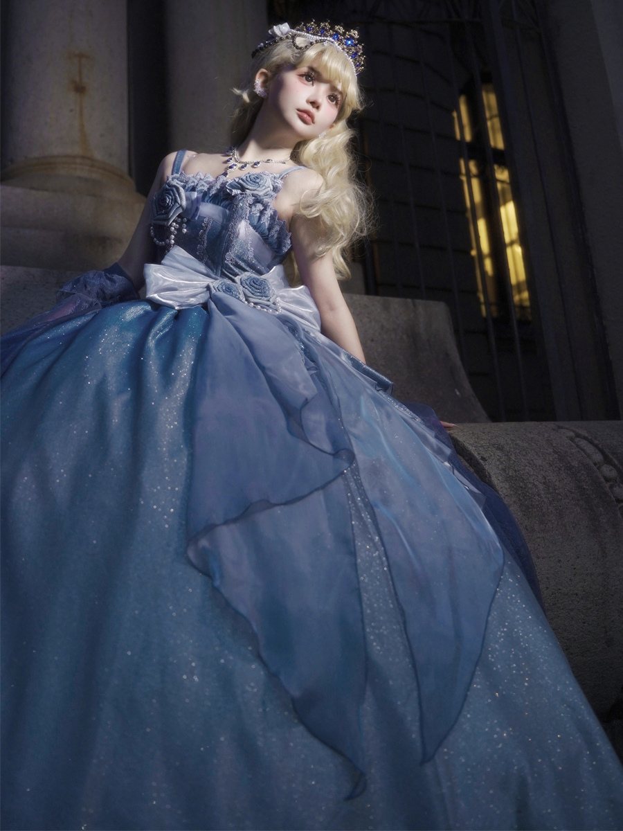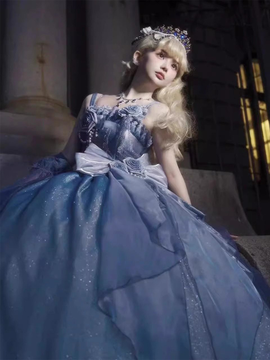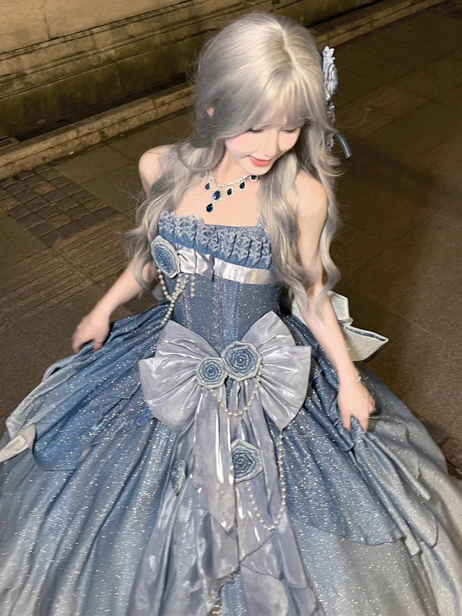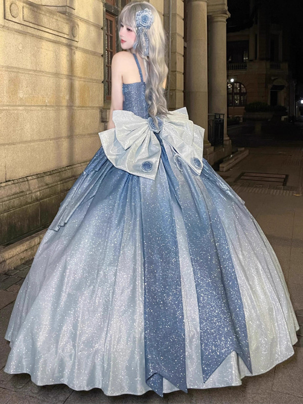 フェアリーロリータドレス ブルー キラキラフラワー リボン ロングロリータドレス