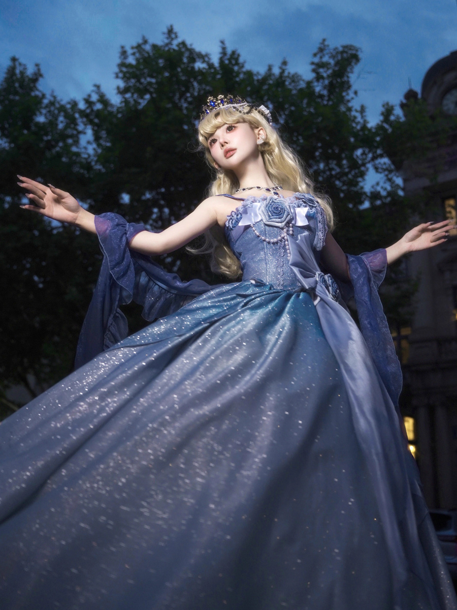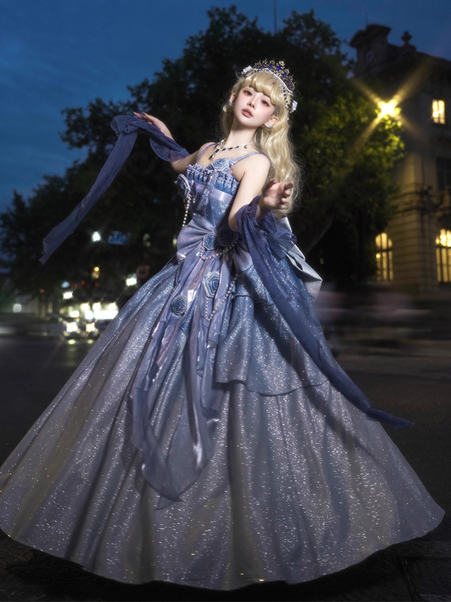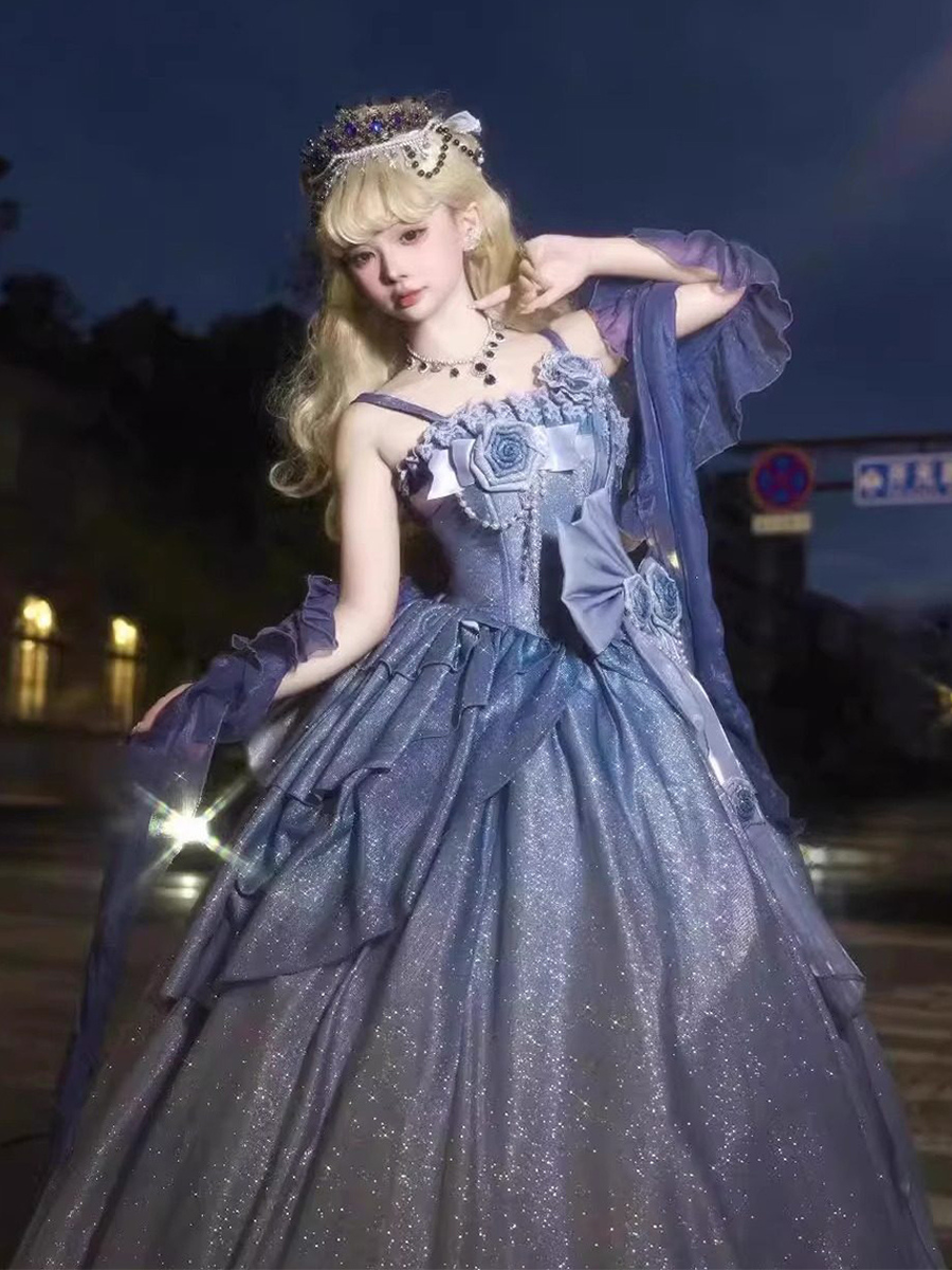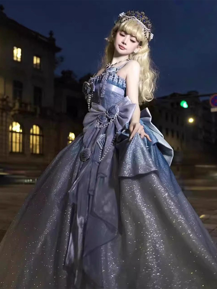 フェアリーロリータドレス ブルー キラキラフラワー リボン ロングロリータドレス