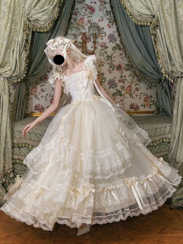 フェアリーロリータドレス シャンパンレース フリル リボン ロング スウィート ロングロリータドレス