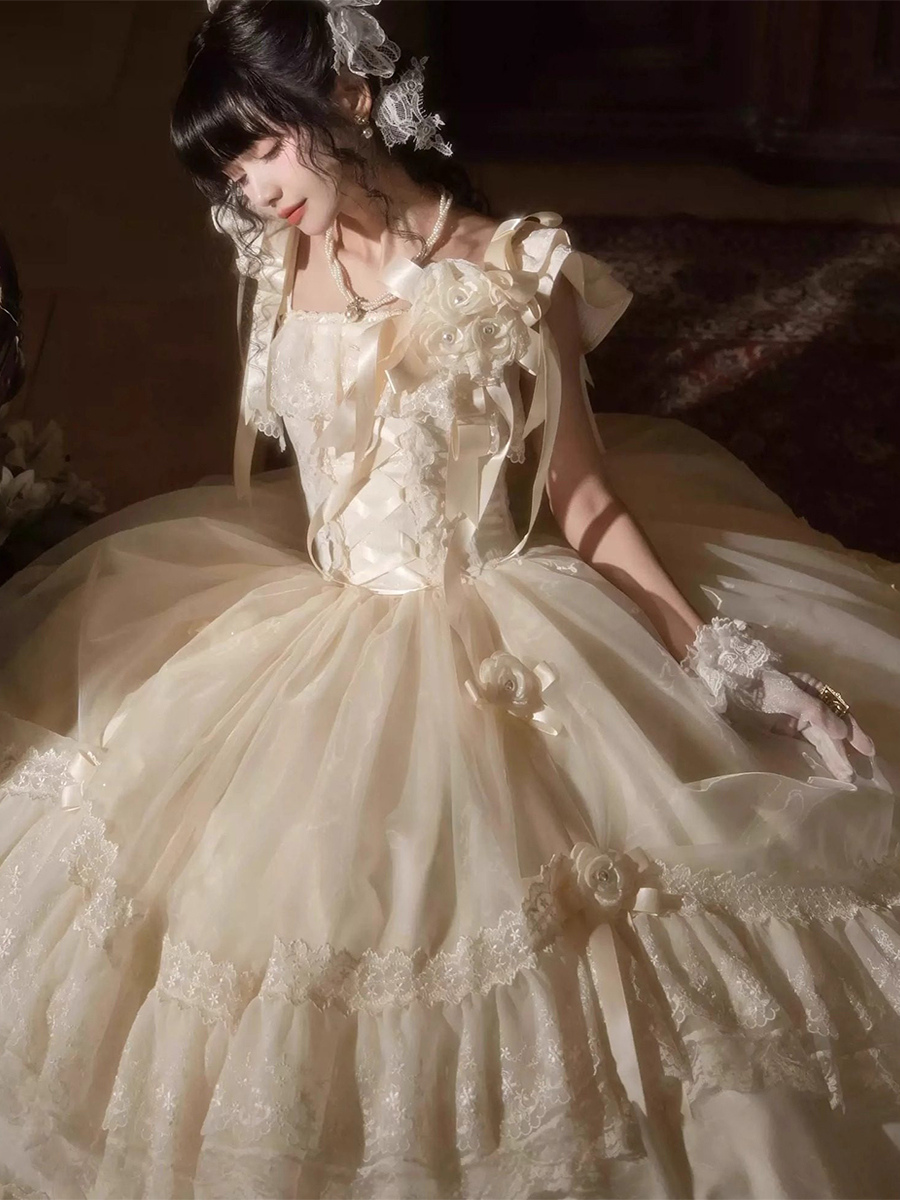 フェアリーロリータドレス ホワイト リボン レースアップ 花柄 ロング ロリータ ティーパーティードレス