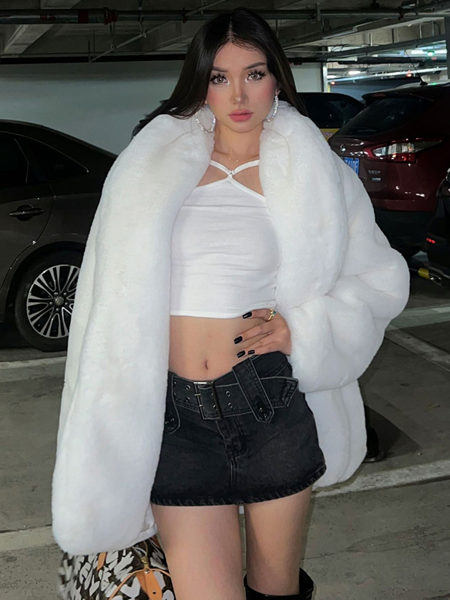 フェイクファーコート 長袖 シック オーバーサイズ ターンダウンカラー ホワイト レディースコート