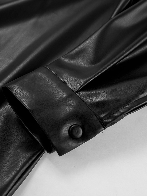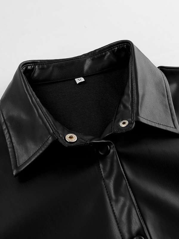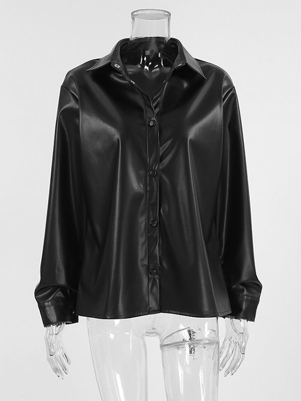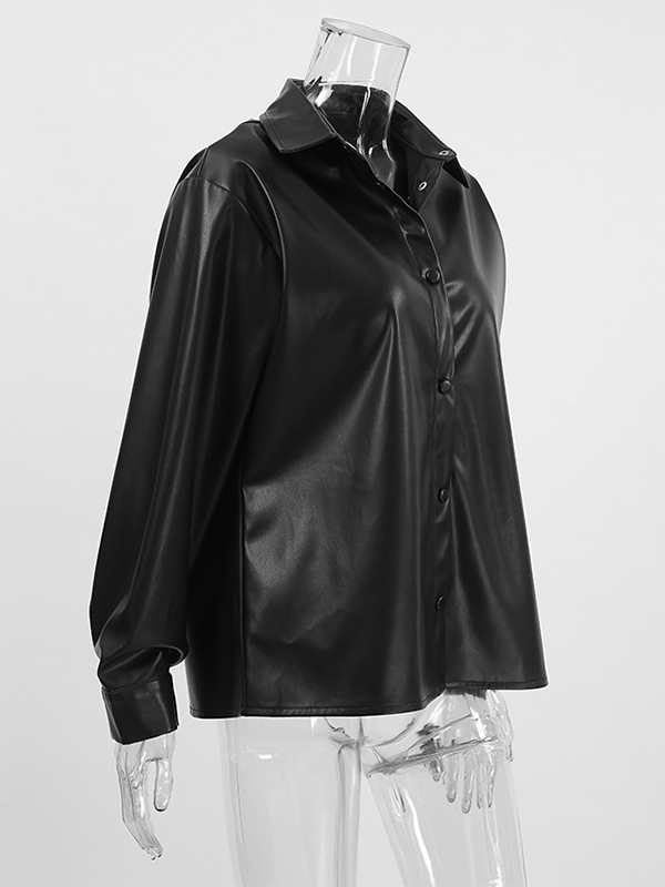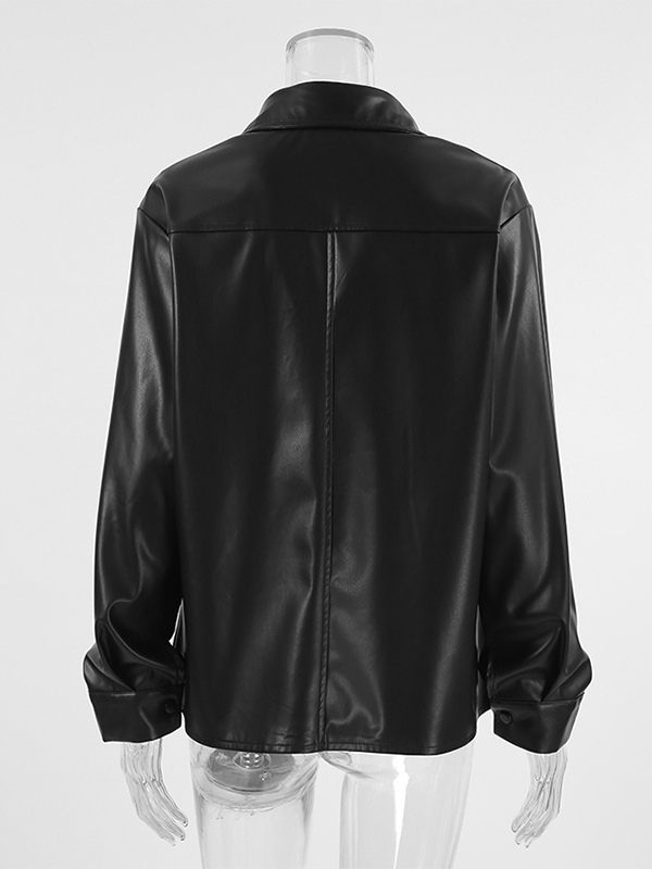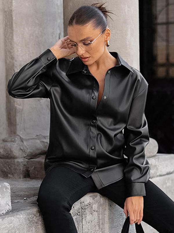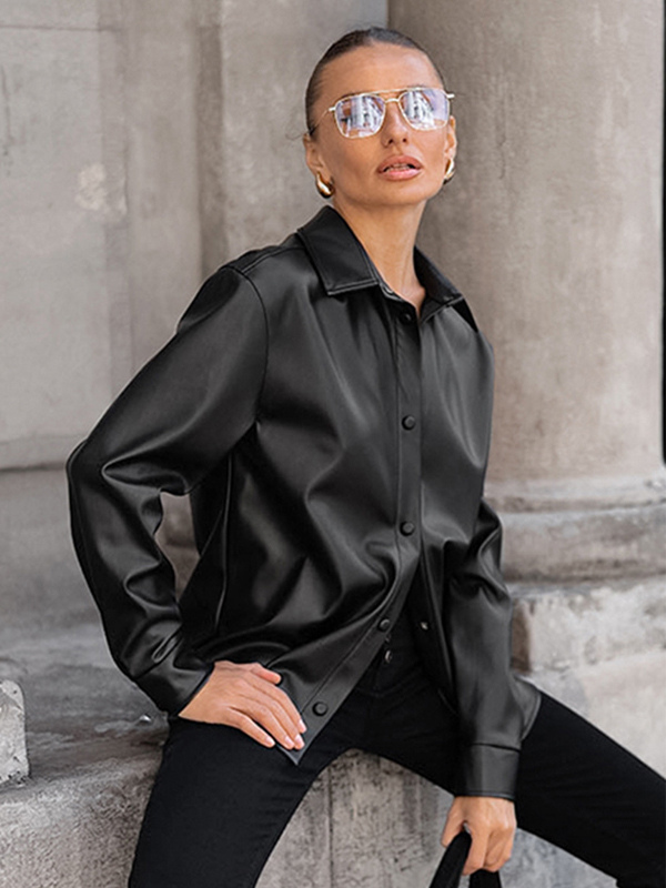 フェイクレザーシャツ レディース ボタンダウン シャケット - ミニマルな襟付き長袖トップス - オーバーサイズ ストリートウェア 春のコーディネート 2026