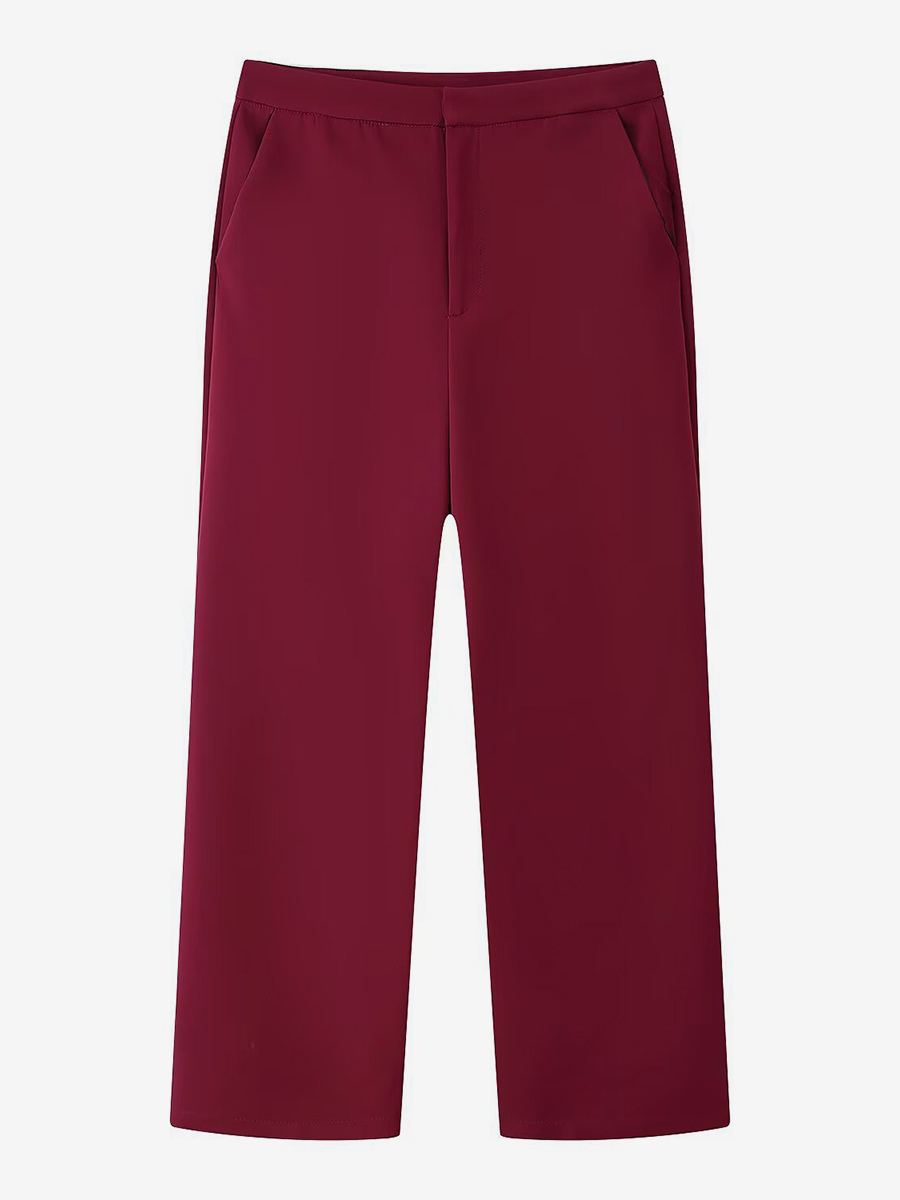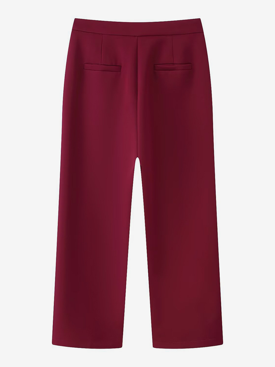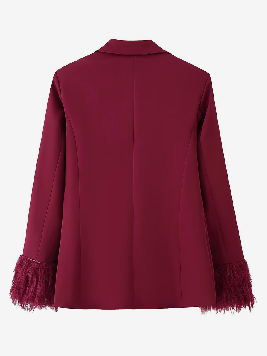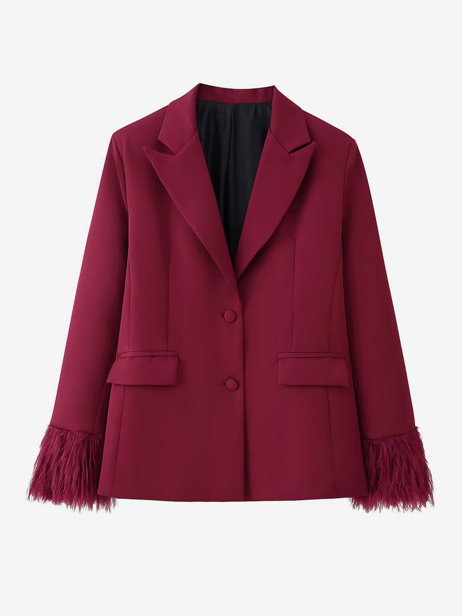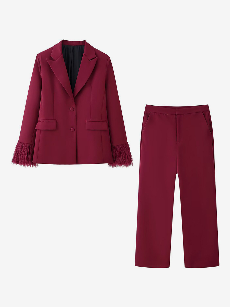 フェザーカフ付きレディースツーピーススーツセット - レッドのエレガントなブレザーとストレートレッグパンツのコーディネート - 2026年春のビジネスパーティー衣装