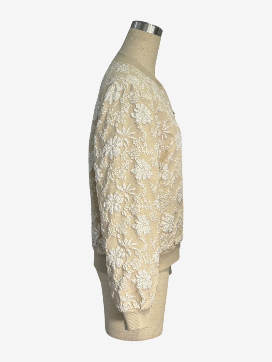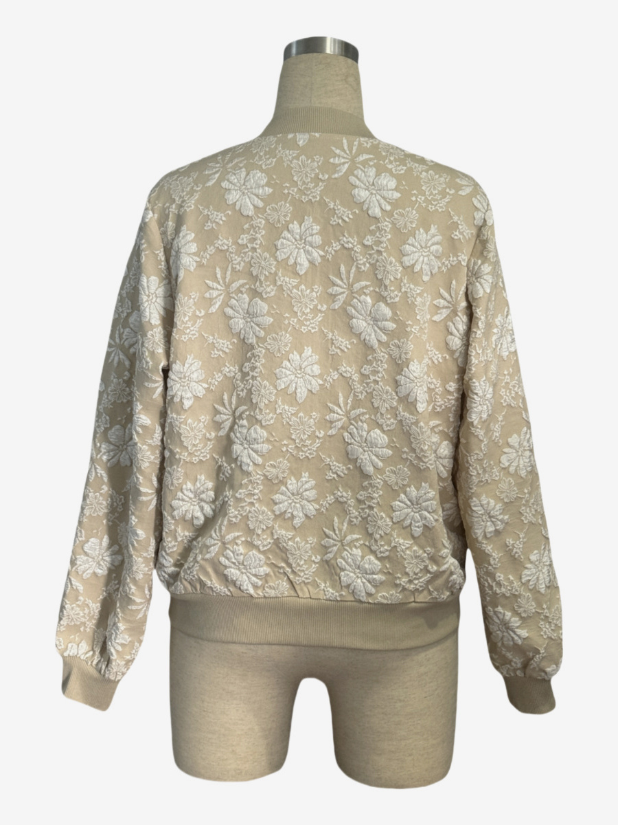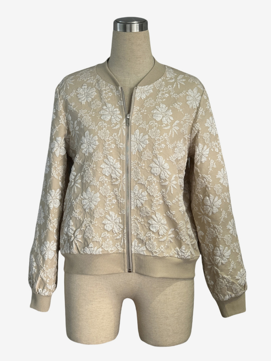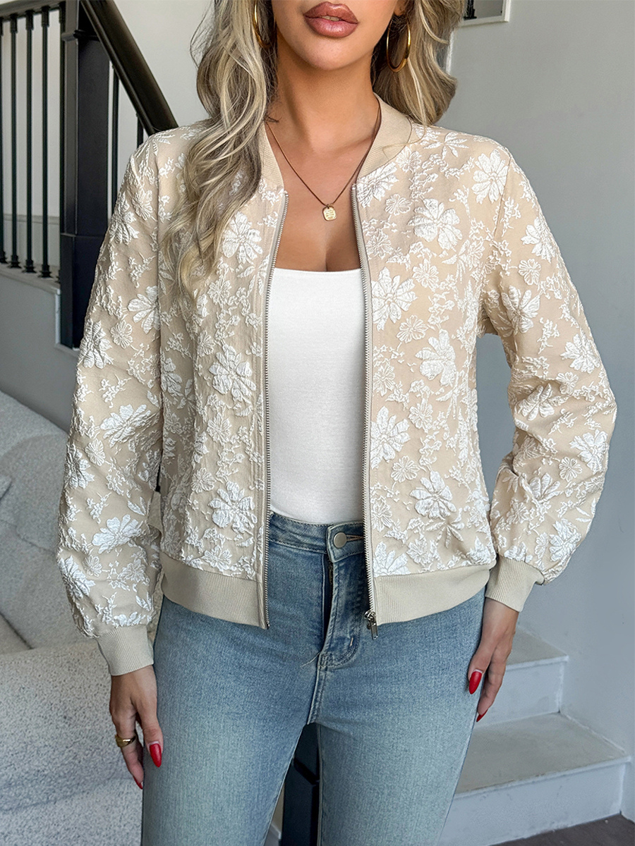 花柄ジャカード織りレディースボンバージャケット - エレガントな3Dエンボス加工の花柄ジップアップスリムフィット - シックな春のストリートウェア2026