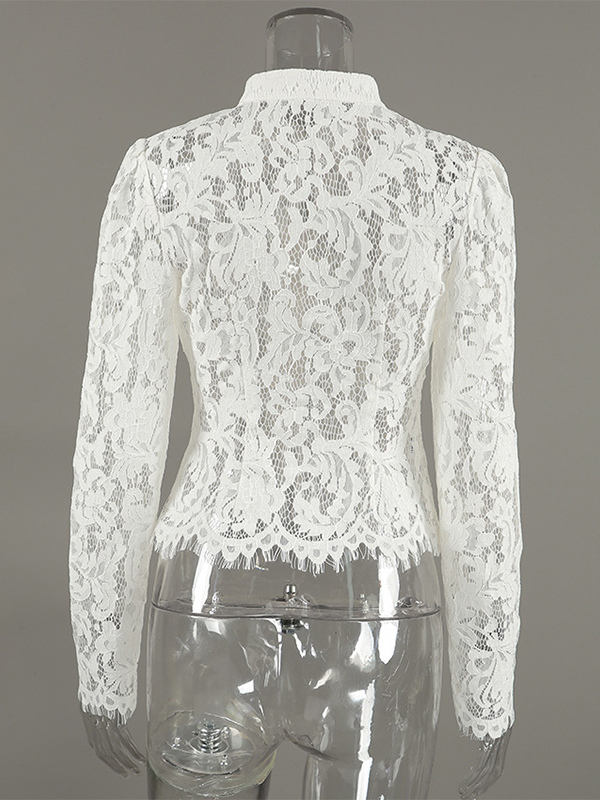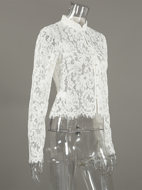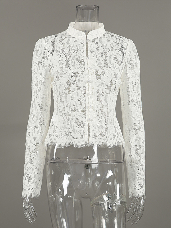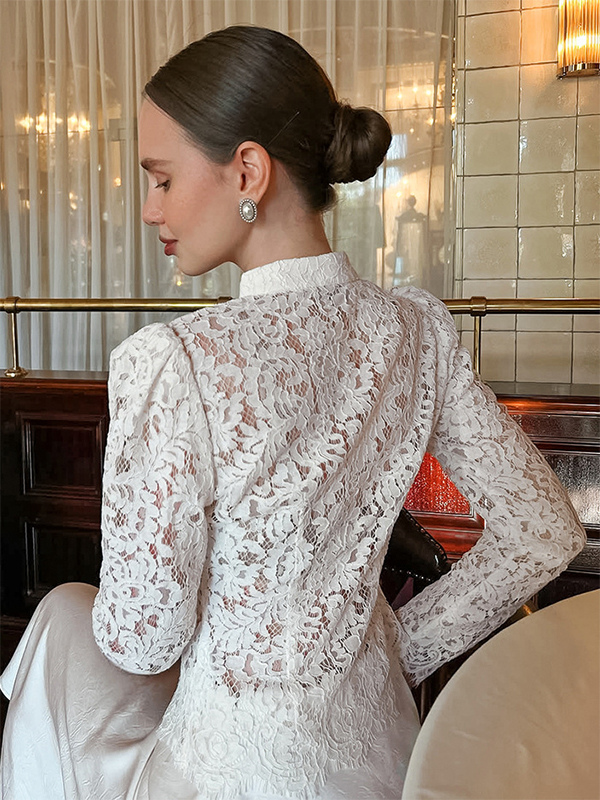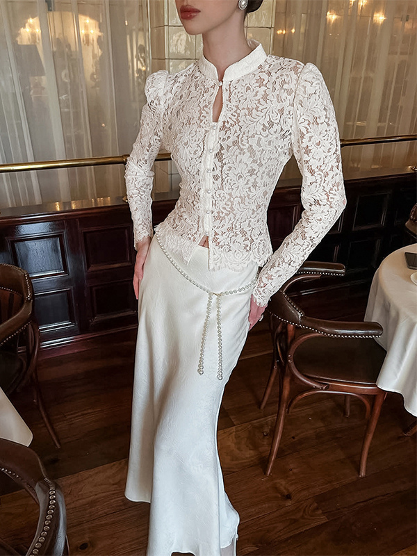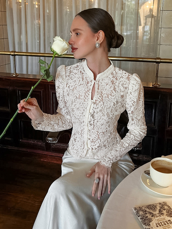 花柄レースブラウス レディース エレガント ボタンアップ トップス - ホワイト スタンドカラー スリムフィット - 春の夜のパーティーウェア 2026