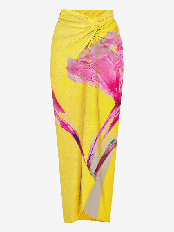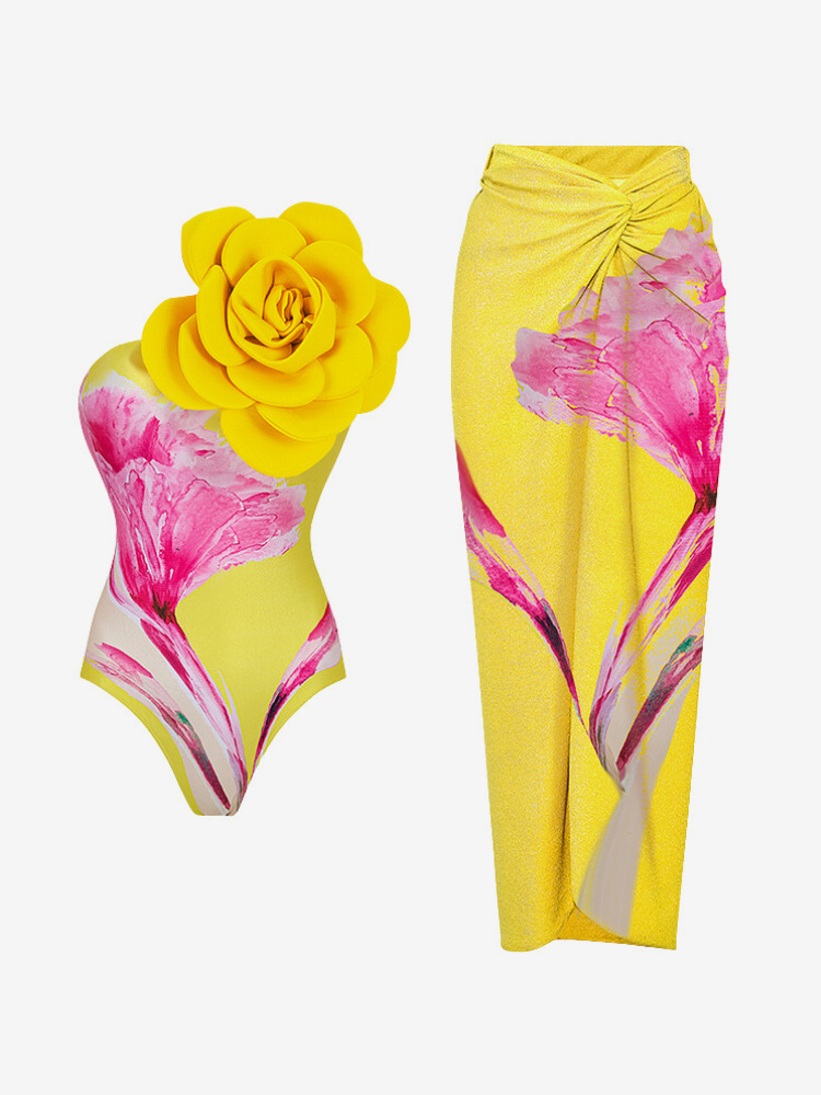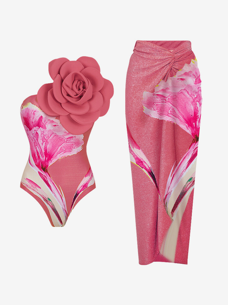花柄プリントのツーピース水着セット(女性用) - 3Dフラワーモノキニとマキシ丈サロンスカートカバーアップ - サマービーチリゾート2026
