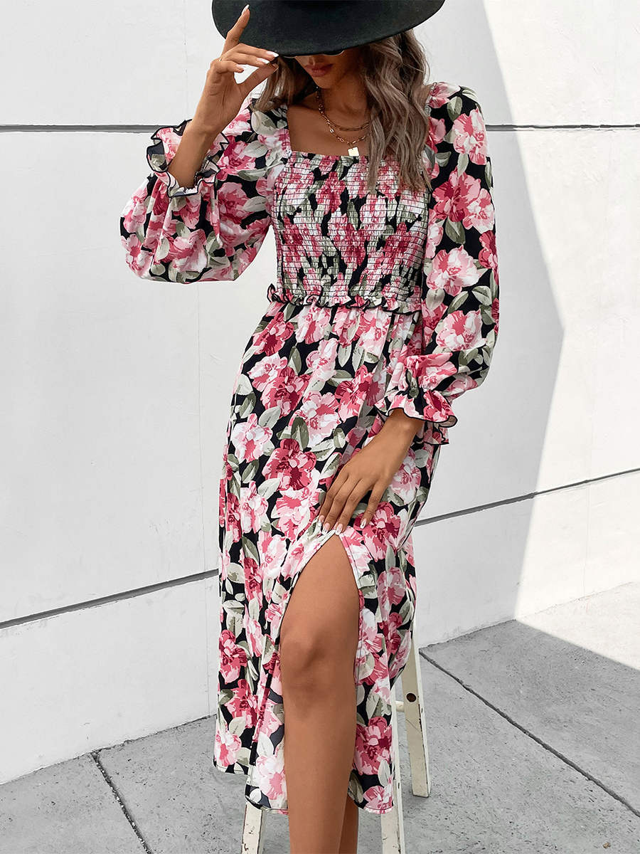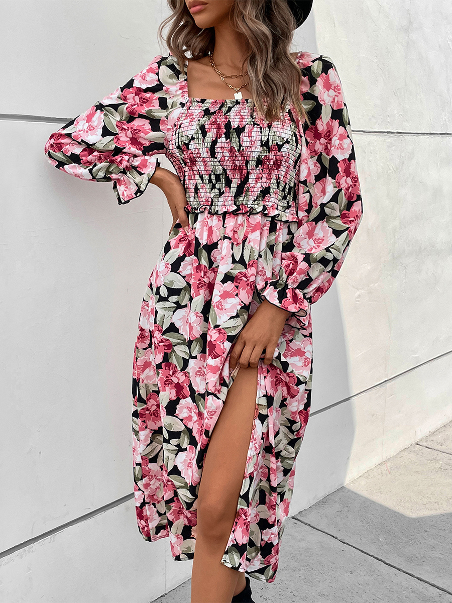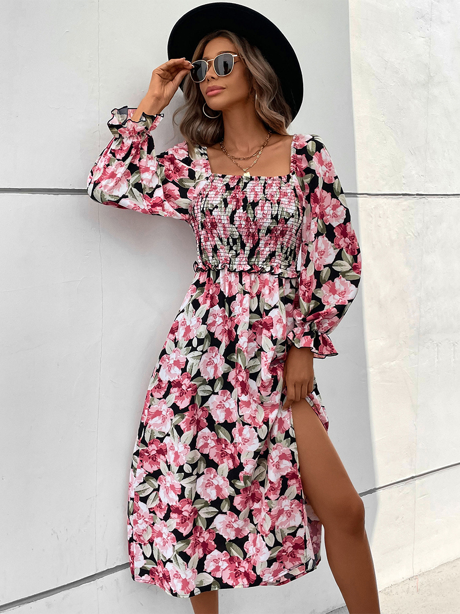 2025年レディース向け、ハイスリット入りフローラルプリントシャーリングスクエアネックワンピース