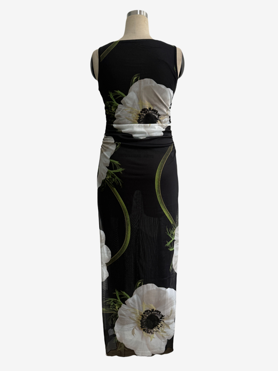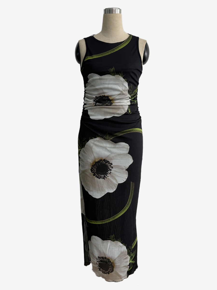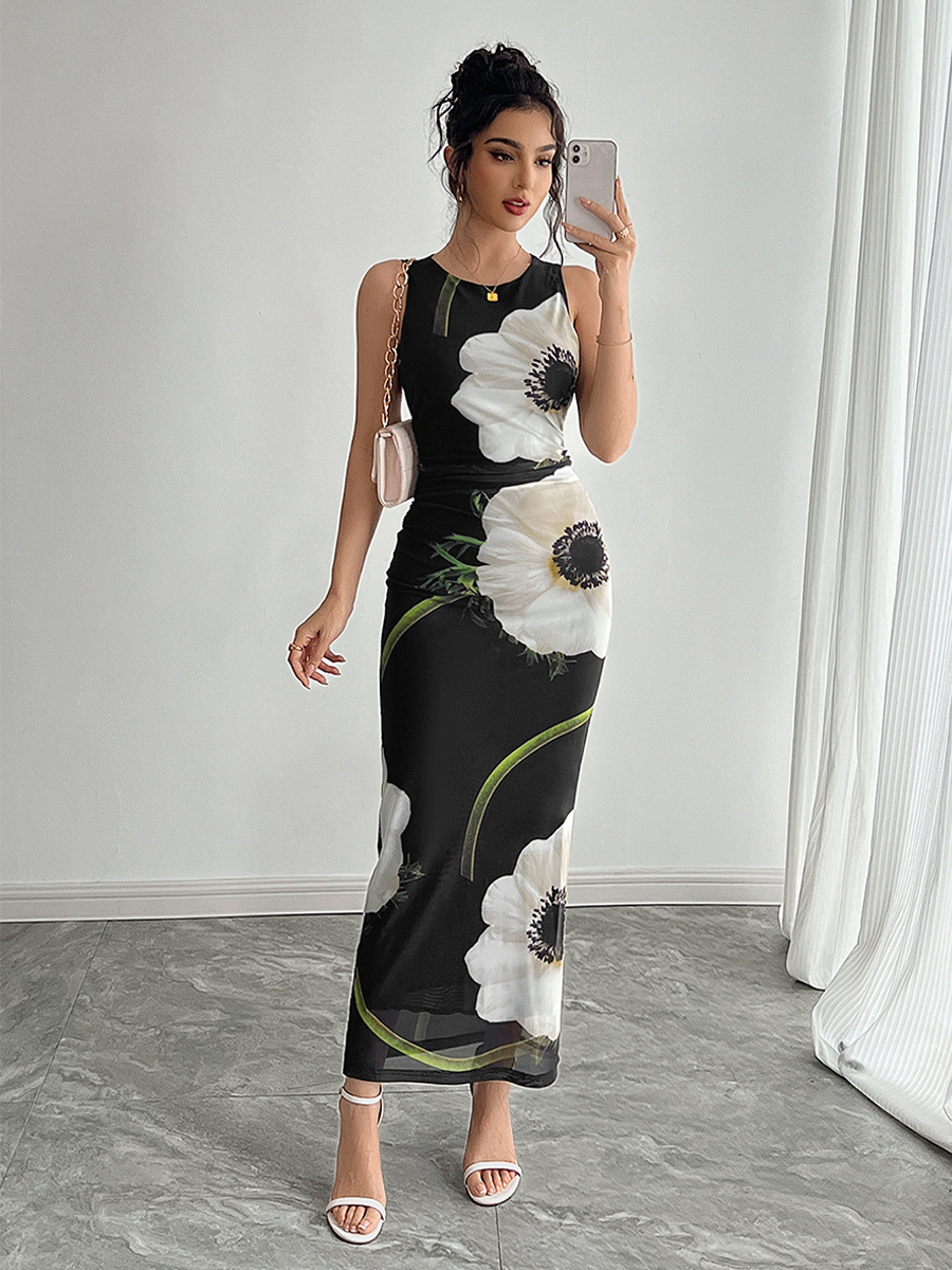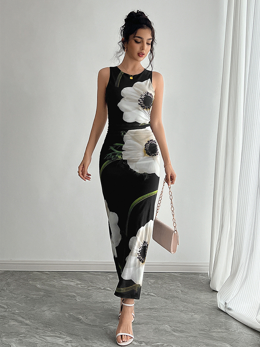 花柄プリントのレディースマキシドレス - エレガントなギャザー入りボディコン - 90年代ヴィンテージ風サマーデイリーウェア 2026