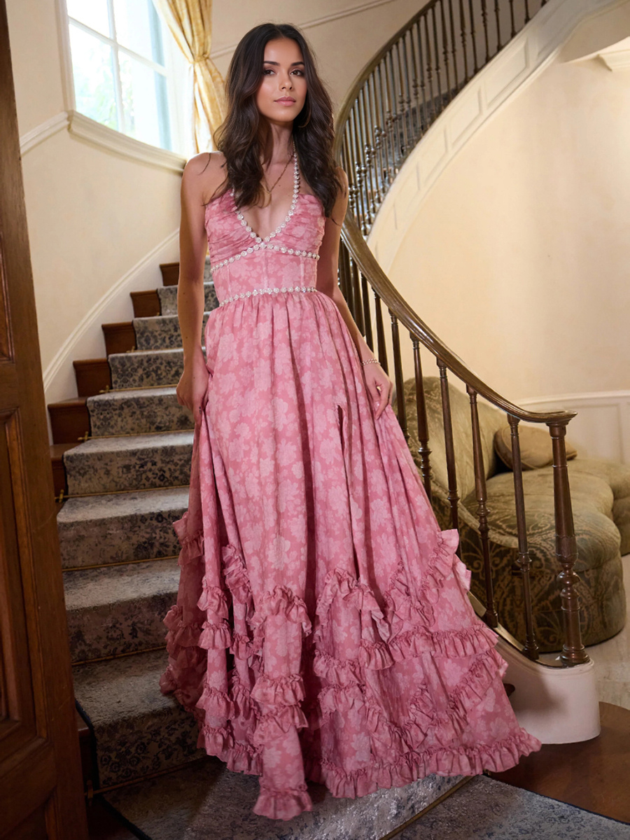 ホルターネックとハイスリット入りフローラルフリルマキシパーティードレス 2025