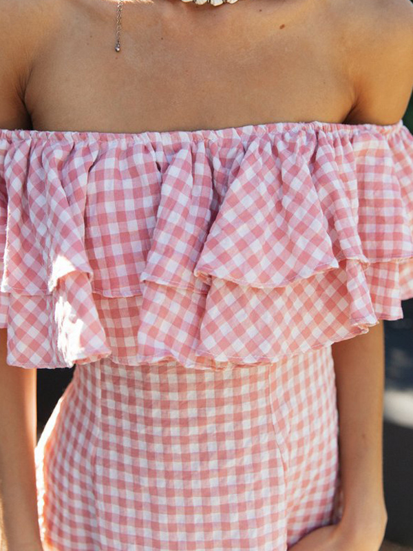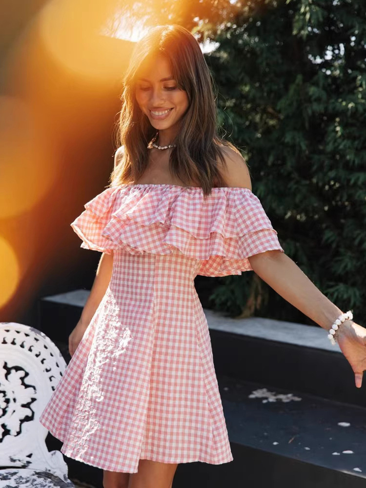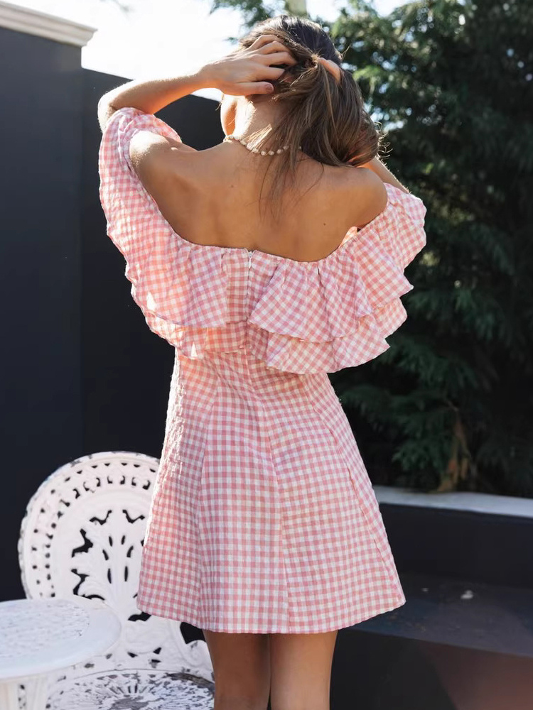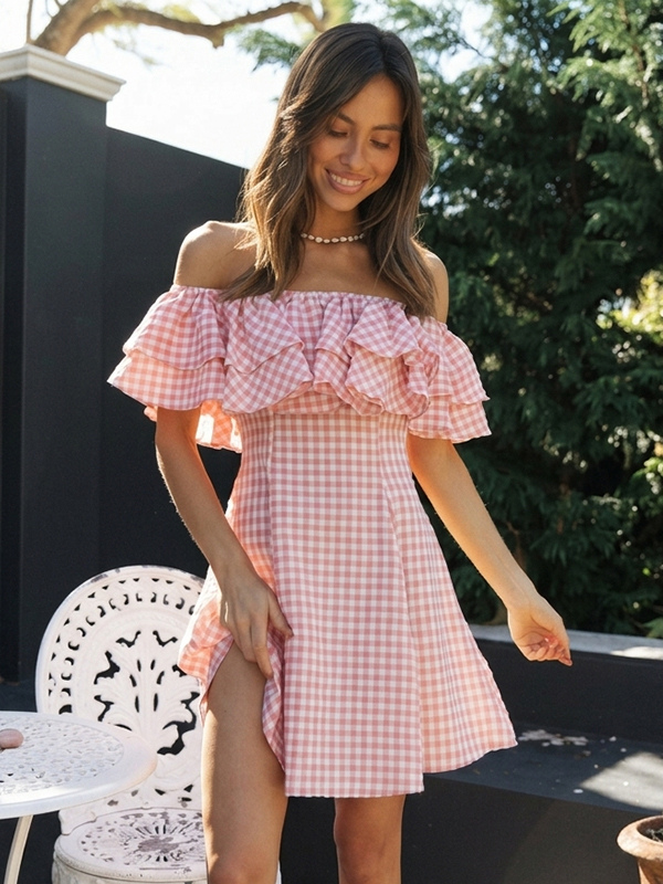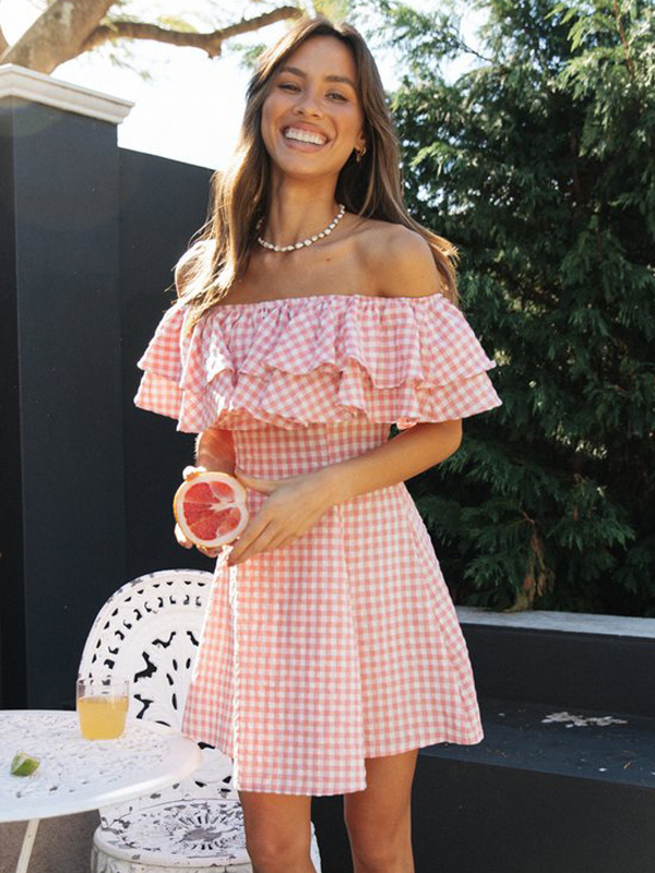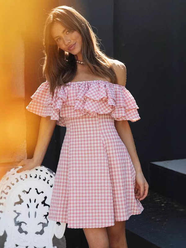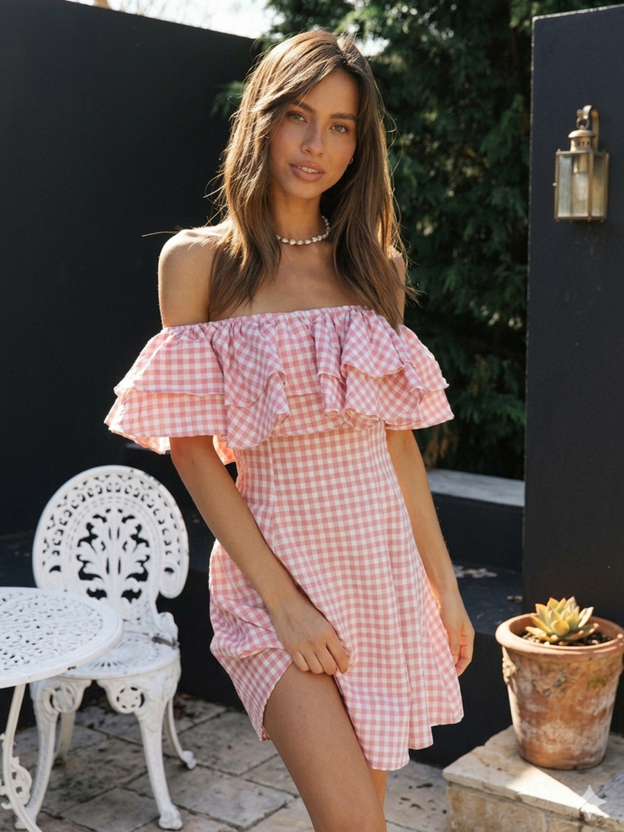 ギンガムチェックのオフショルダーミニドレス(女性用) - ピンクのコテージコア風フリルスケータードレス - 夏のピクニックパーティー 2026
