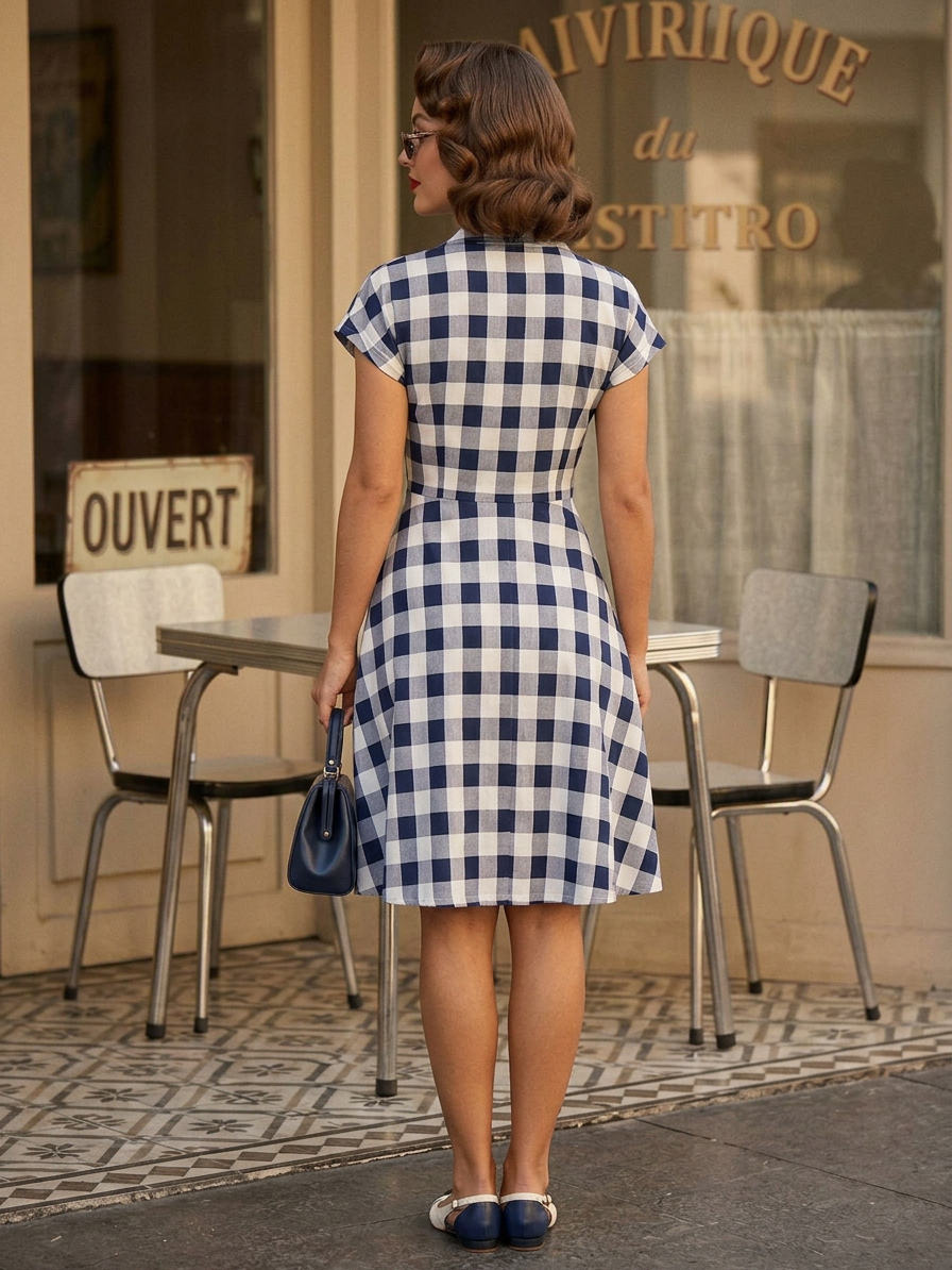 ギンガムチェックのヴィンテージドレス 半袖 ヘップバーンスタイル Aライン ミディドレス レディース 2026