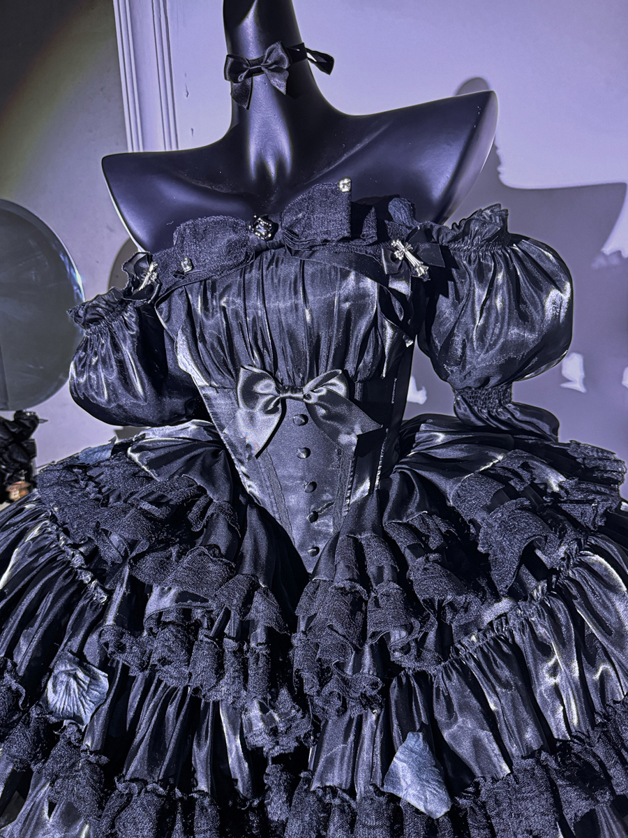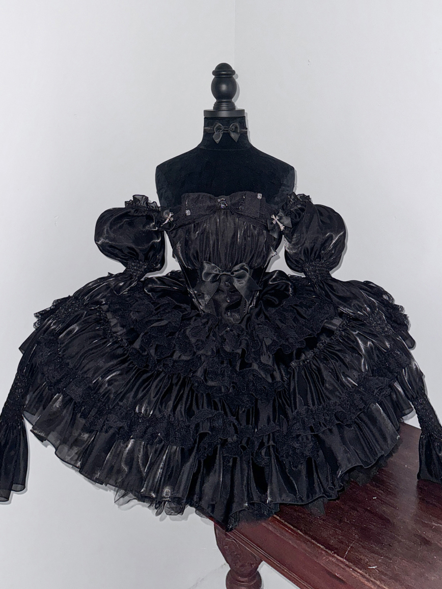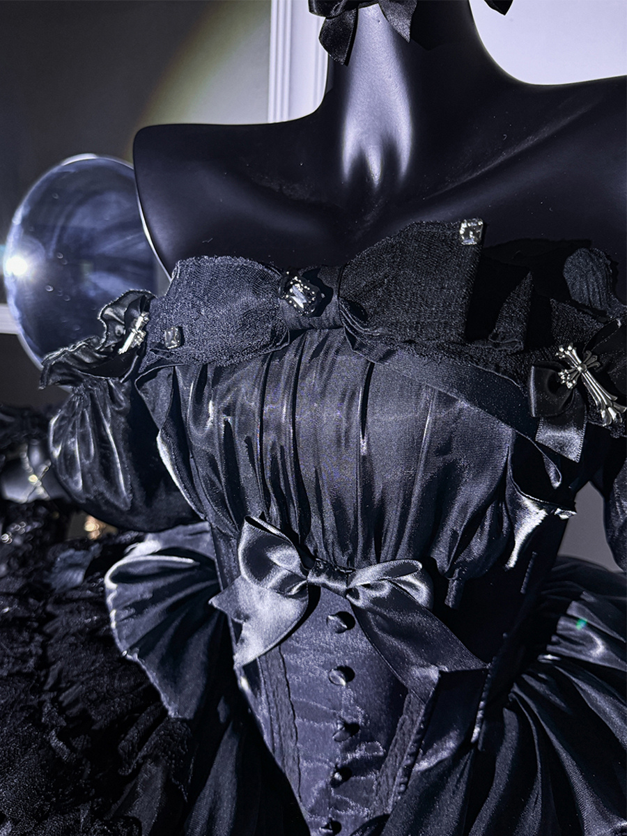 This Gothic Lolita black strapless dress combines intricate lace detailing with a puffy princess silhouette, featuring layered tulle construction for a dramatic yet elegant aesthetic.