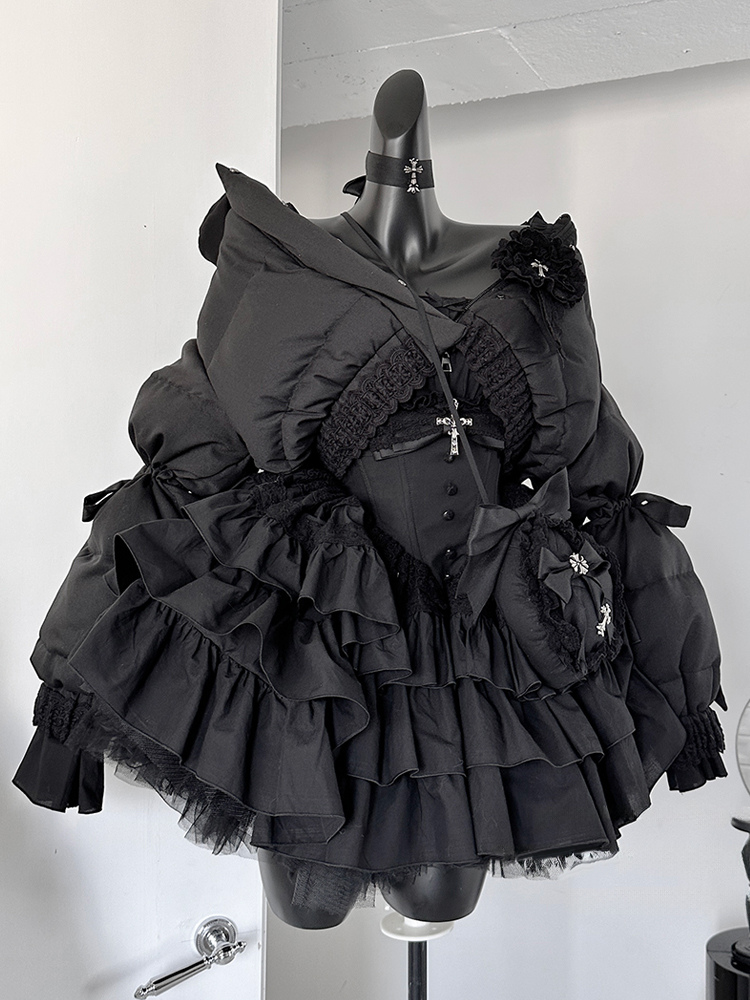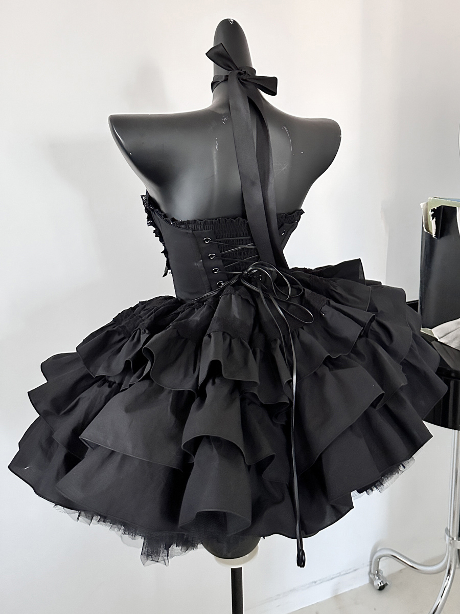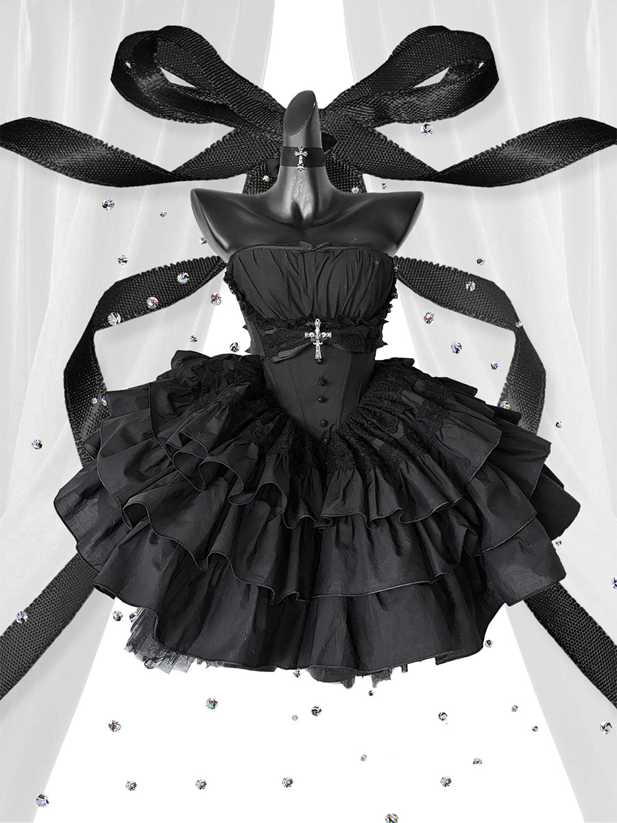 This Gothic Lolita black strapless JSK dress features a detachable chest harness and matching neck accessories, blending edgy harness details with classic Lolita elegance for a bold yet refined silhouette.