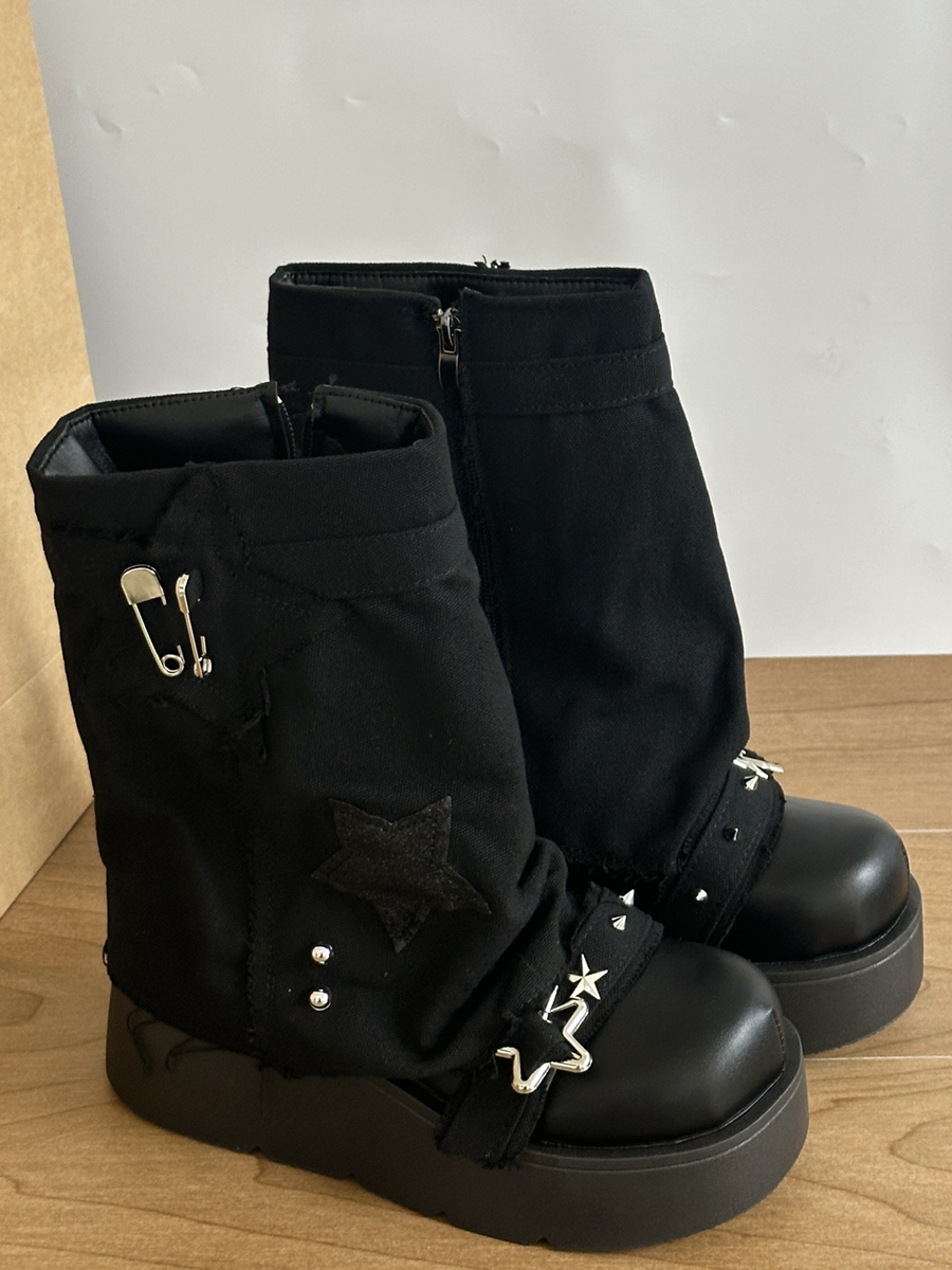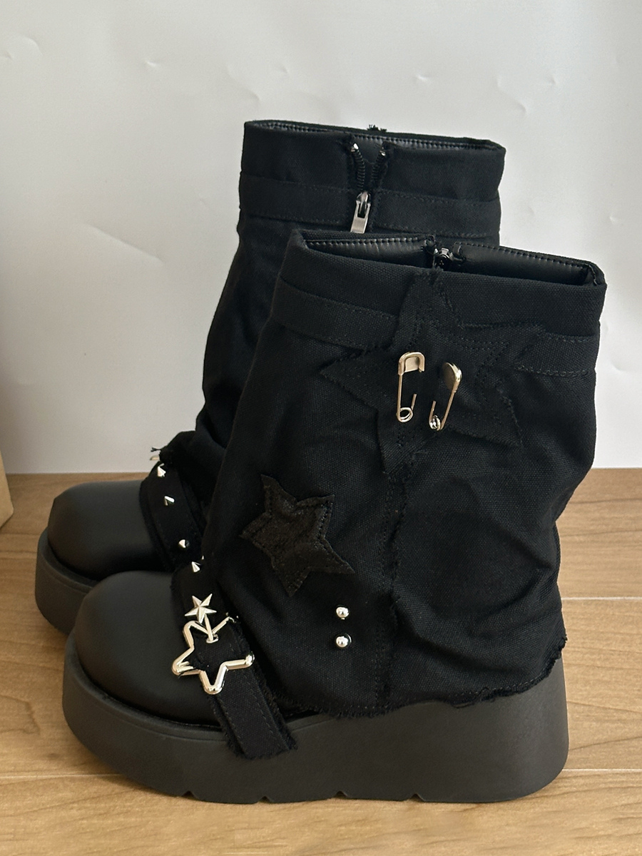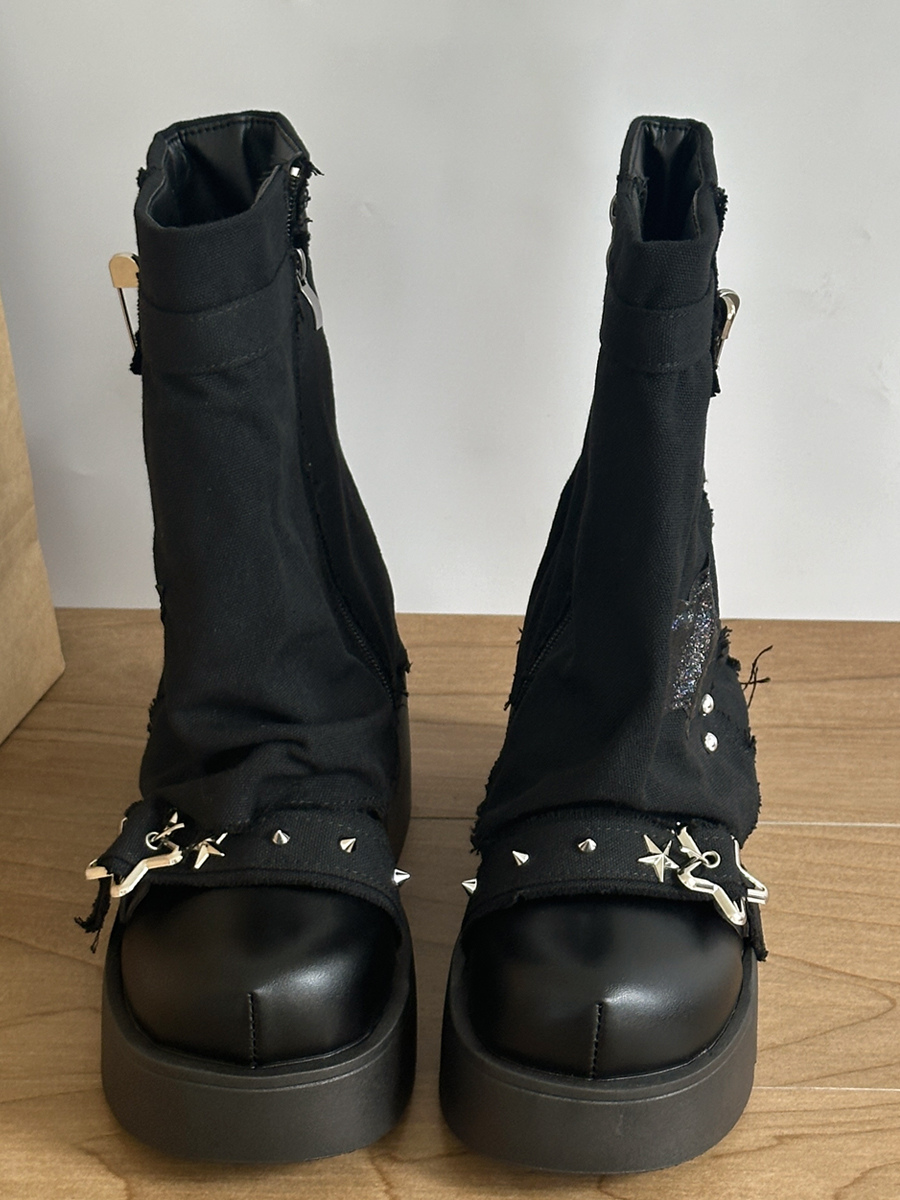 ゴシックロリータブーツ ブラック Y2K ゴシックパンク チャンキー スター刺繍 スタックロリータシューズ