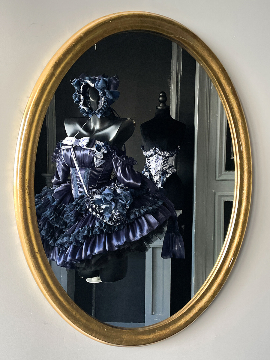 This Gothic Lolita dark blue strapless dress features delicate lace trimming and a puffy princess silhouette, complete with a matching headpiece for a harmoniously elegant and dramatic ensemble.