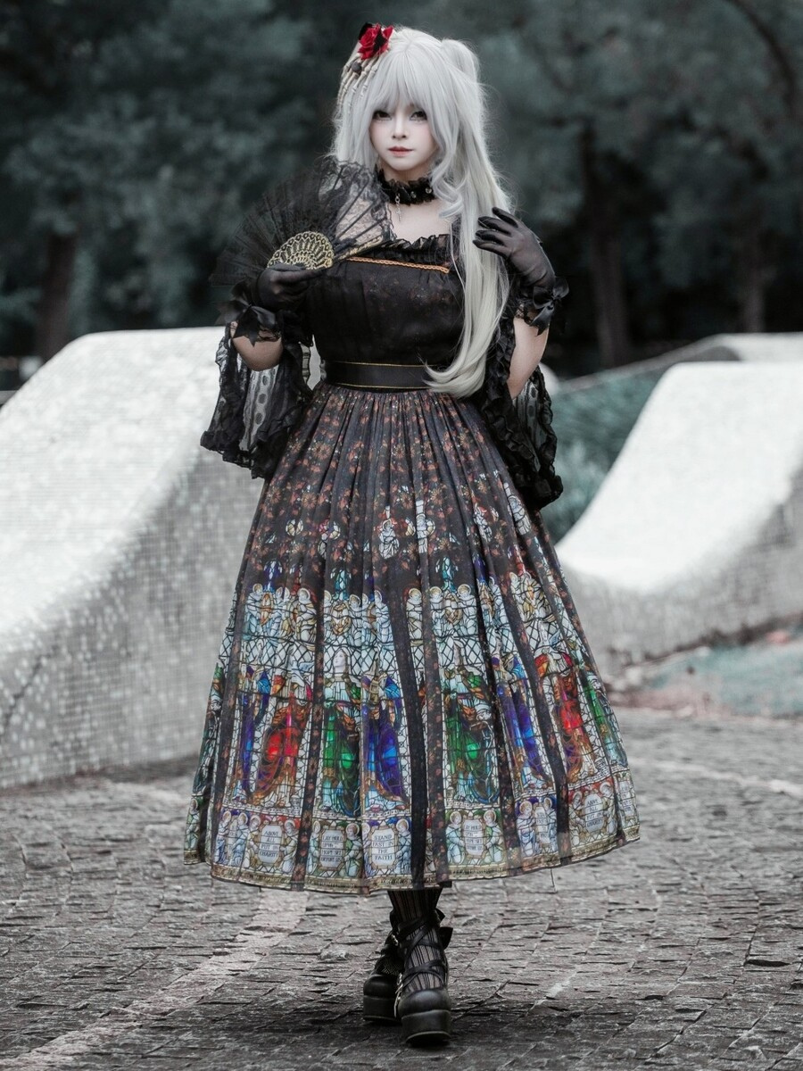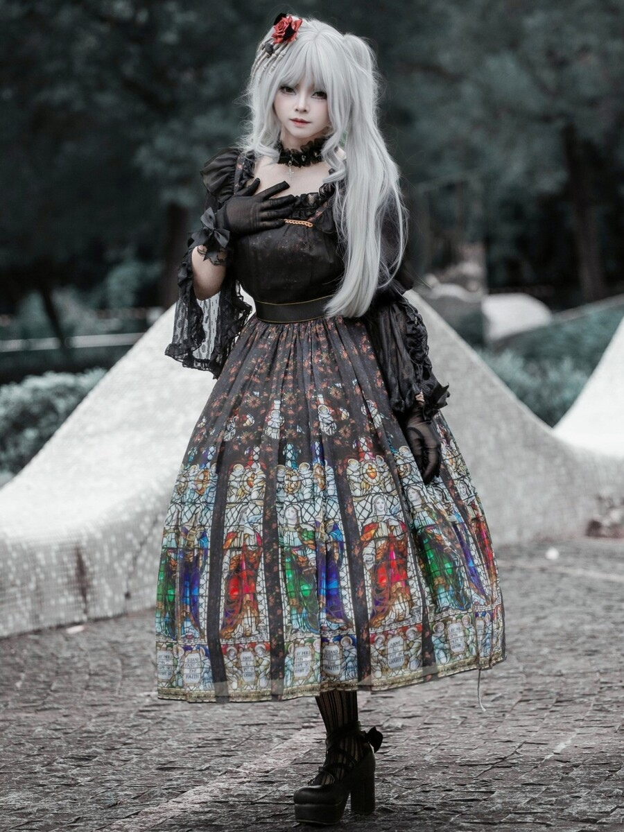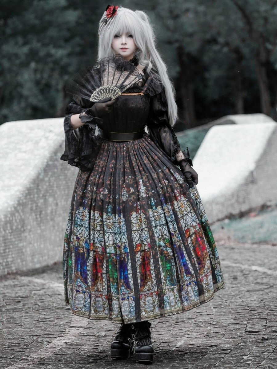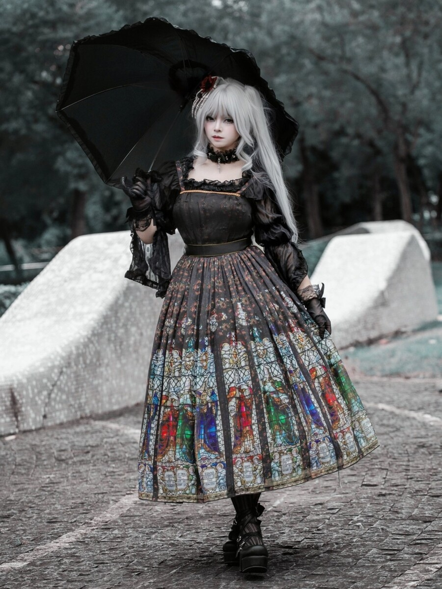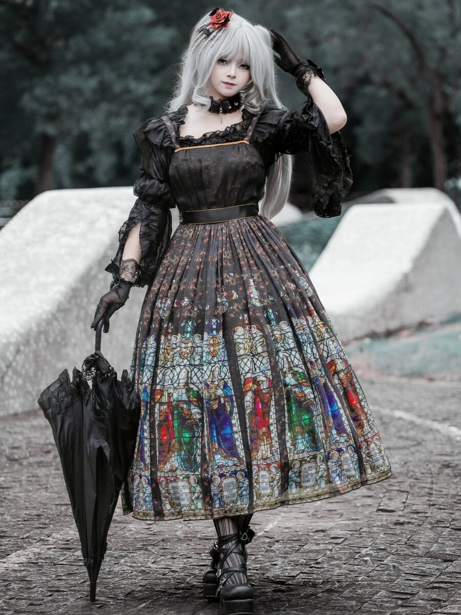 ゴシック ロリータ ドレス フリル 花柄 ブラック