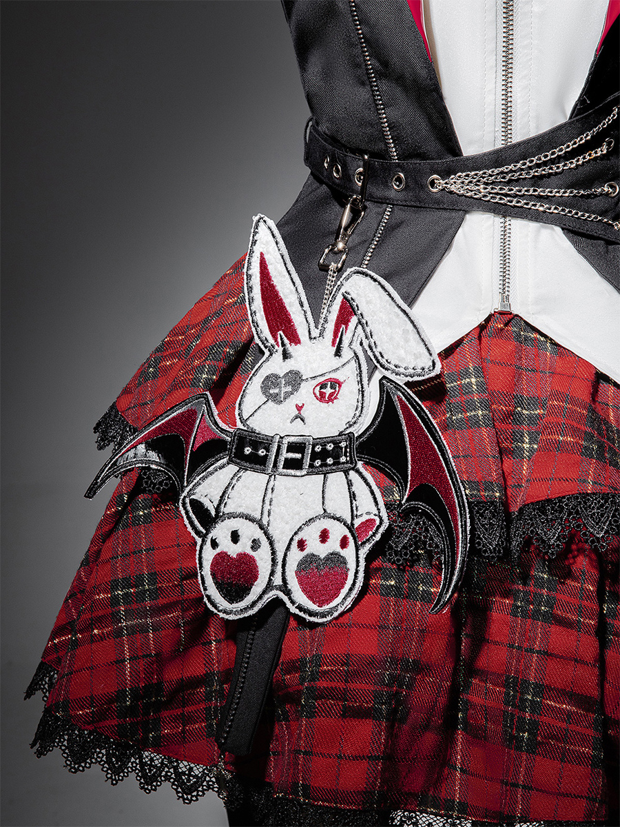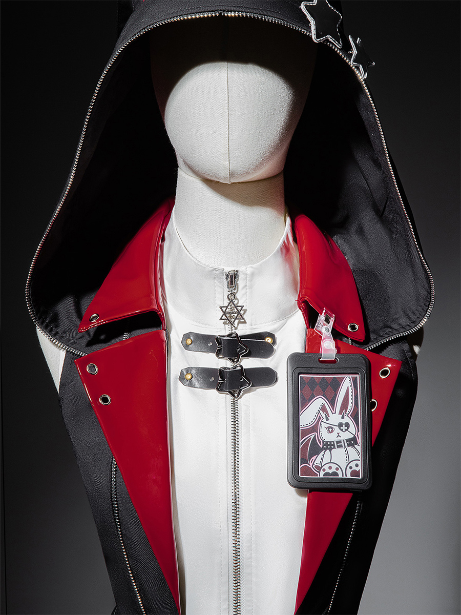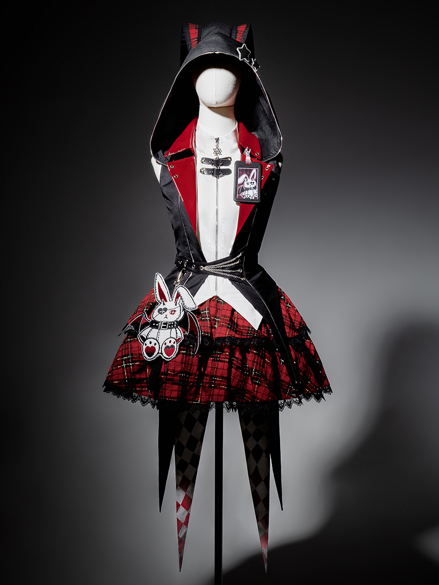This Gothic Lolita three-piece set includes a hooded jacket, blouse, and skirt, blending midnight bunny-inspired motifs with rock gothic edge for a playful yet darkly elegant ensemble.