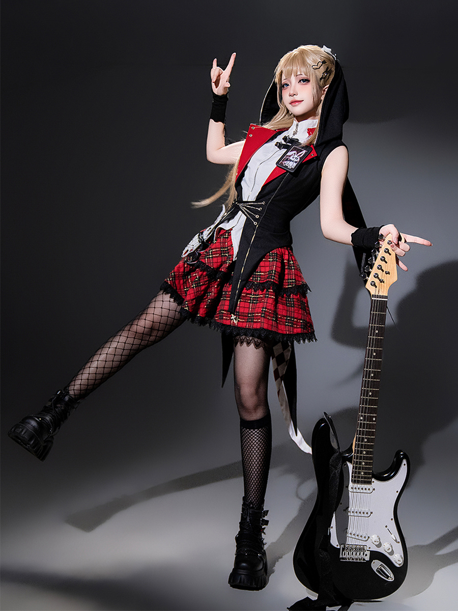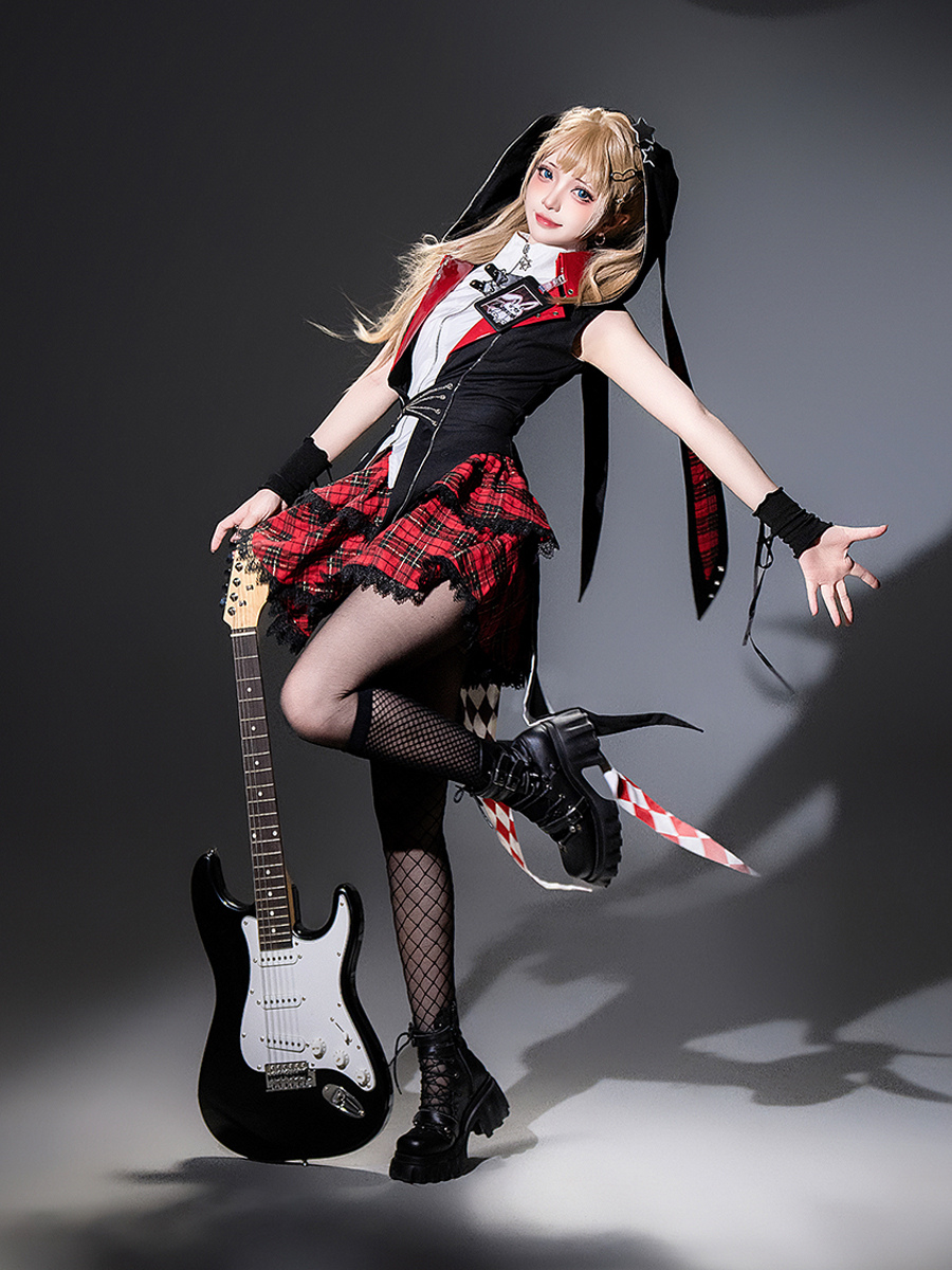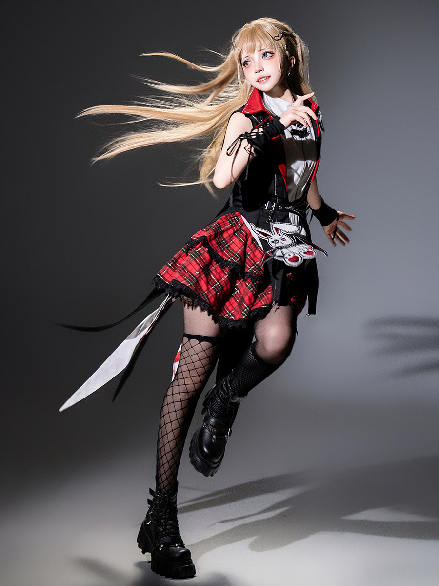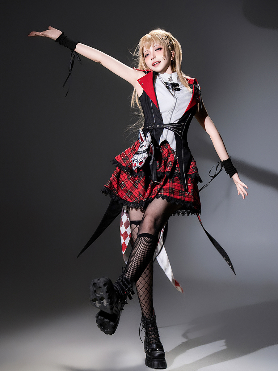 This Gothic Lolita three-piece set includes a hooded jacket, blouse, and skirt, blending midnight bunny-inspired motifs with rock gothic edge for a playful yet darkly elegant ensemble.
