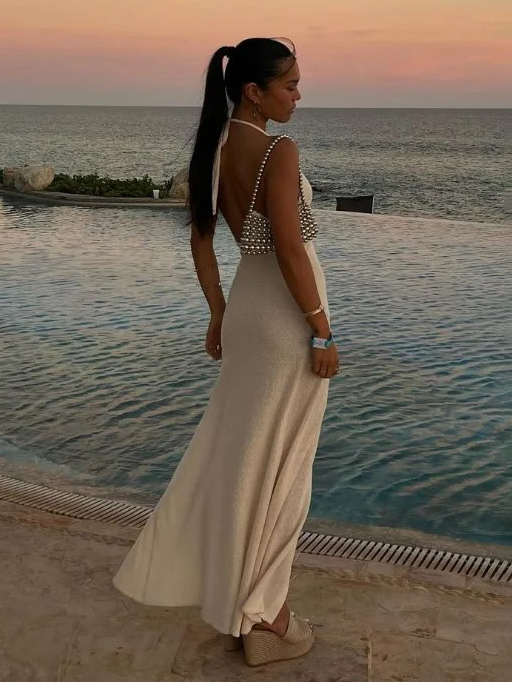 ホルターネックの背中開きマキシドレス(レディース) - スリムフィット、ハイカットスリット、花柄ロゼット付きロングドレス - 2026年夏のビーチバケーション