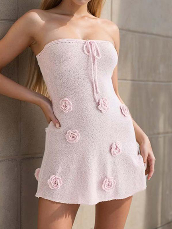 ホルターネックニットミニドレス(レディース) - ピンク3Dフラワーノースリーブボディコンショートドレス - サマービーチパーティー2026