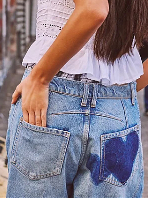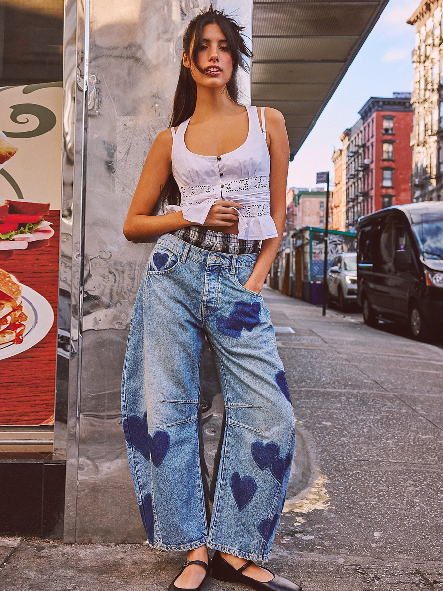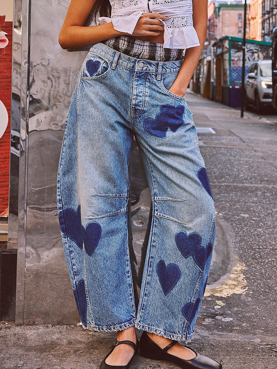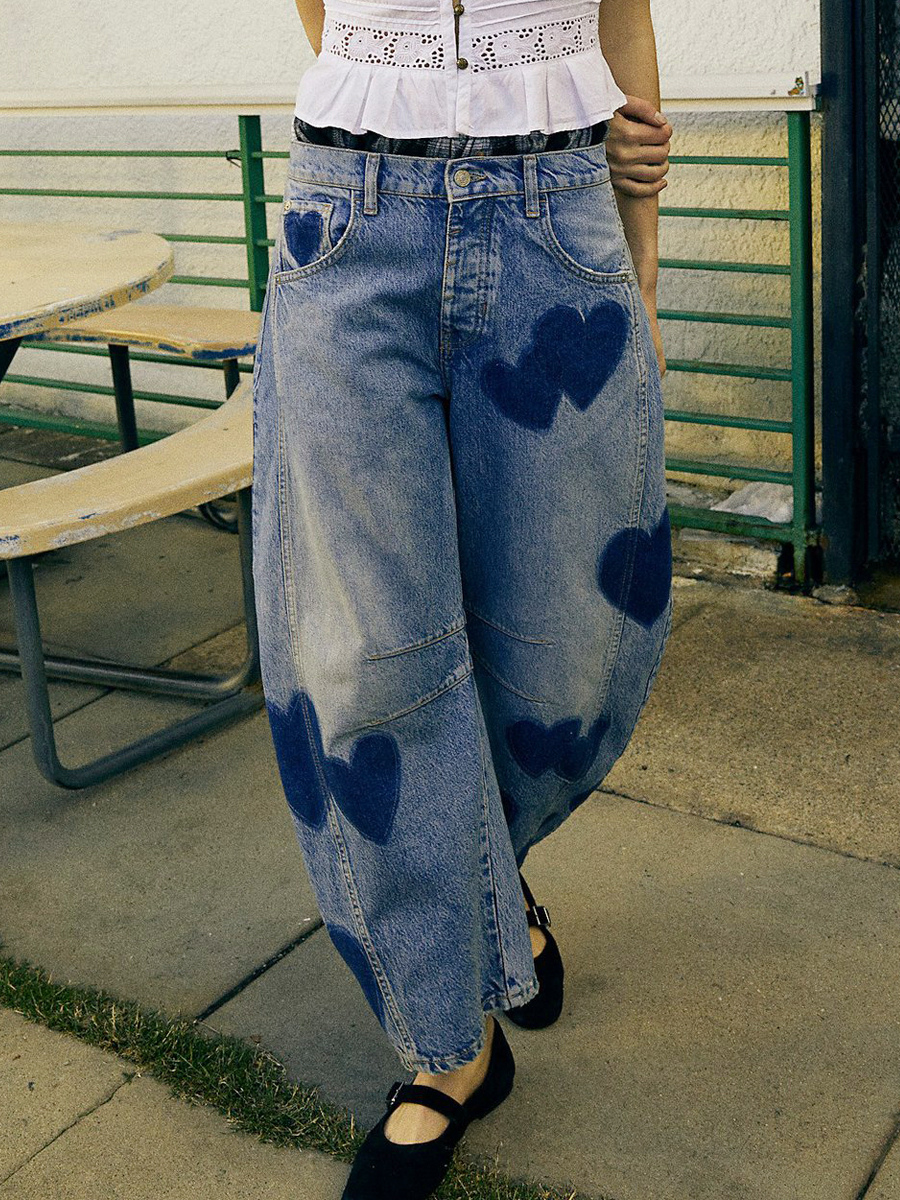 ハート柄バレルジーンズ(レディース) - ライトブルーホースシュー柄バギーデニムパンツ - スプリングミュージックフェスティバル2026