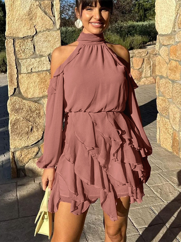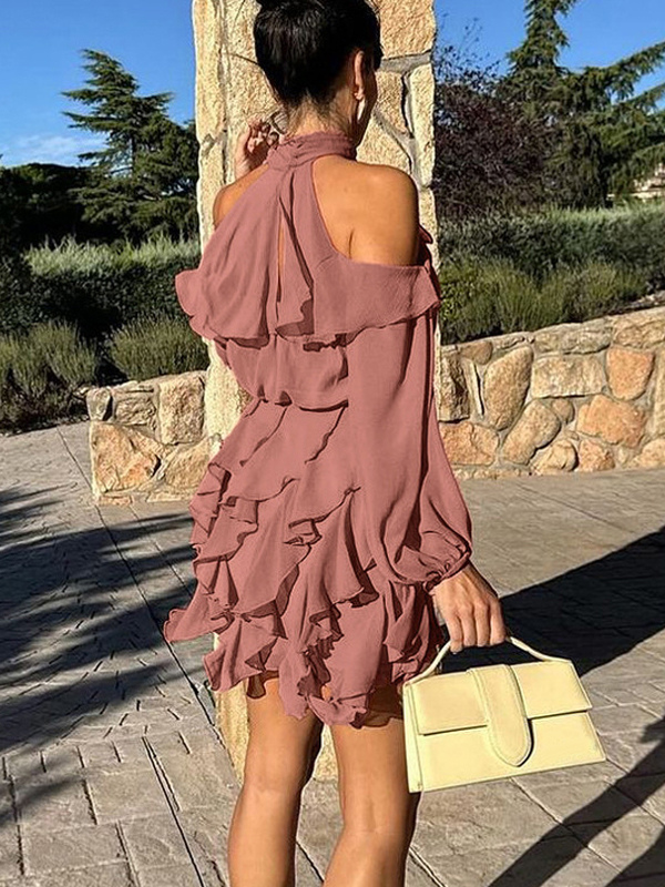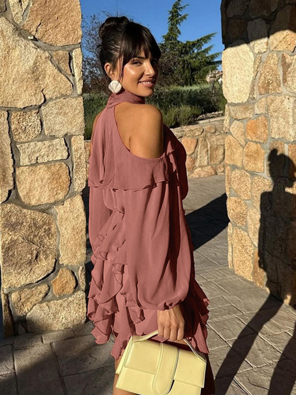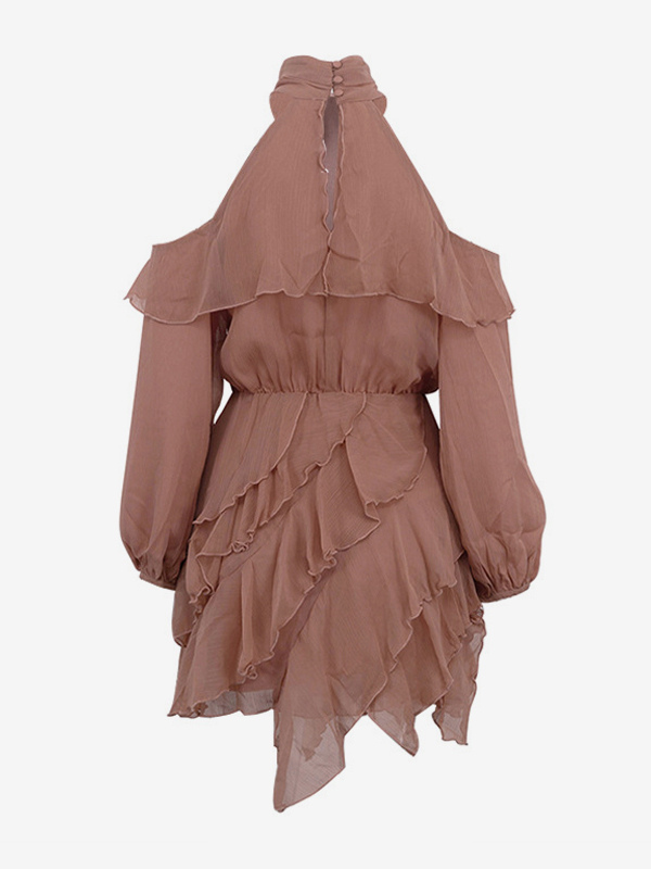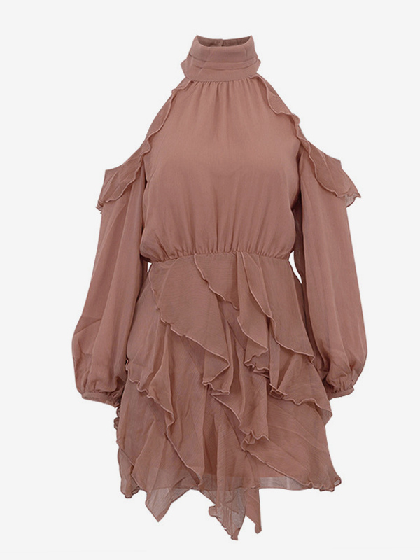 ハイネック、コールドショルダー、フリル、レイヤード、ランタンスリーブ、ミニドレス(レディース)2026