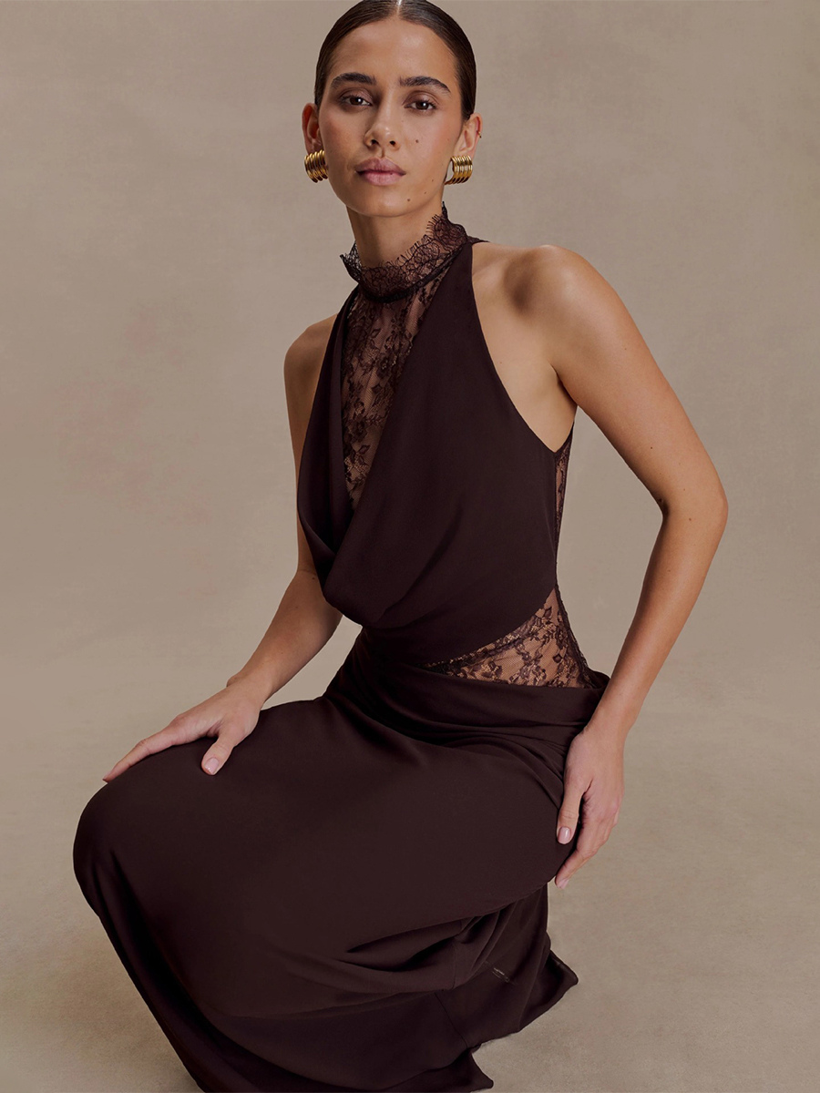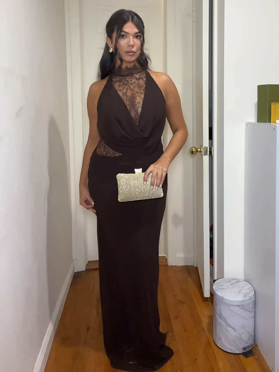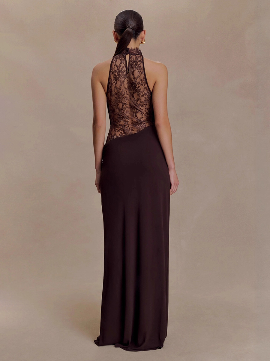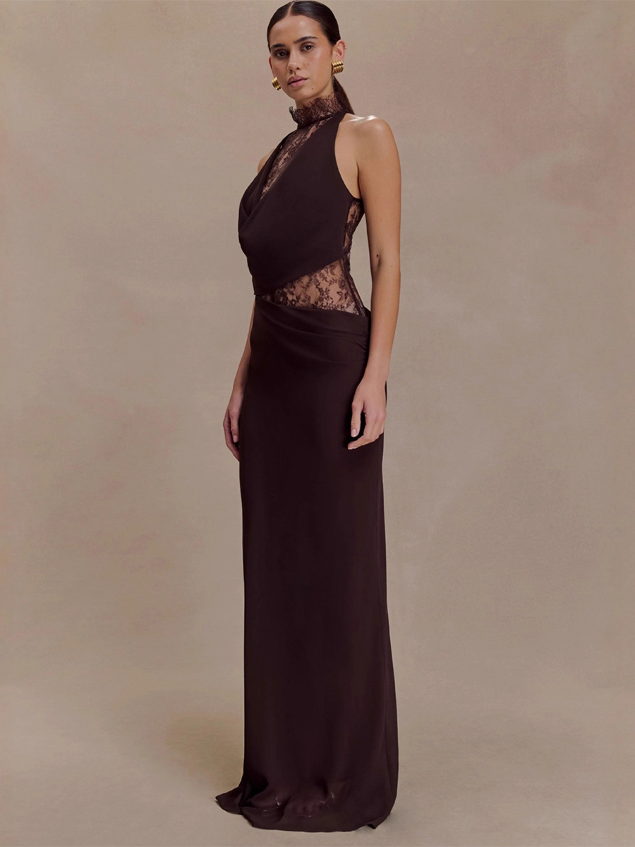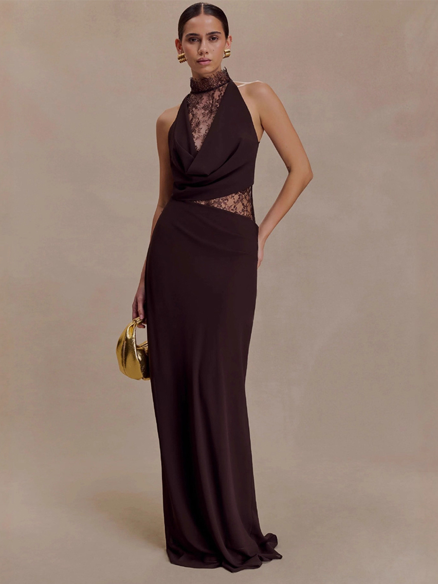 ハイネック レース パッチワーク カットアウト ノースリーブ マキシ ボディコン ドレス レディース 2026