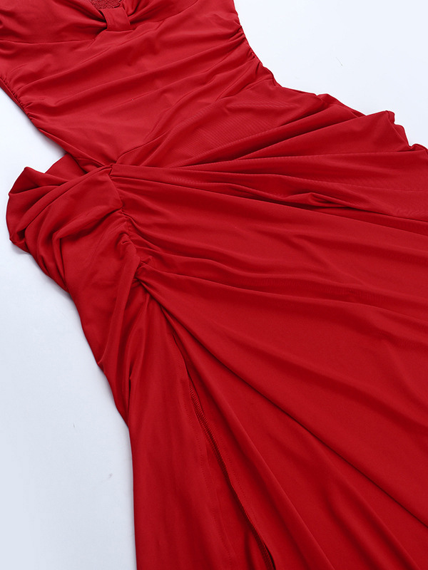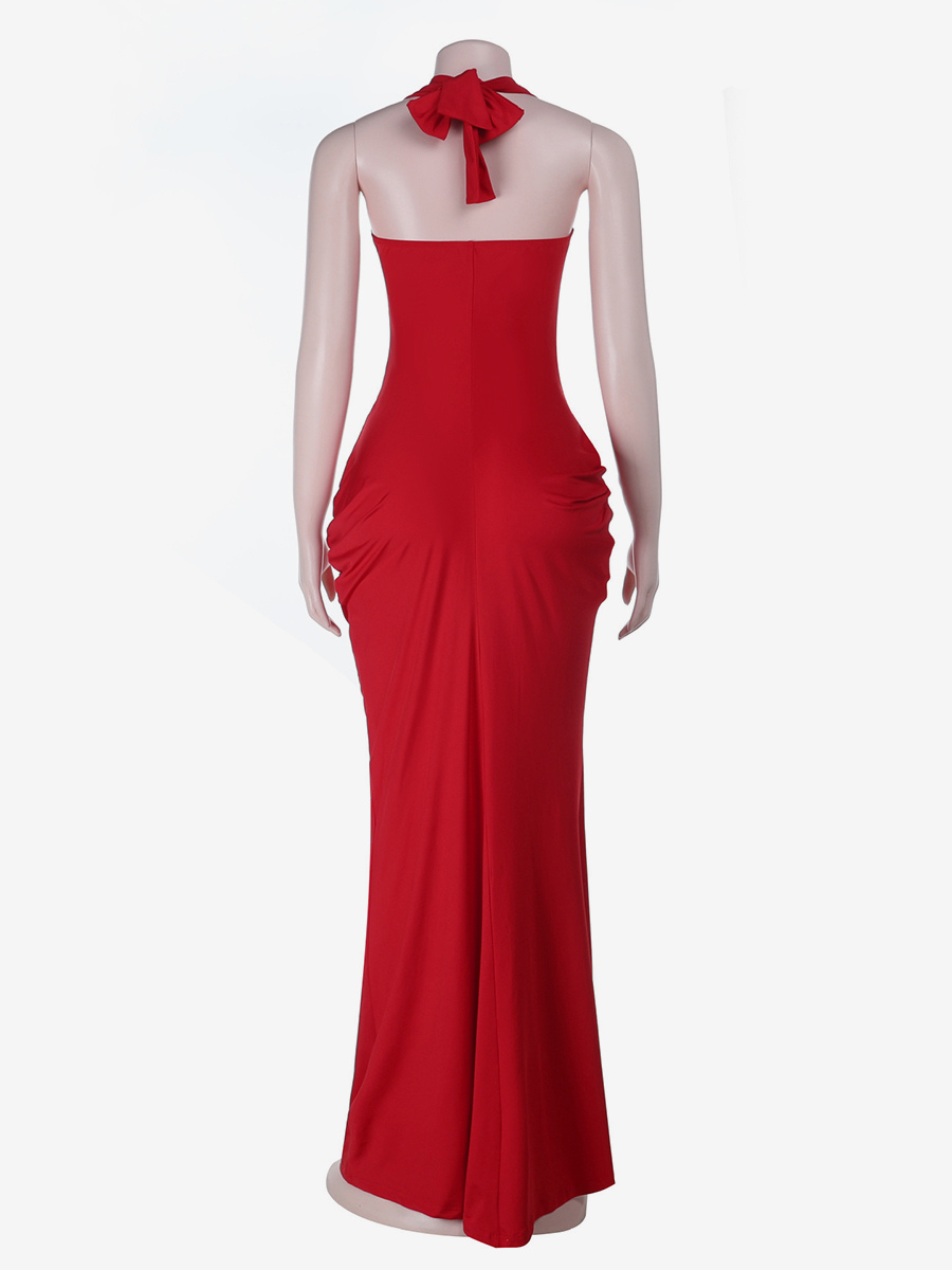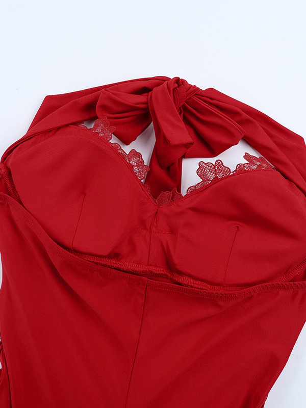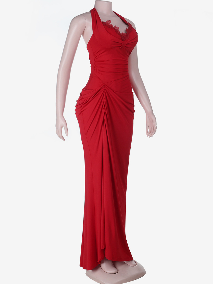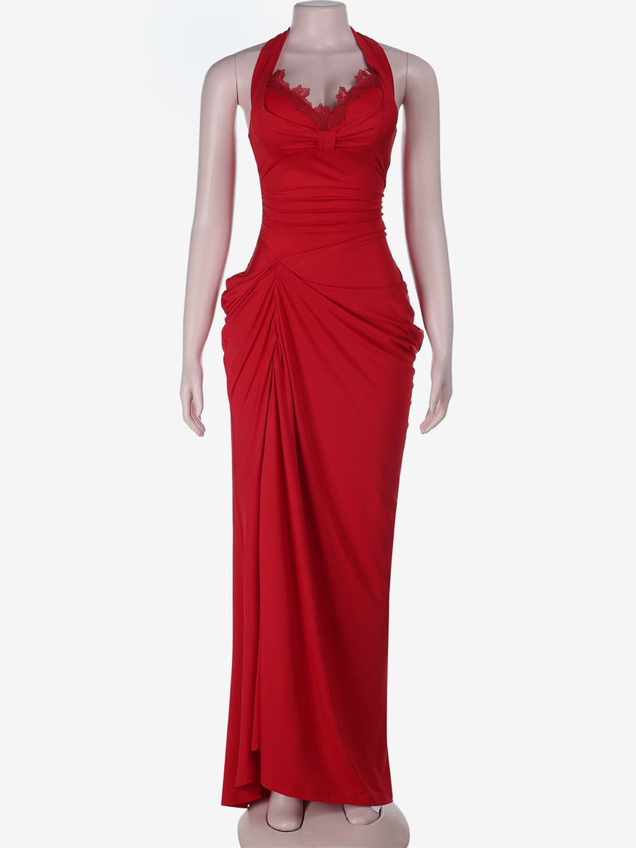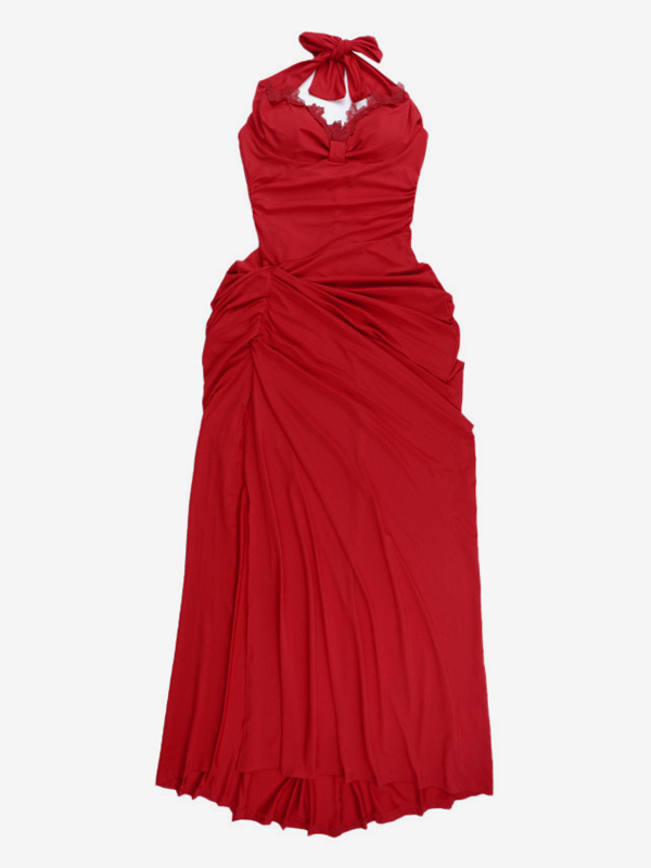 ハイカットスリット入りホルターネックドレス(女性用) - レッドのセクシーな背中開きレーストリムマキシドレス - 2026年春のガラパーティー、プロム、イブニングパーティーに最適