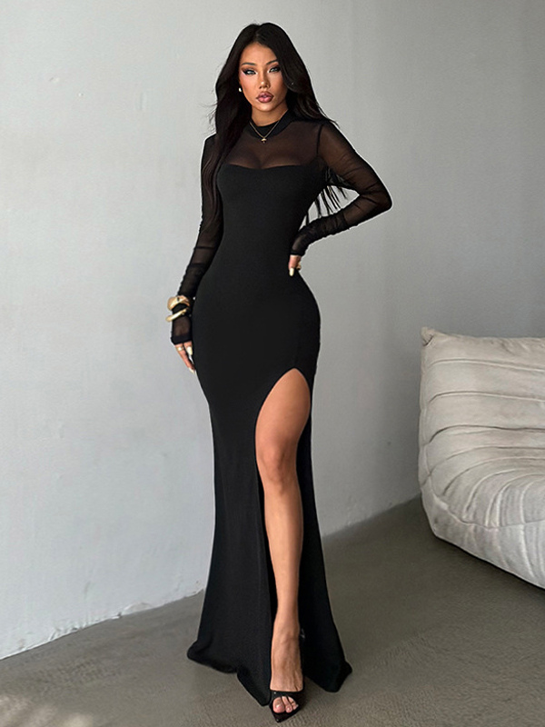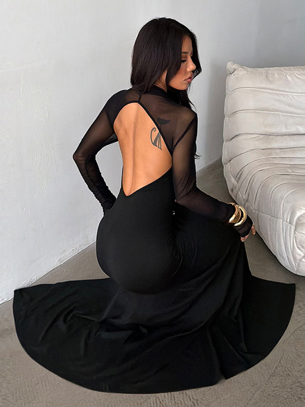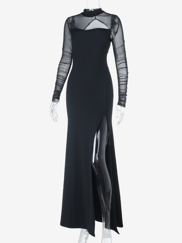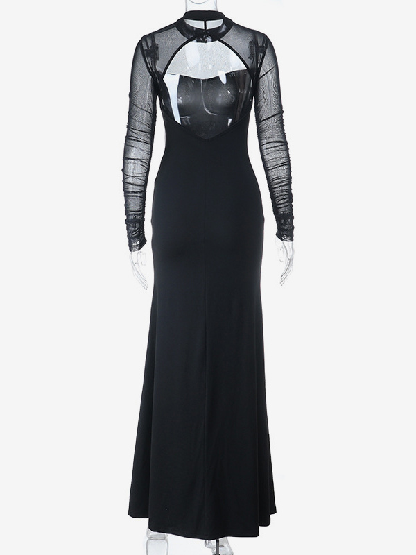 ハイカットスリットメッシュスリーブレディースマキシドレス - セクシーなオープンバックスリムブラックボディコン - ゴスコアパーティナイトアウトフィット2026