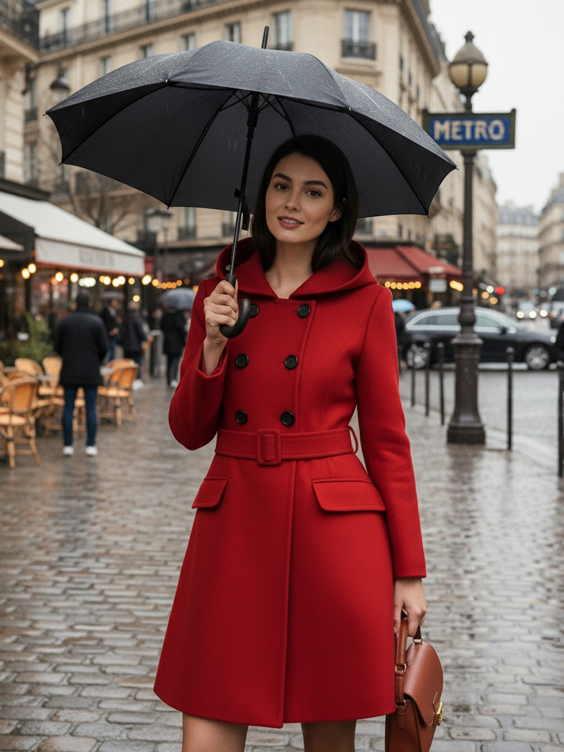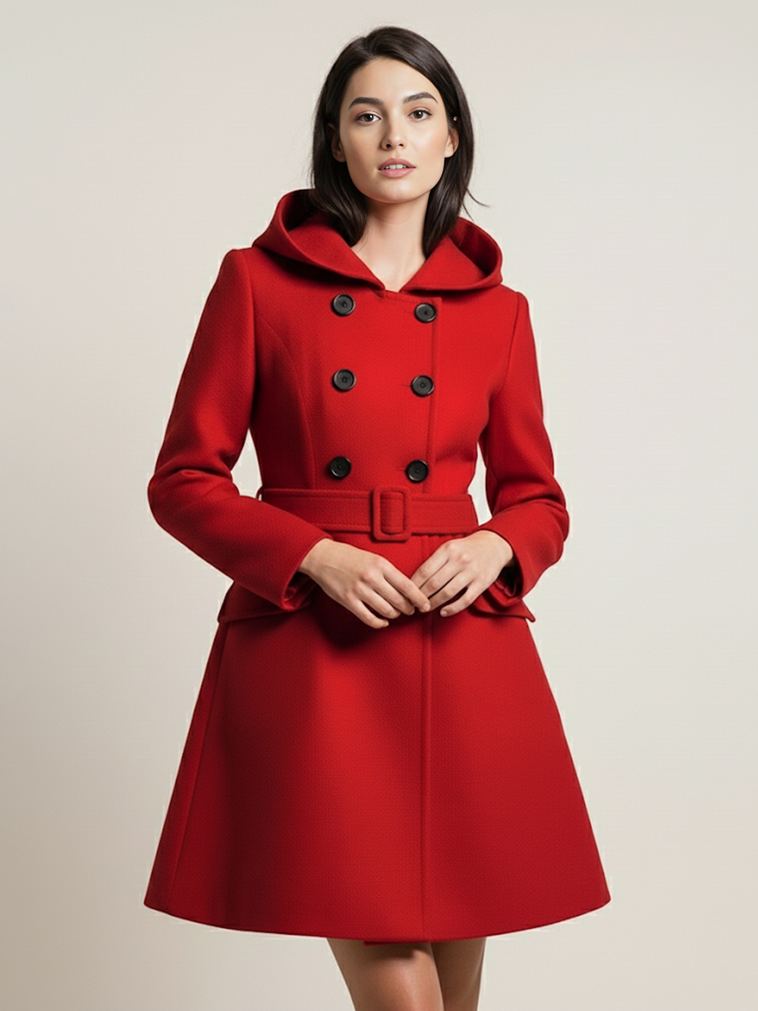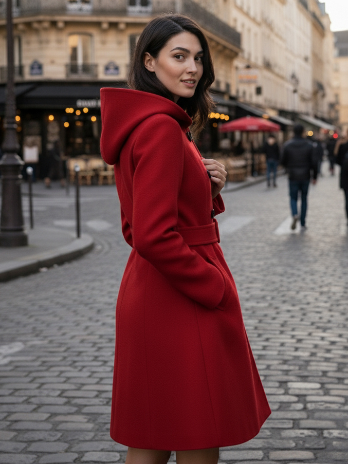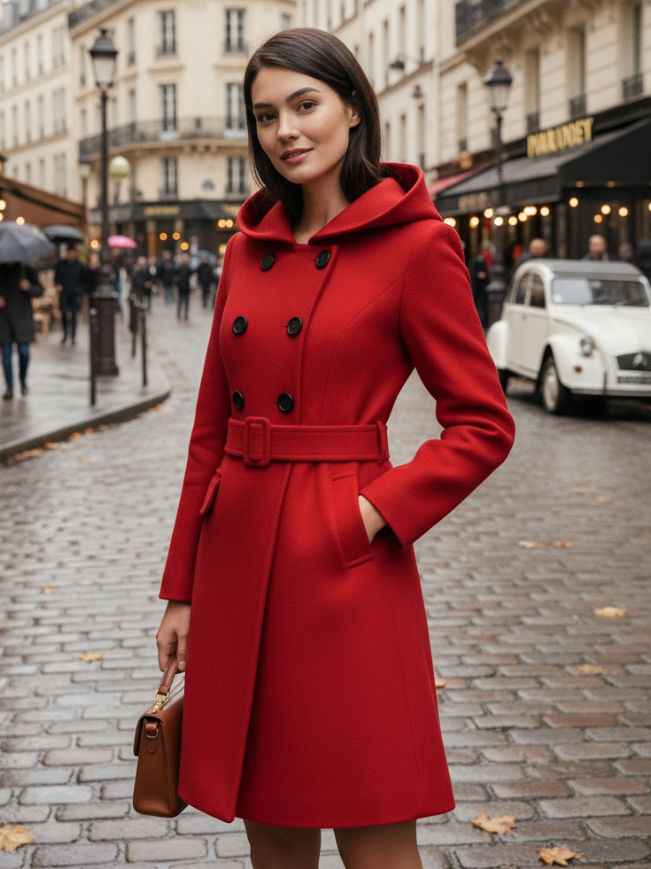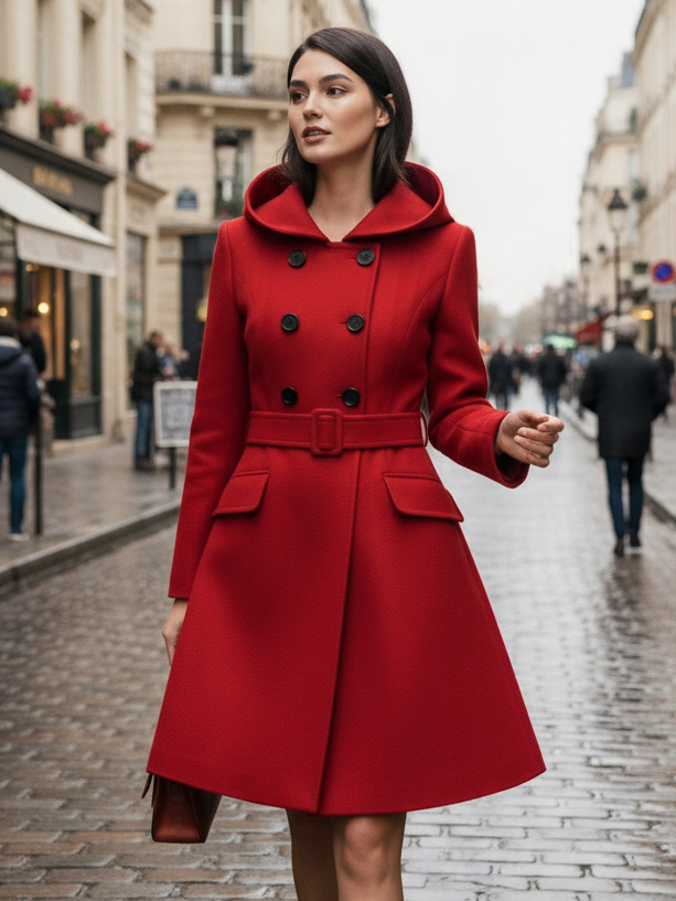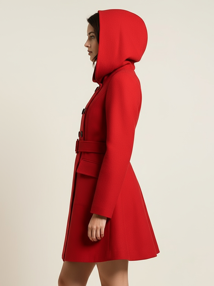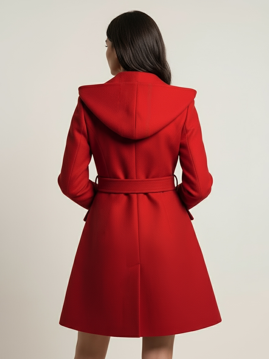 ダブルブレストデザインとベルト付きフード付きAラインミディコート(レディース 2025)
