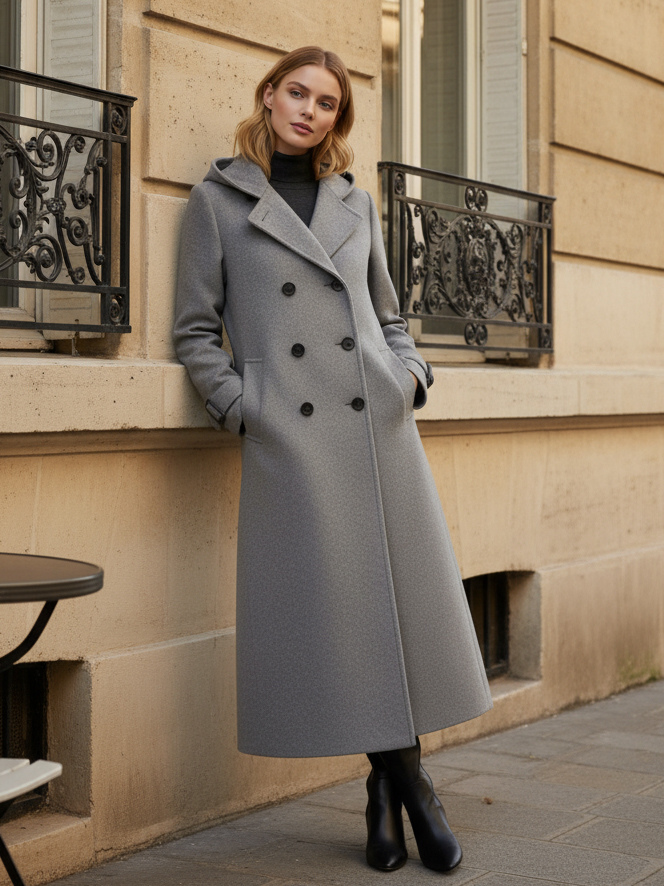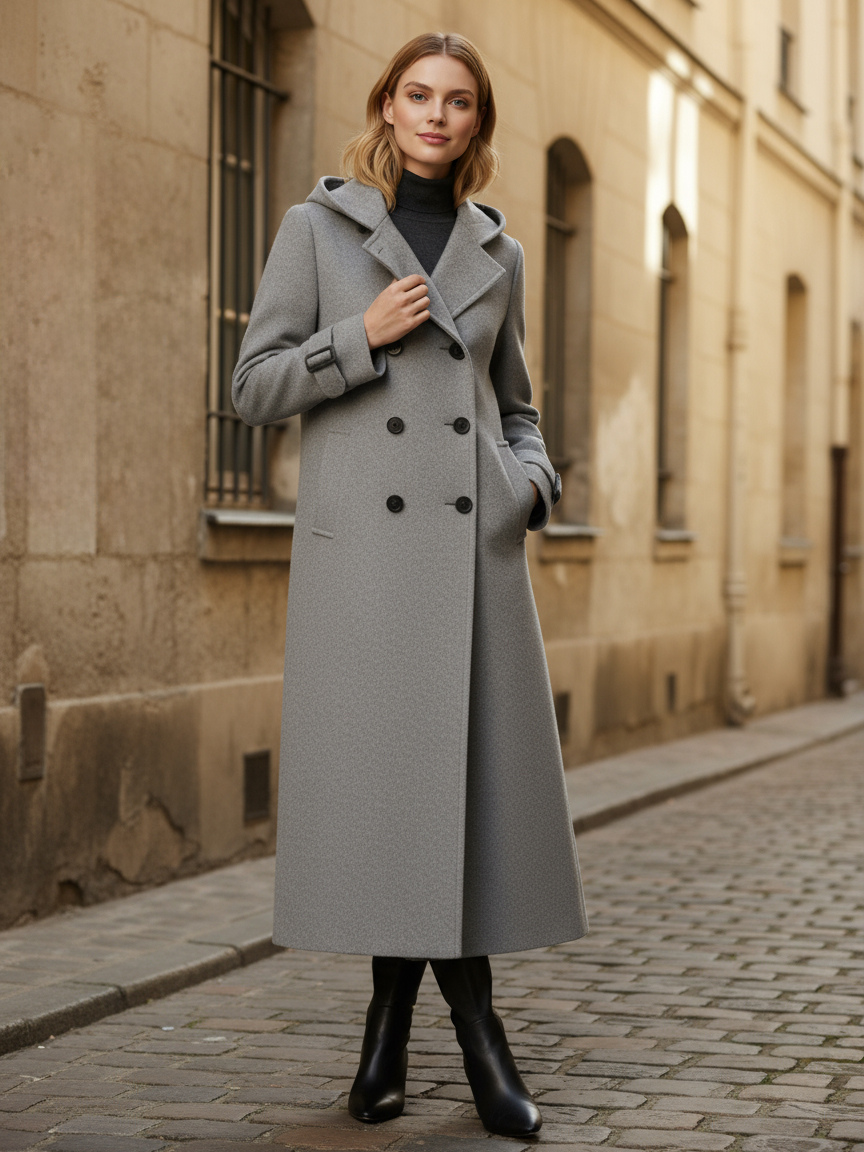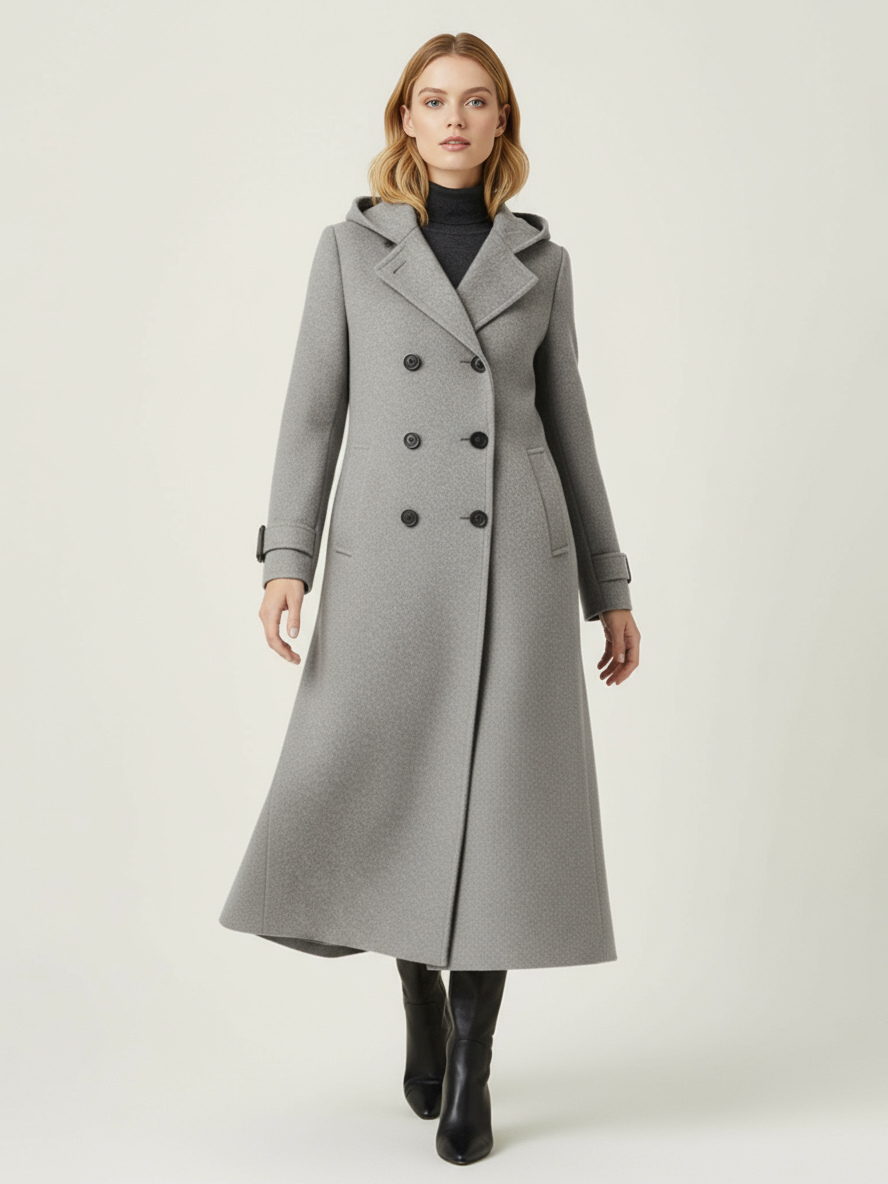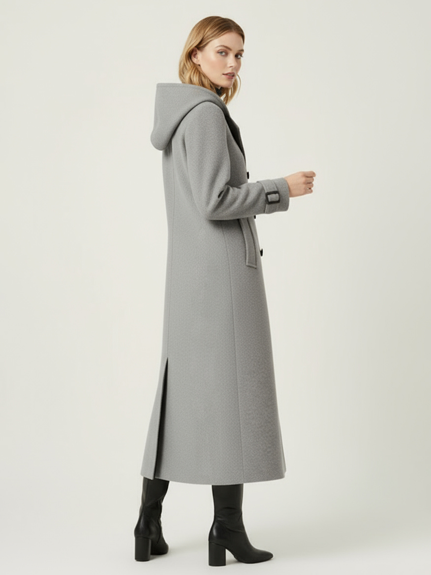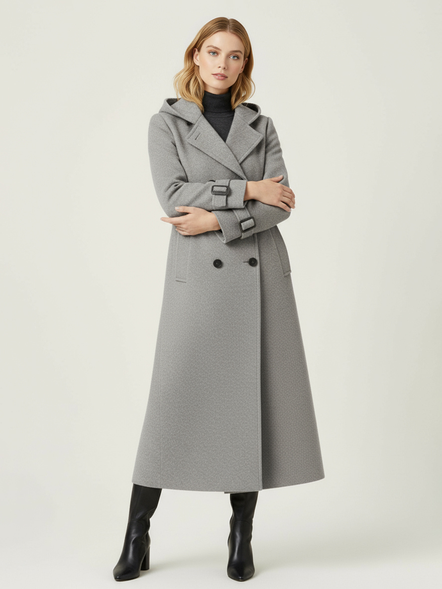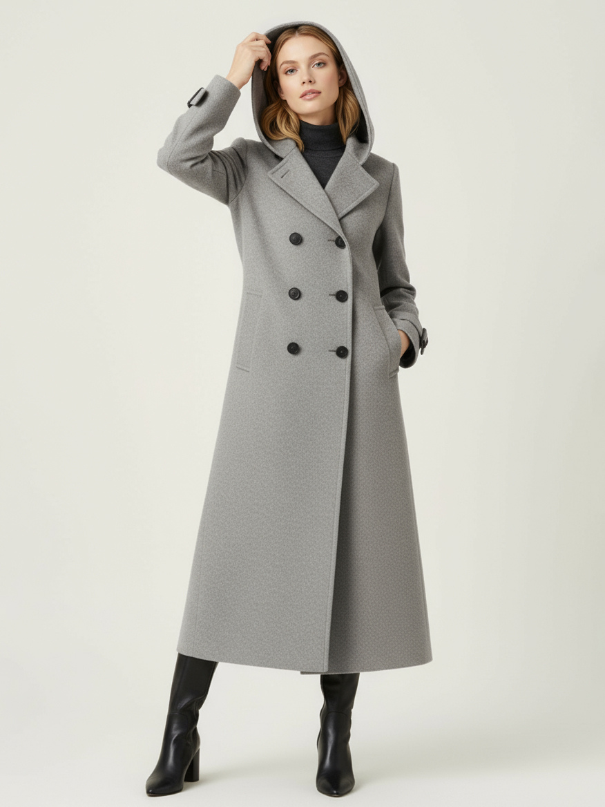 フード付きダブルブレストロングウールコート(袖口タブ付き、レディース)2025年モデル