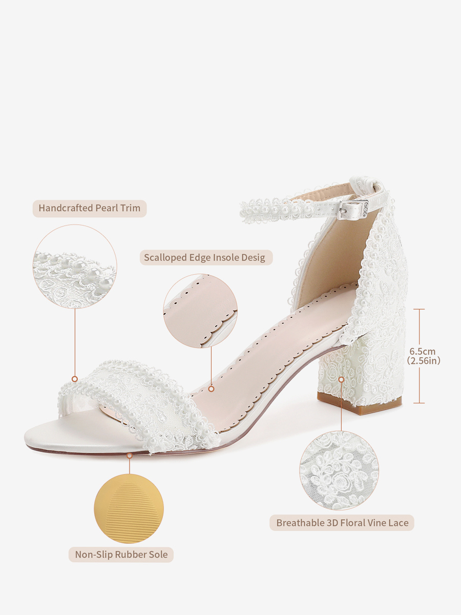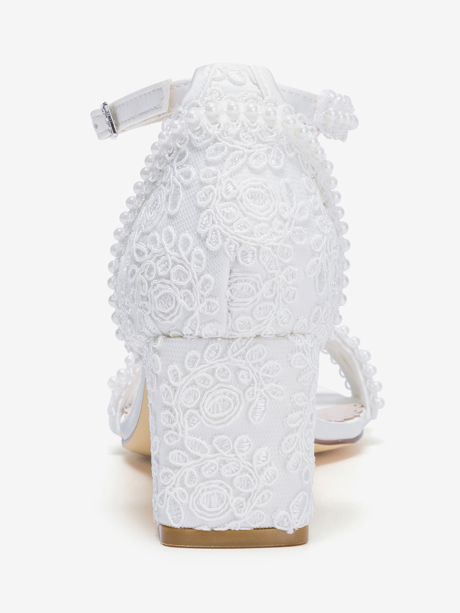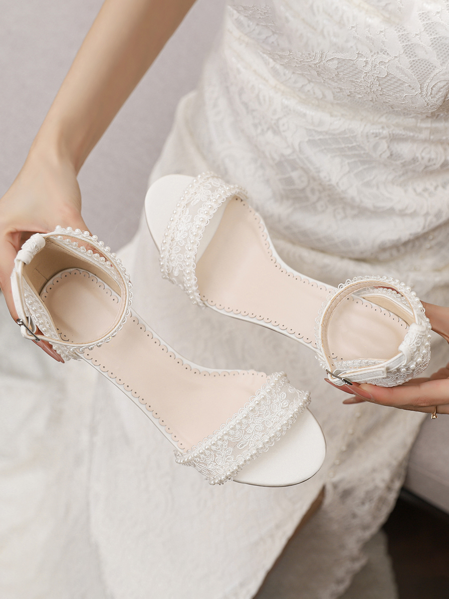 アイボリーウェディングシューズ レースアップリケ オープントゥ チャンキーヒール ブライダルシューズ