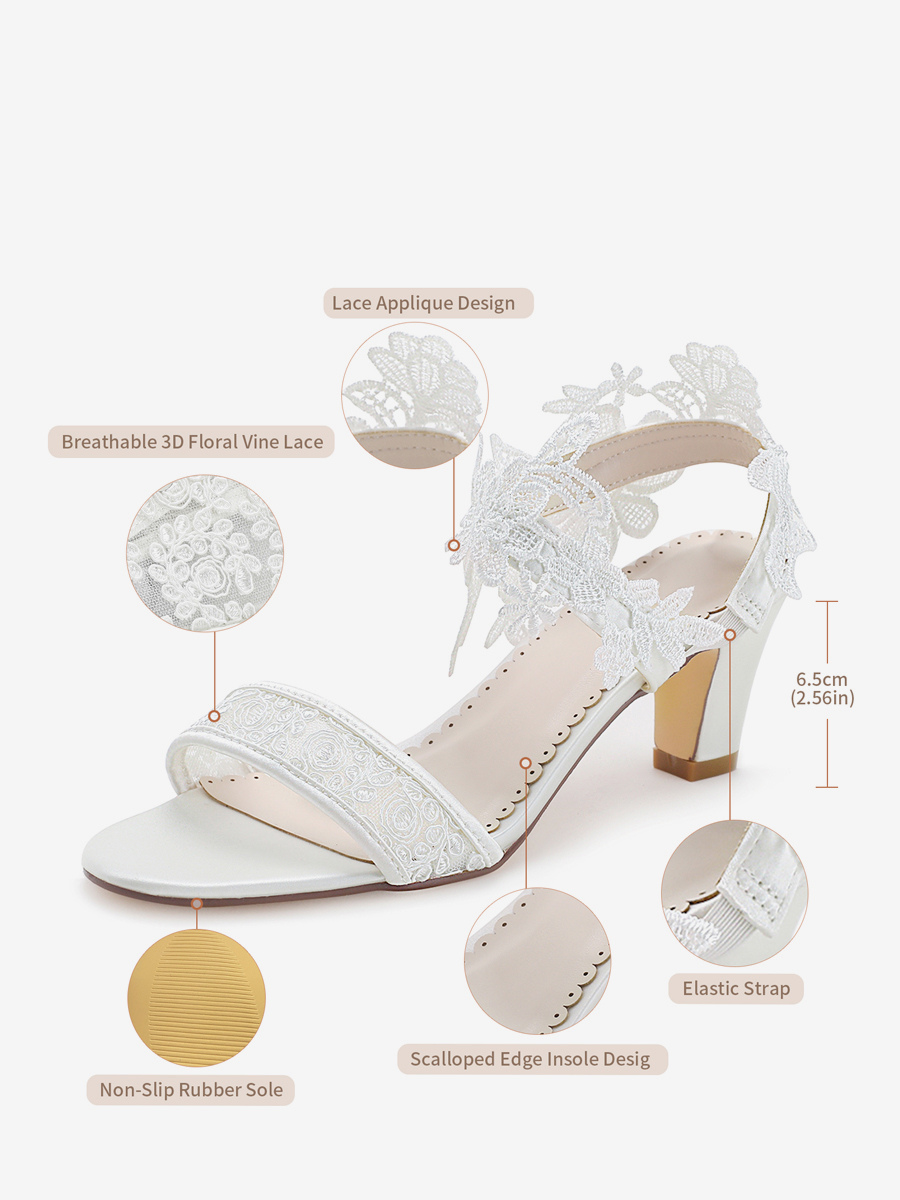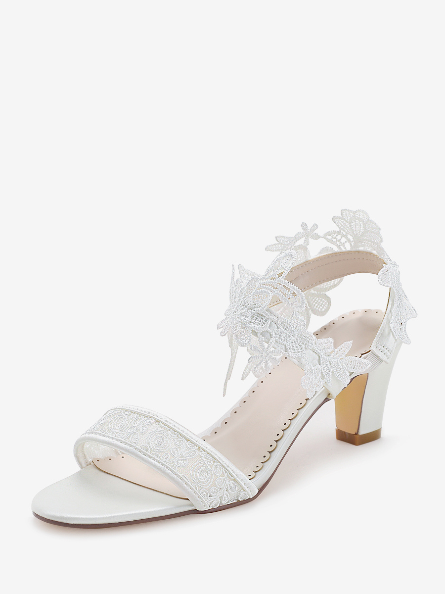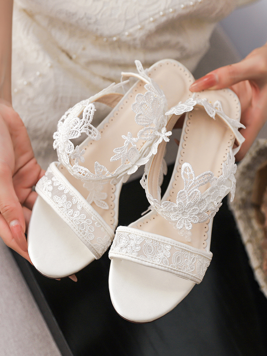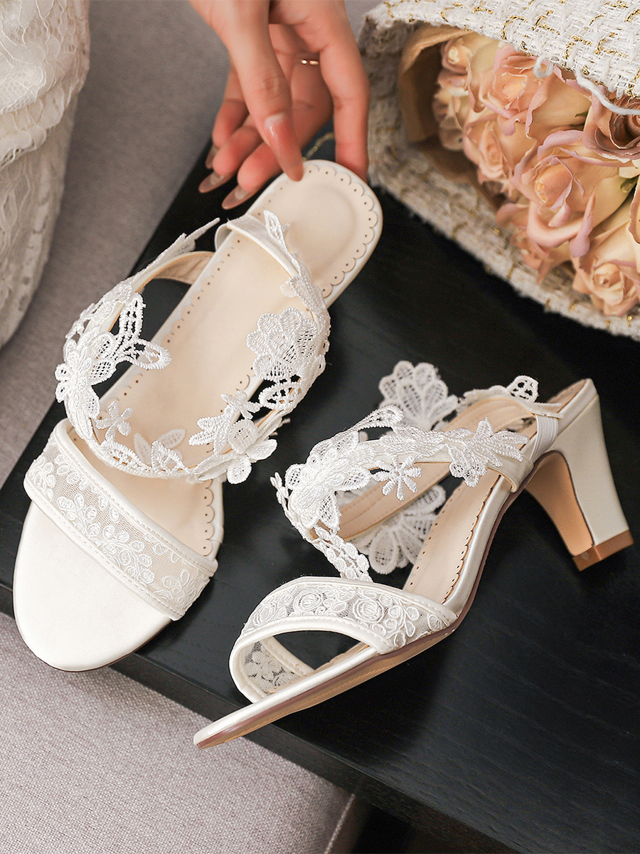 アイボリーウェディングシューズ レース オープントゥ チャンキーヒール ブライダルシューズ