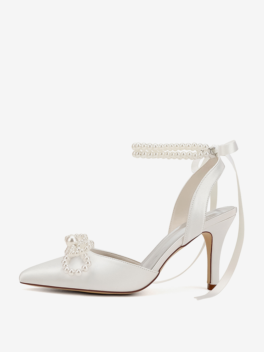 アイボリーウェディングシューズ サテンポインテッドトゥパールボウハイヒールブライダルパーティーシューズ