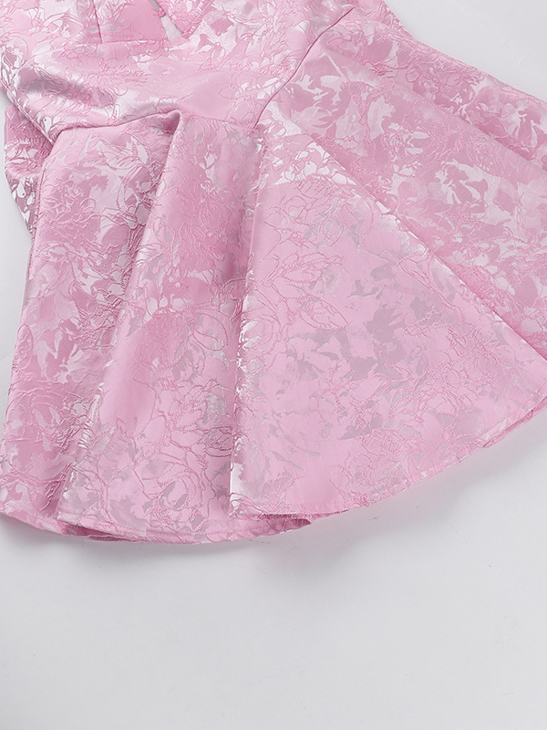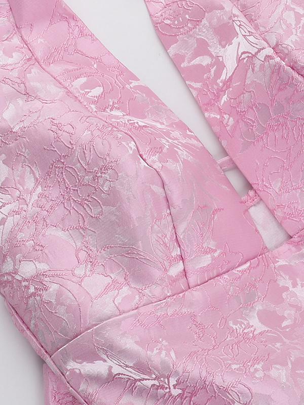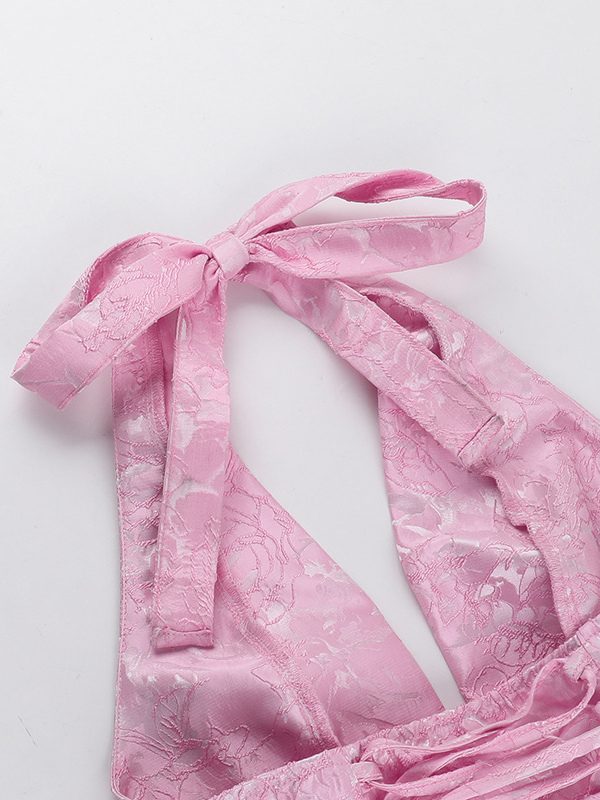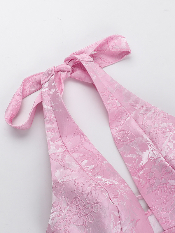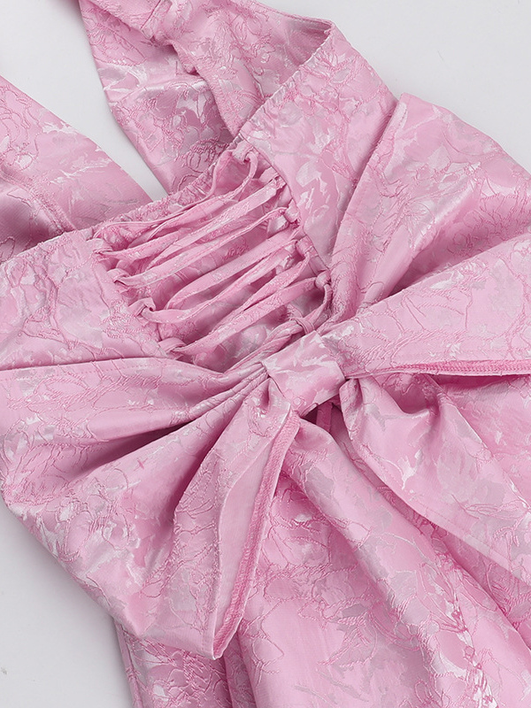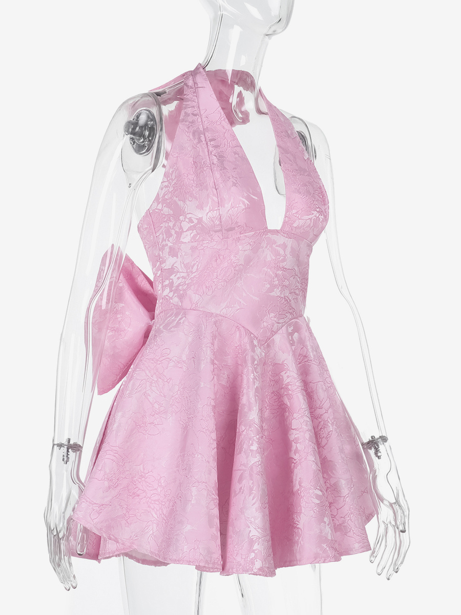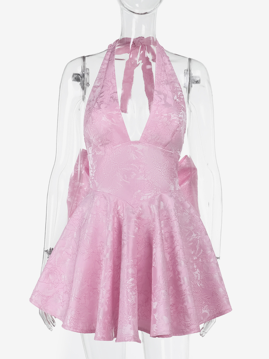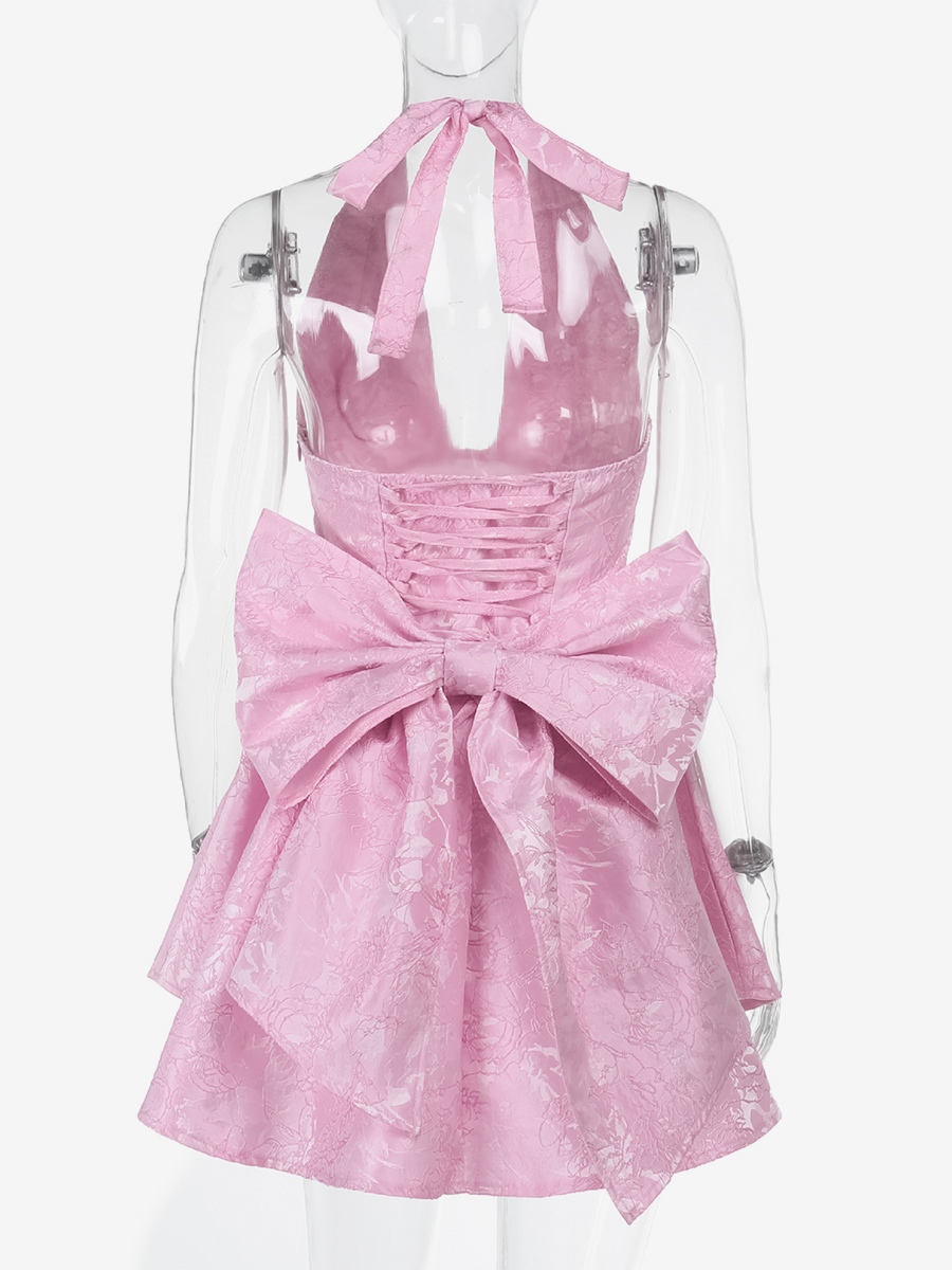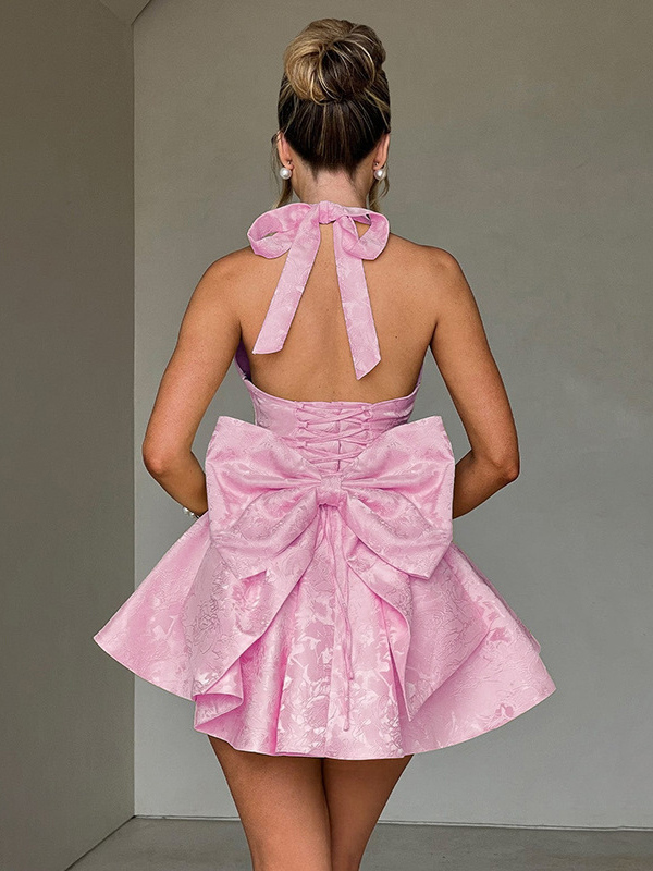 ジャカードコケットミニドレス(女性用) - ホルターネック、レースアップ、大きなリボン、バックスケータースタイル - 夏の誕生日パーティー衣装 2026