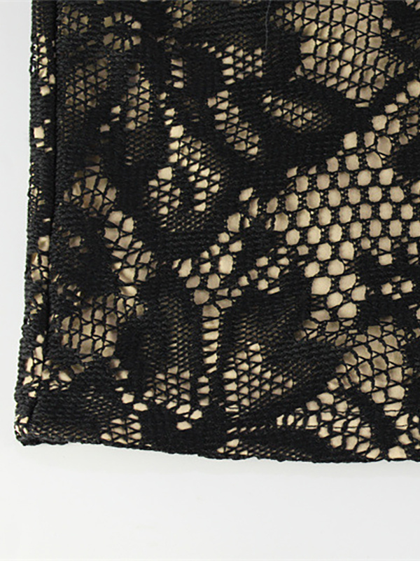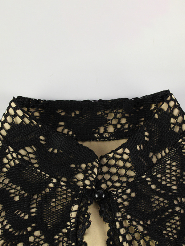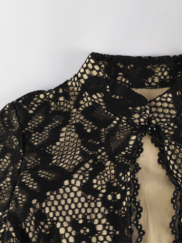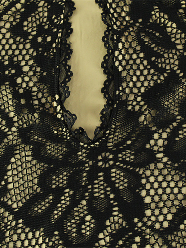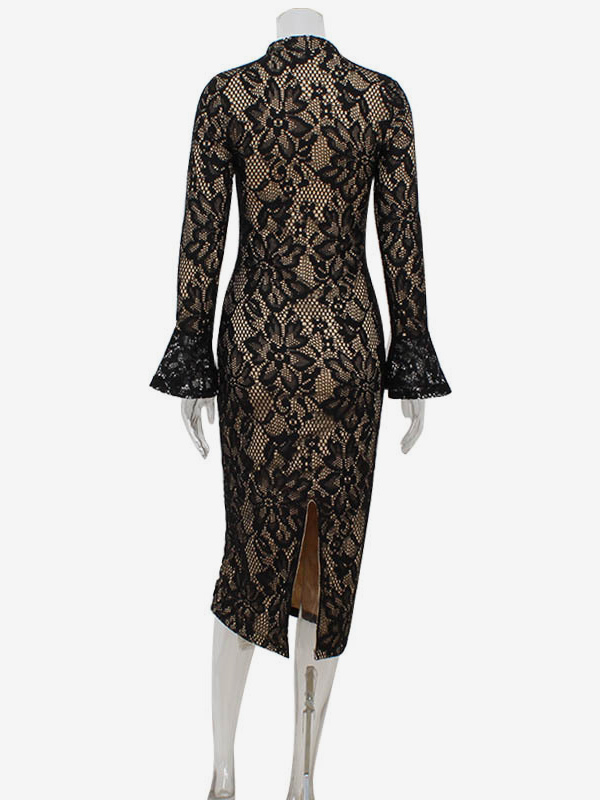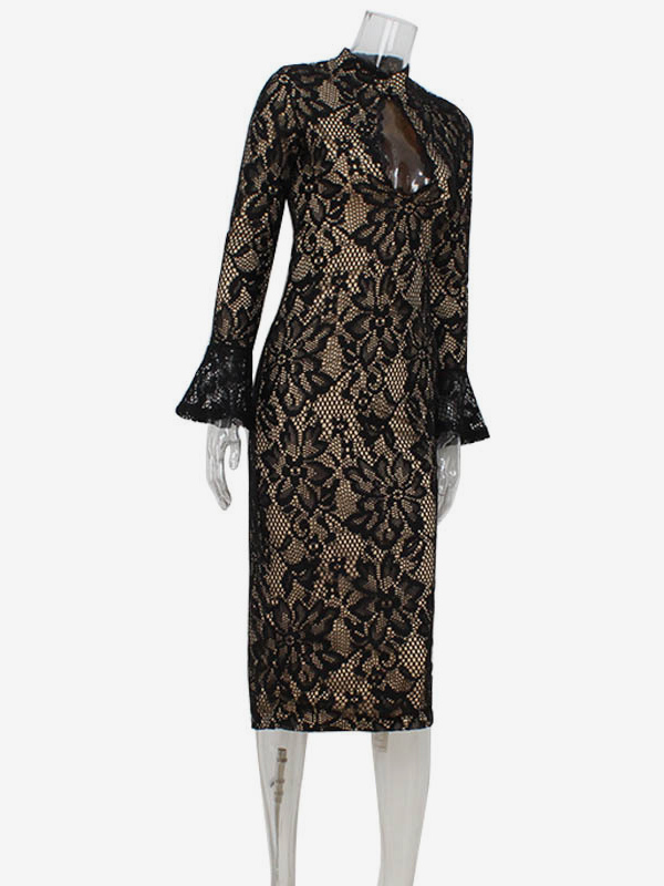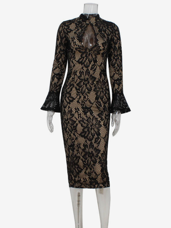 レースボディコンミディドレス(レディース) - ブラック ヴィンテージキーホールベルスリーブバックスリットシースドレス - 2026年春のカクテルパーティー