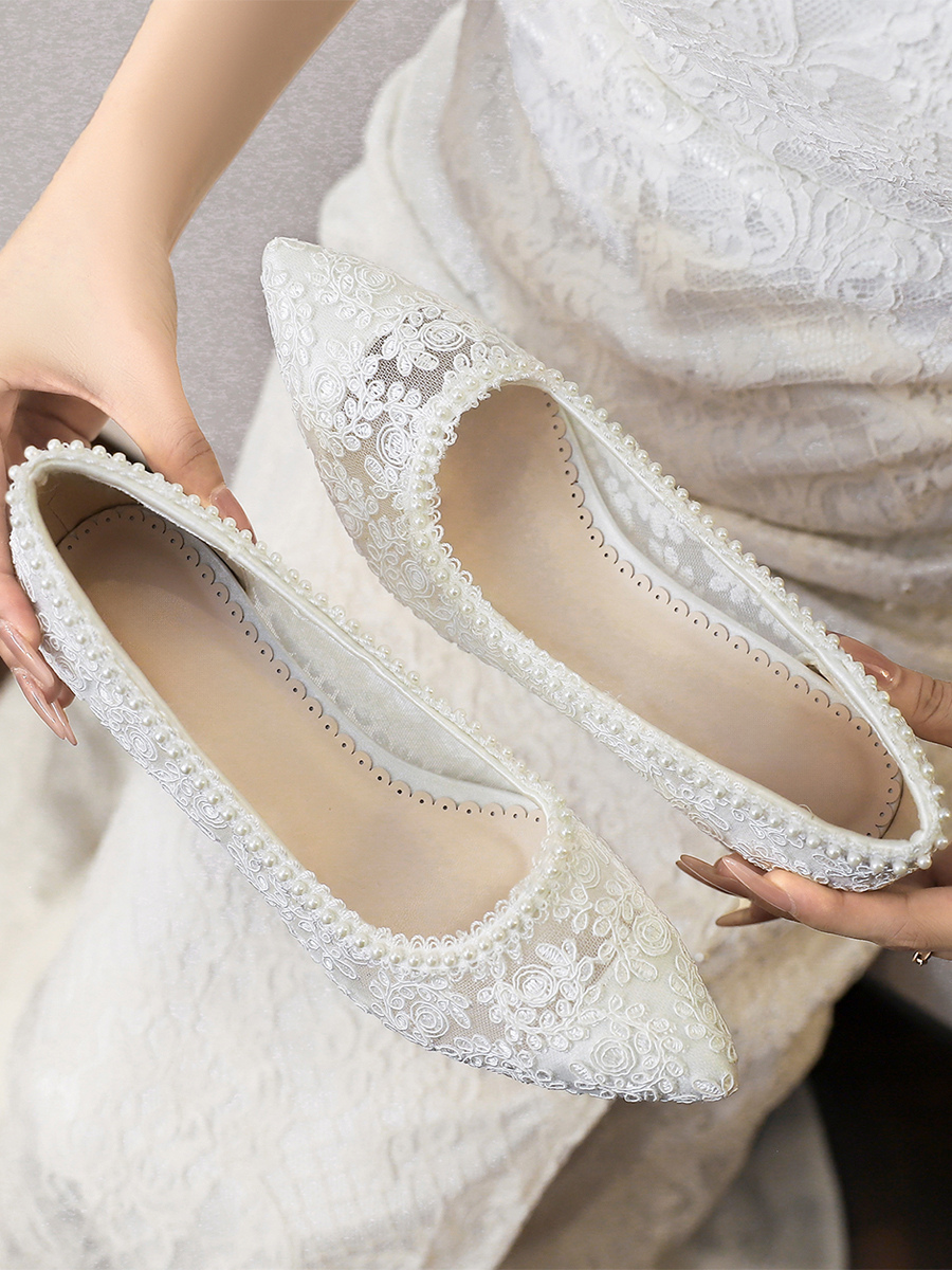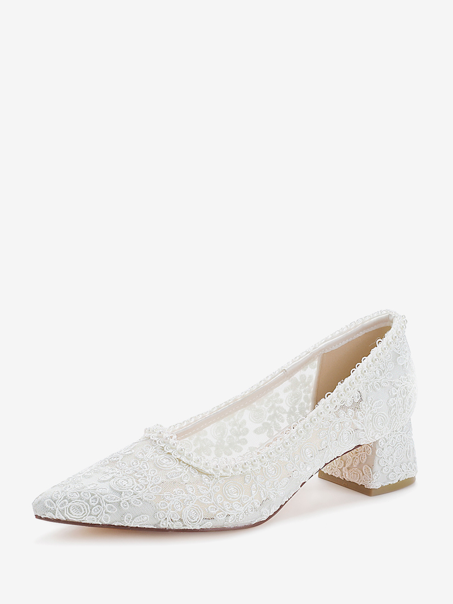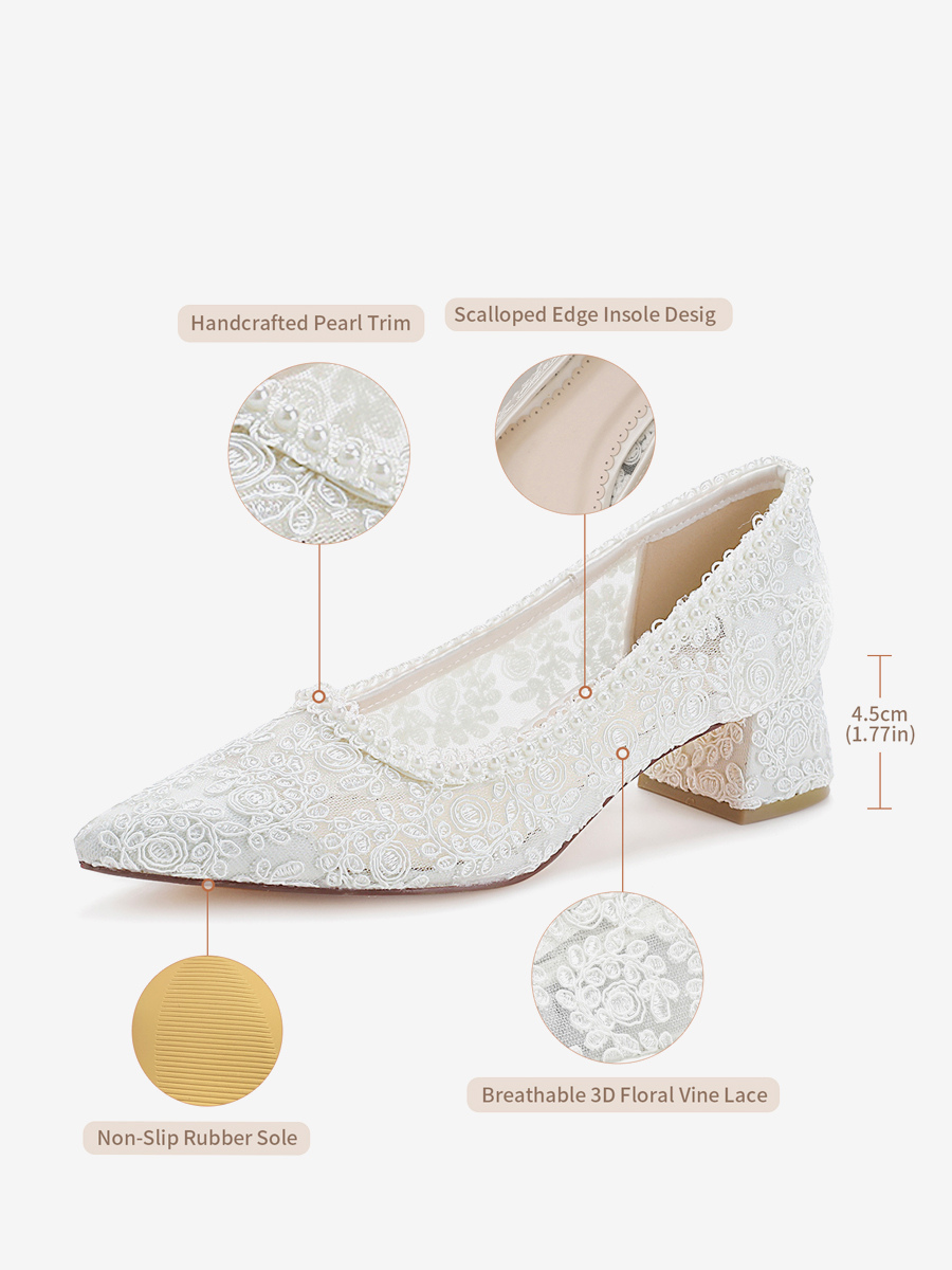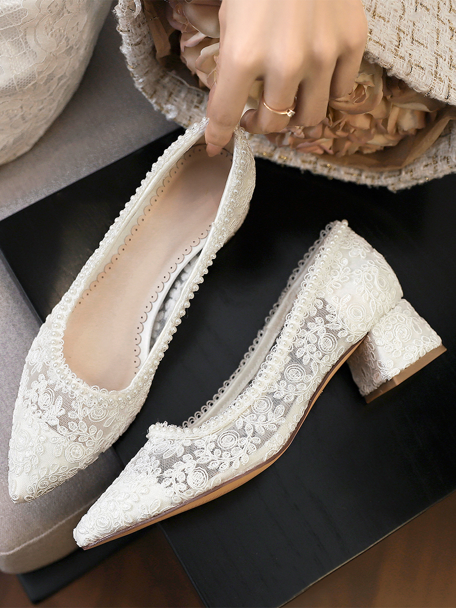 レースブライダルシューズ ポインテッドトゥ チャンキーヒール ウェディングシューズ