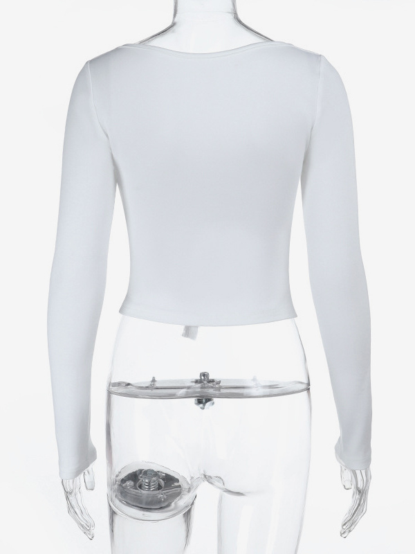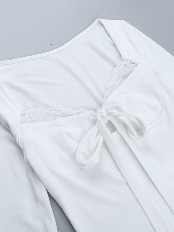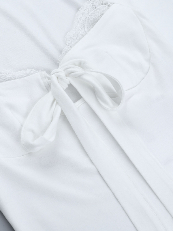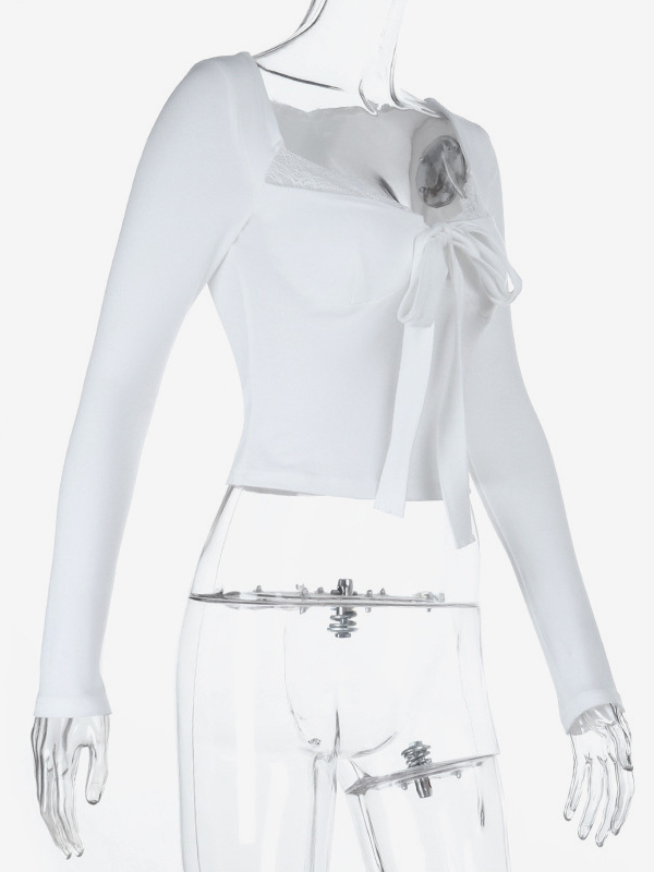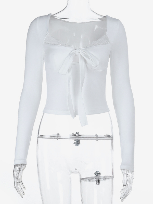 レーストリム ボウタイ フロント クロップドトップ レディース - ホワイト スリムフィット 長袖 フェアリーコア ブラウス - 春のナイトアウト クラブウェア 2026