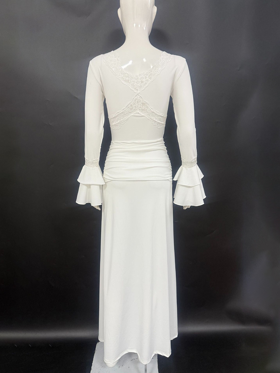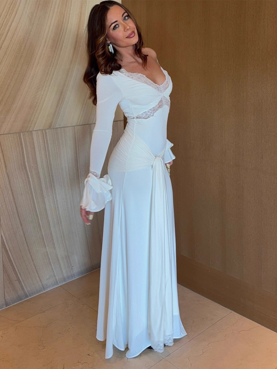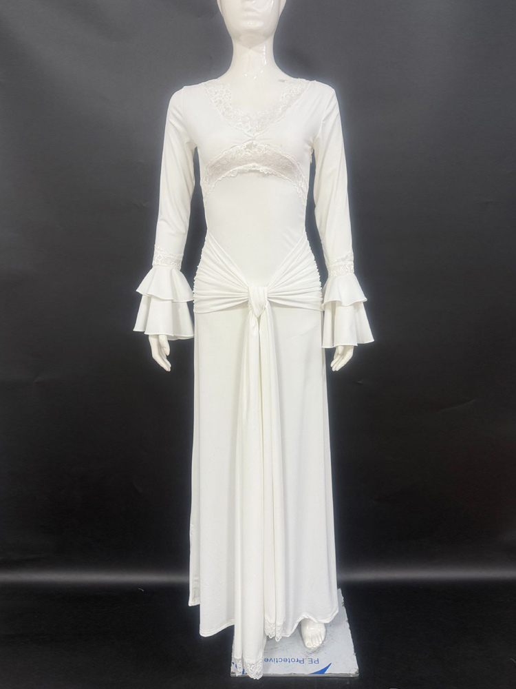 レーストリムVネックマキシドレス(レディース) - ホワイトボヘミアン長袖トランペットカフボディコンガウン - 2026年春ビーチブライダルパーティー