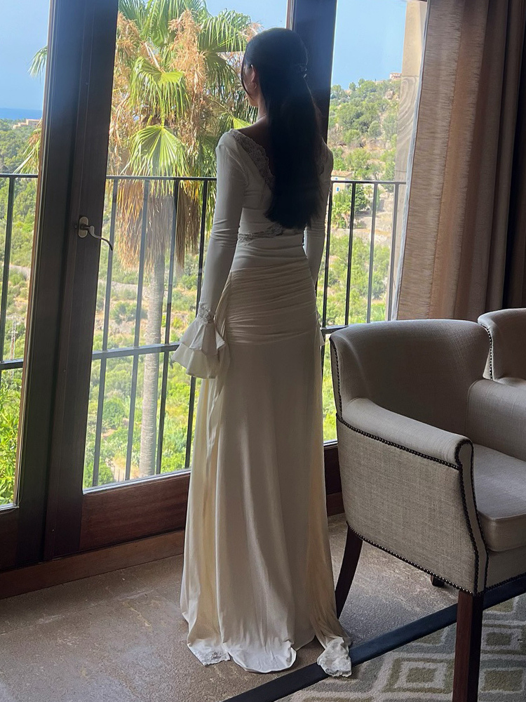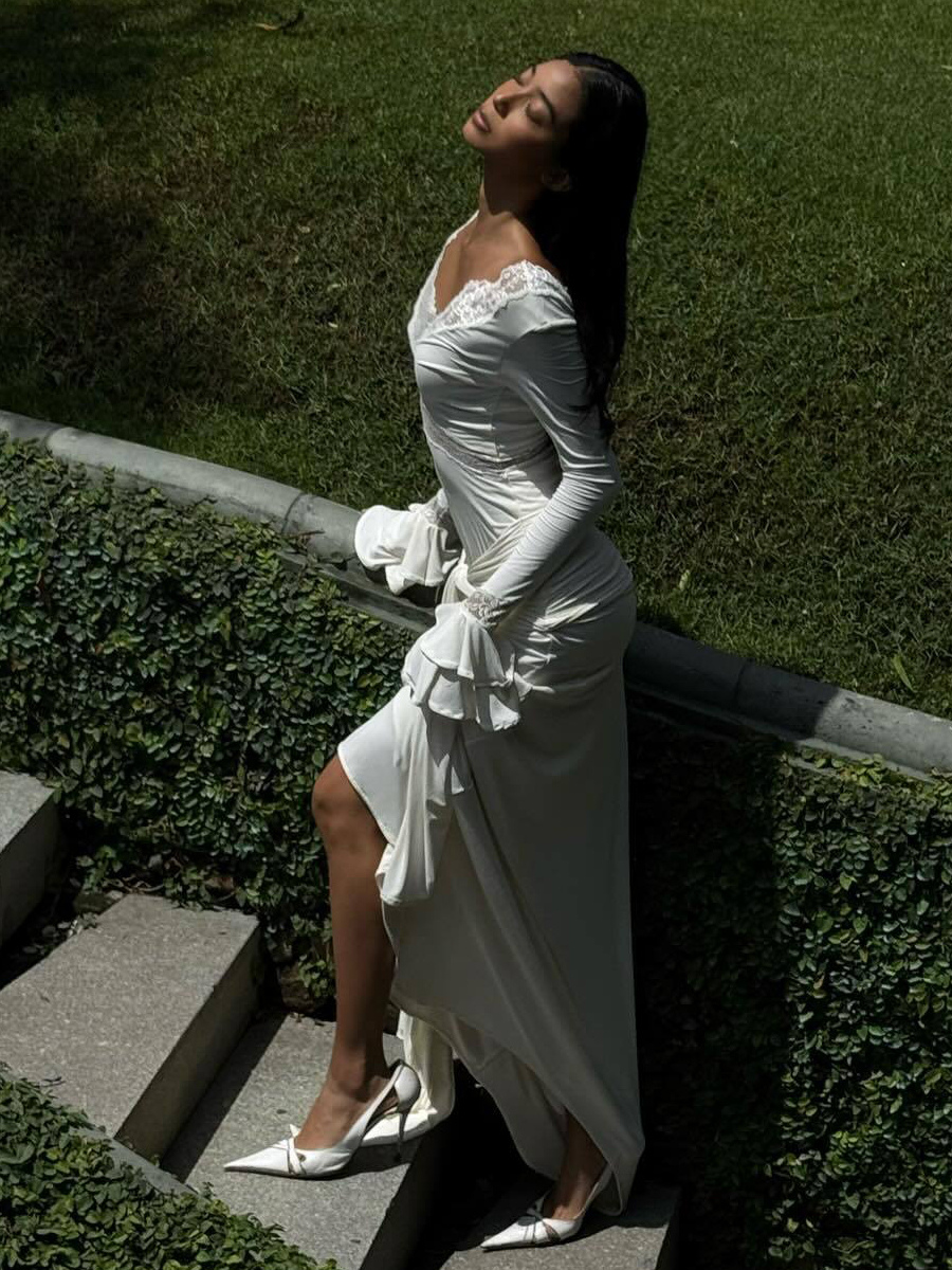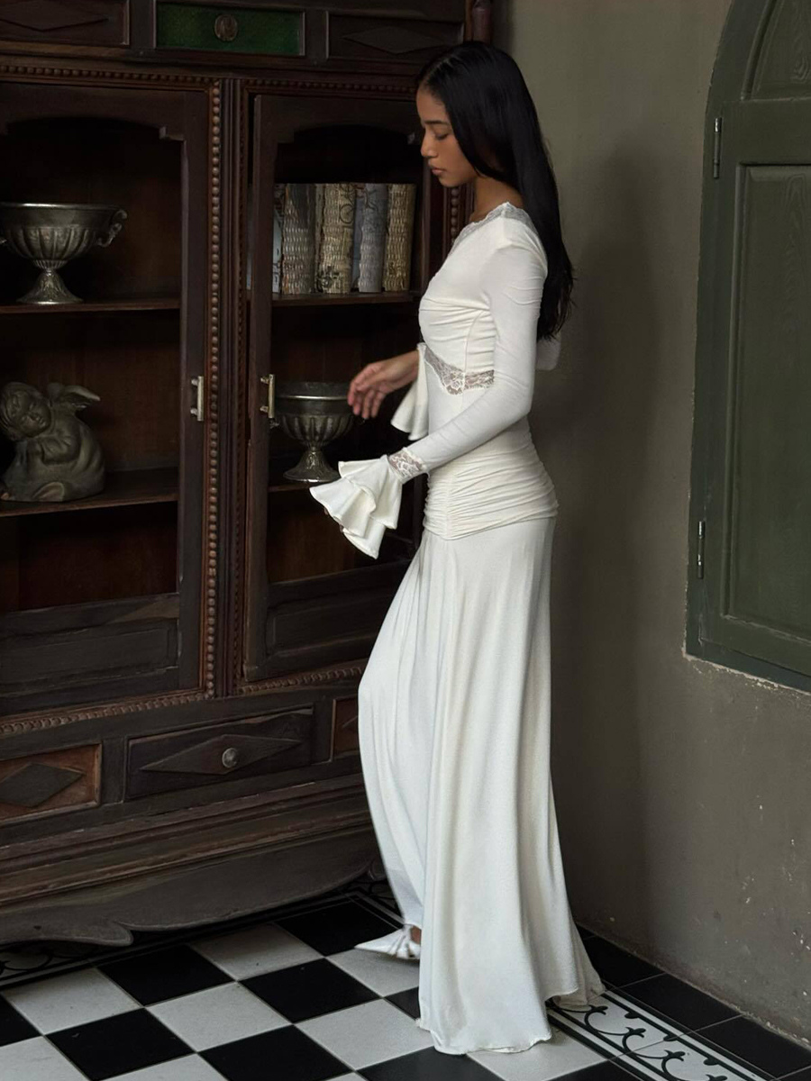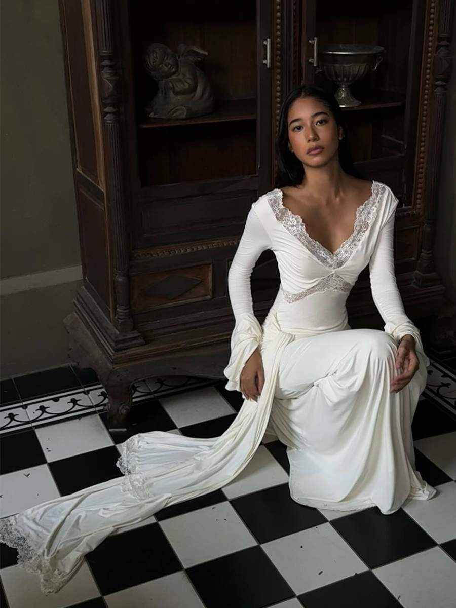 レーストリムVネックマキシドレス(レディース) - ホワイトボヘミアン長袖トランペットカフボディコンガウン - 2026年春ビーチブライダルパーティー