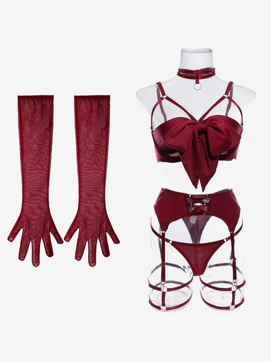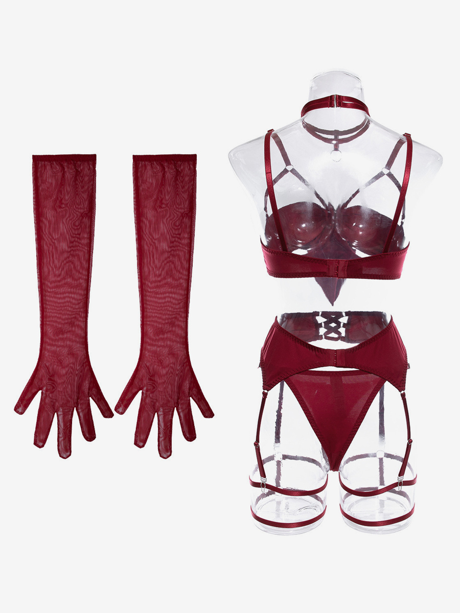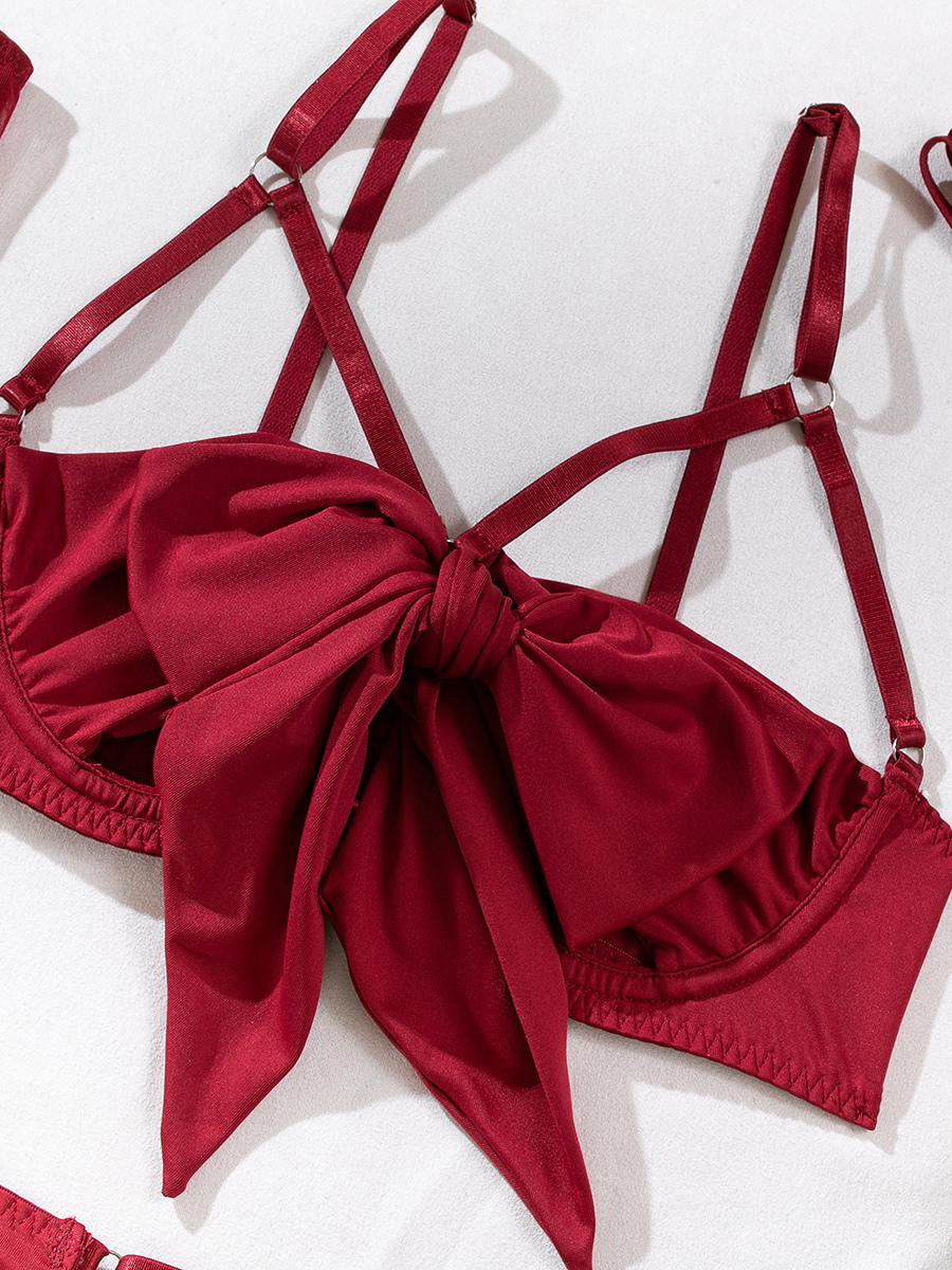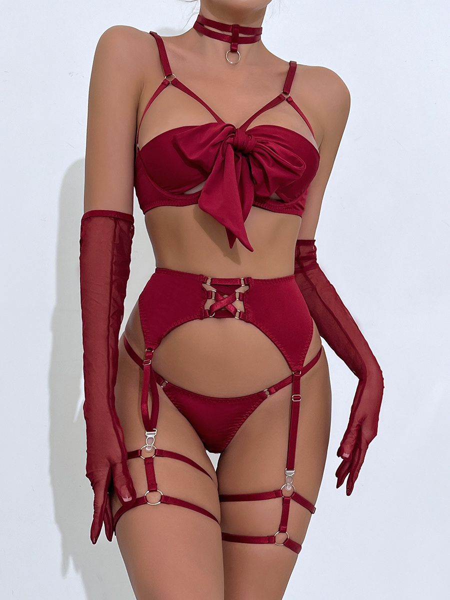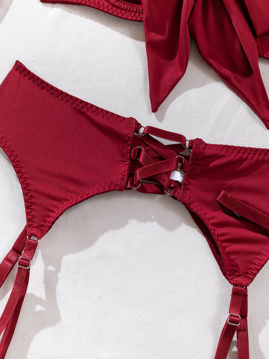 レースアップランジェリー バーガンディ 5点セット ブラジャー&ショーツ