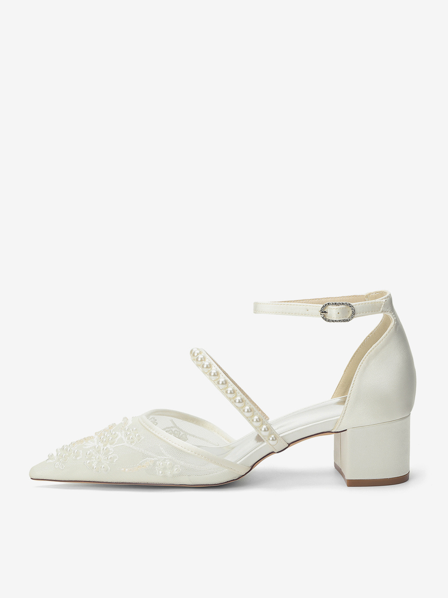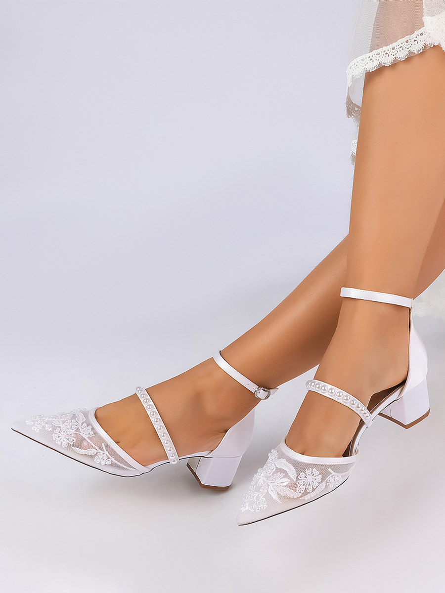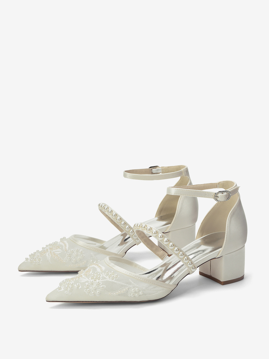 レースウェディングシューズ チャンキーヒール ポインテッドトゥ パール ローヒール ブライダルシューズ