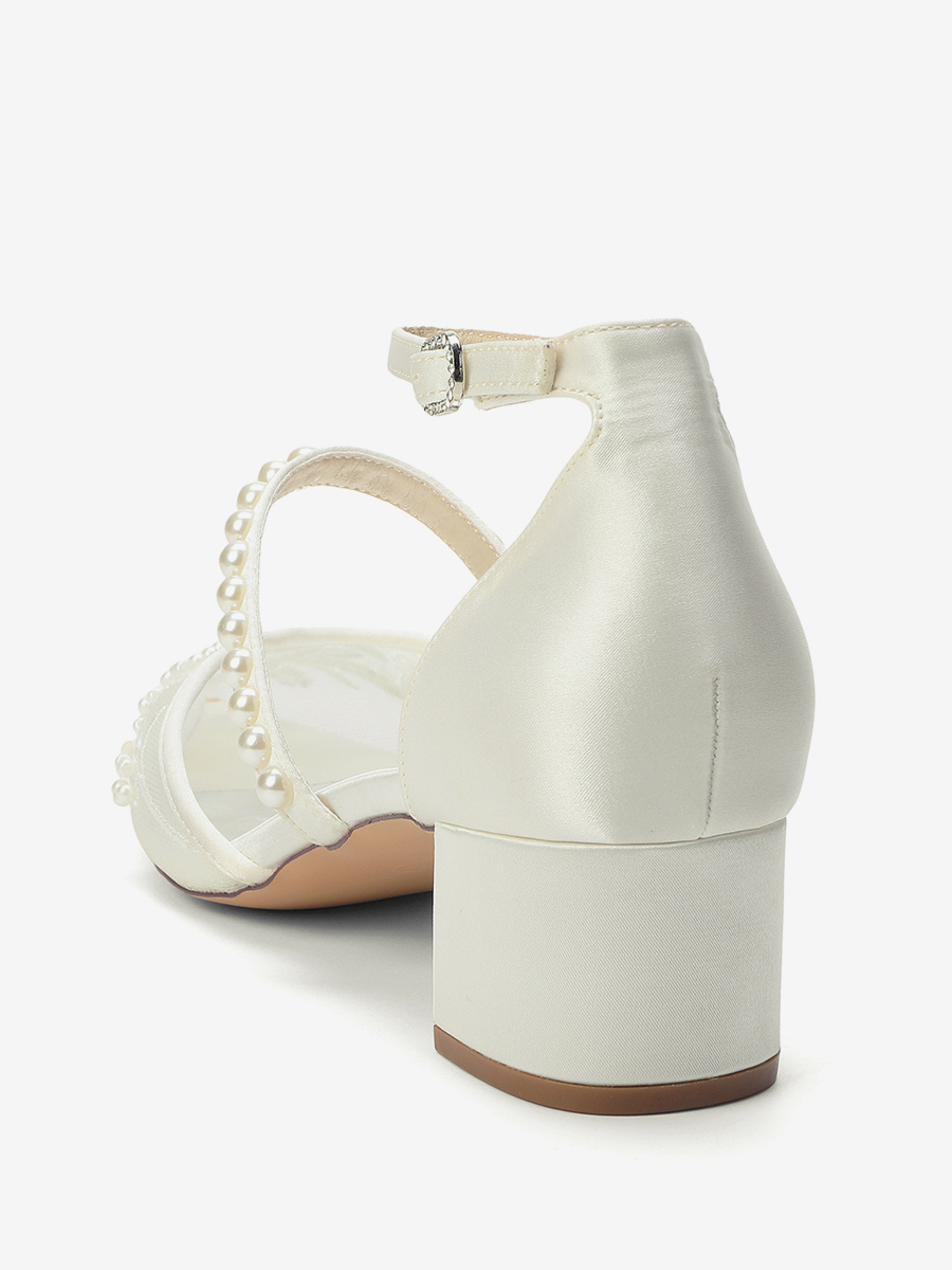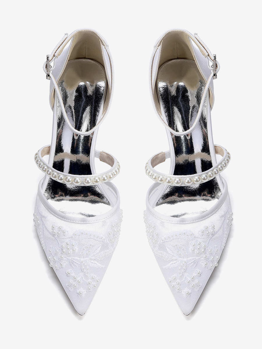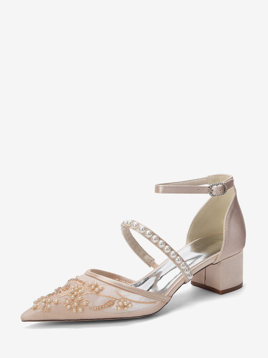 レースウェディングシューズ チャンキーヒール ポインテッドトゥ パール ローヒール ブライダルシューズ