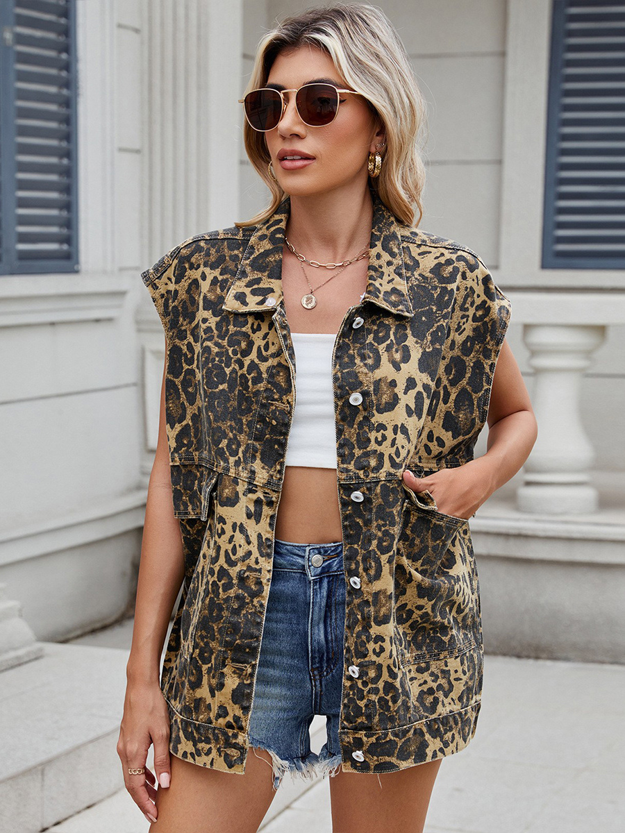 ヒョウ柄デニムベスト(レディース) - アニマル柄オーバーサイズノースリーブジーンズジャケットコート - 2026年春夏ストリートウェア