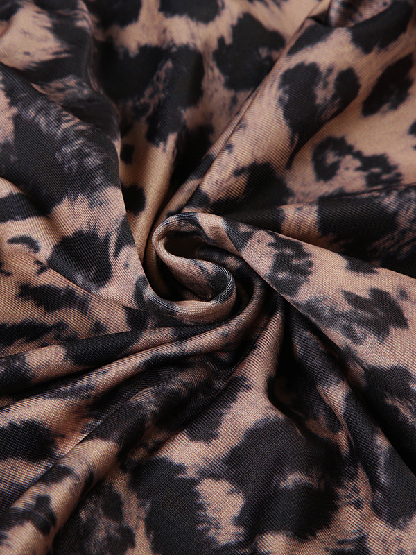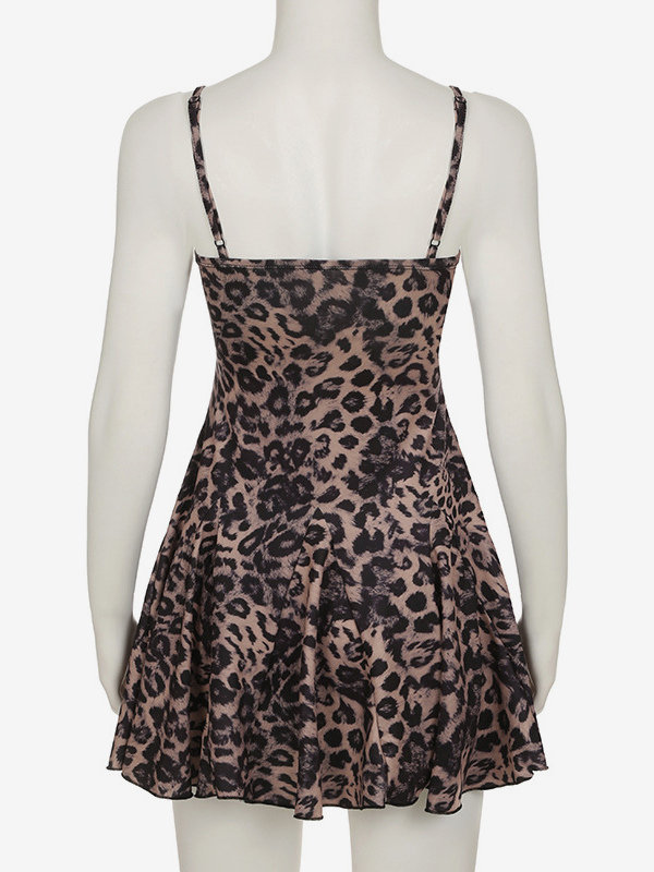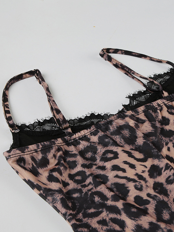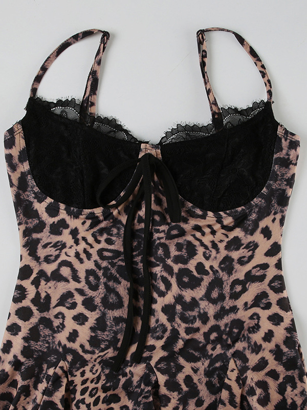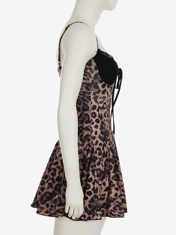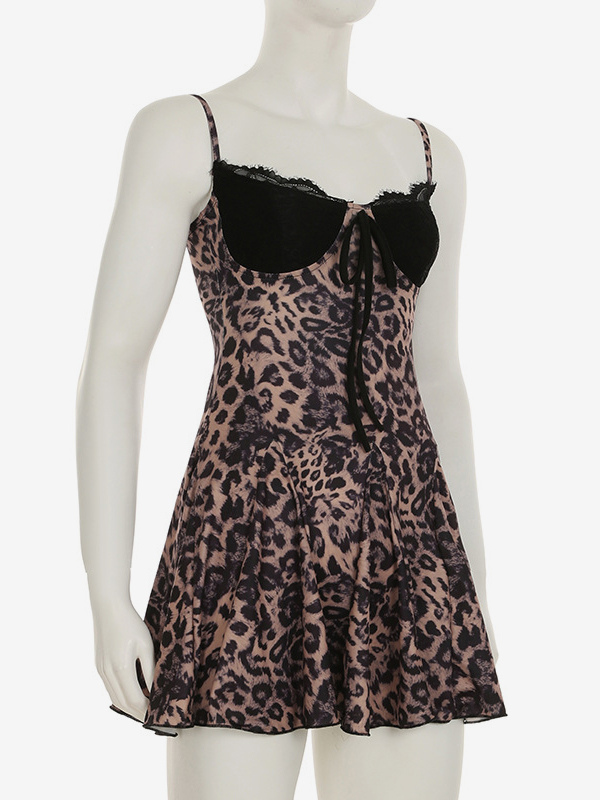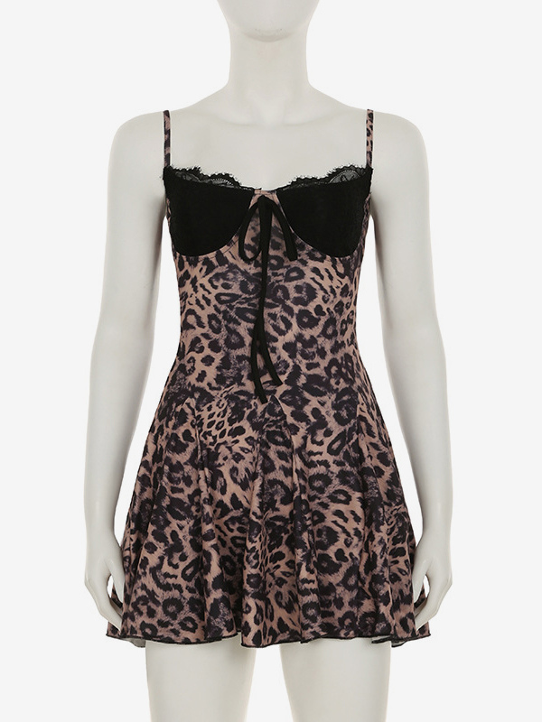 クラブ2025のための、レースとタイフロントのディテールが施されたヒョウ柄ミニストラップドレス