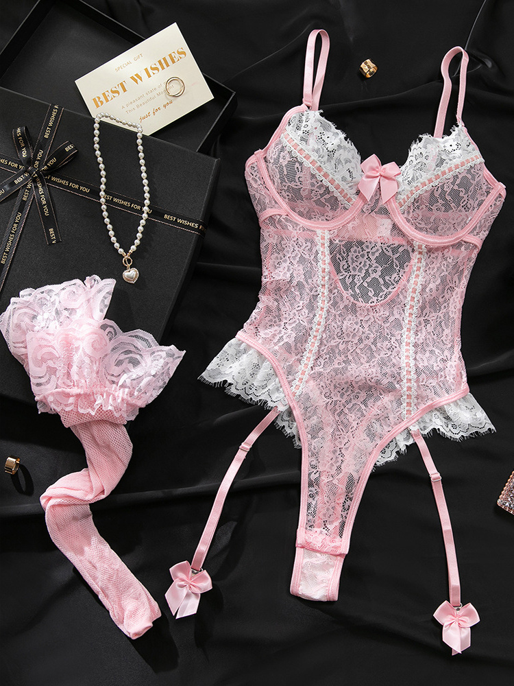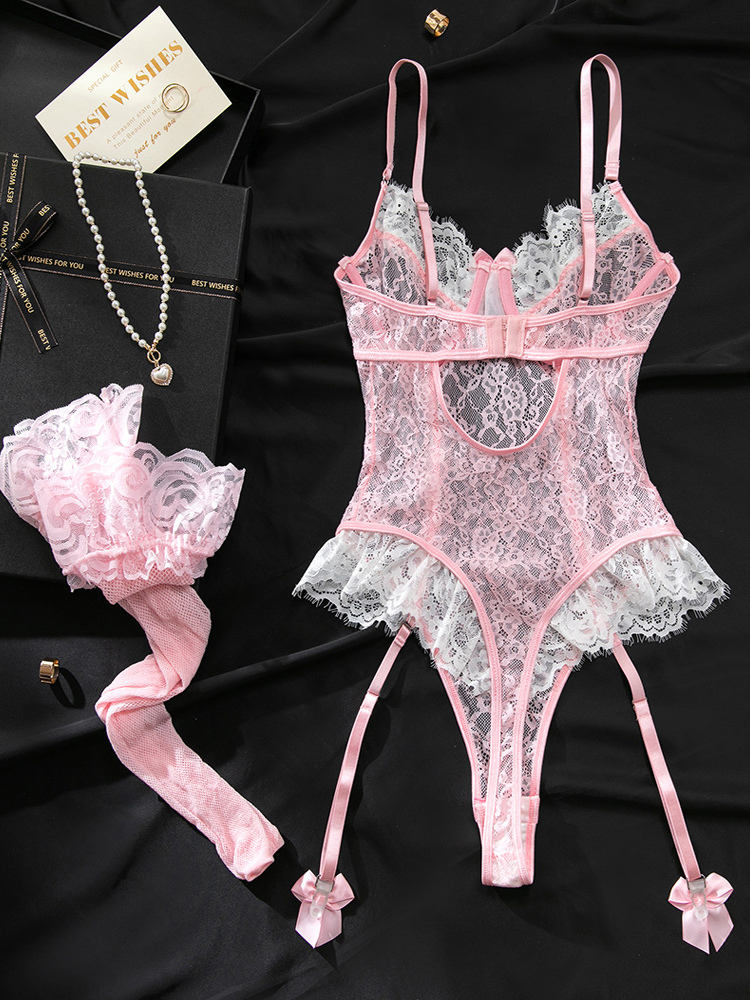 ランジェリー ツートン レース バックレス ピンク カラーブロック セクシー テディ ストッキング付き